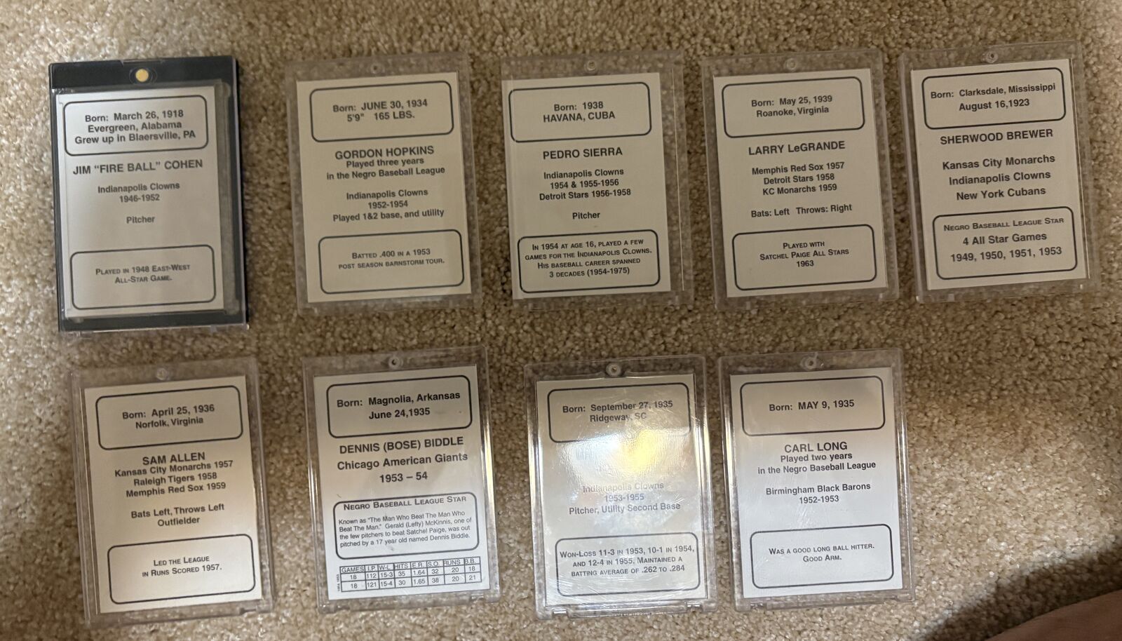 I purchased these cards around 1996 at Fort Bragg when three Negro League baseball players were raising money. These are not store-bought cards—they were made by the living players themselves, and all nine cards are signed by the players.