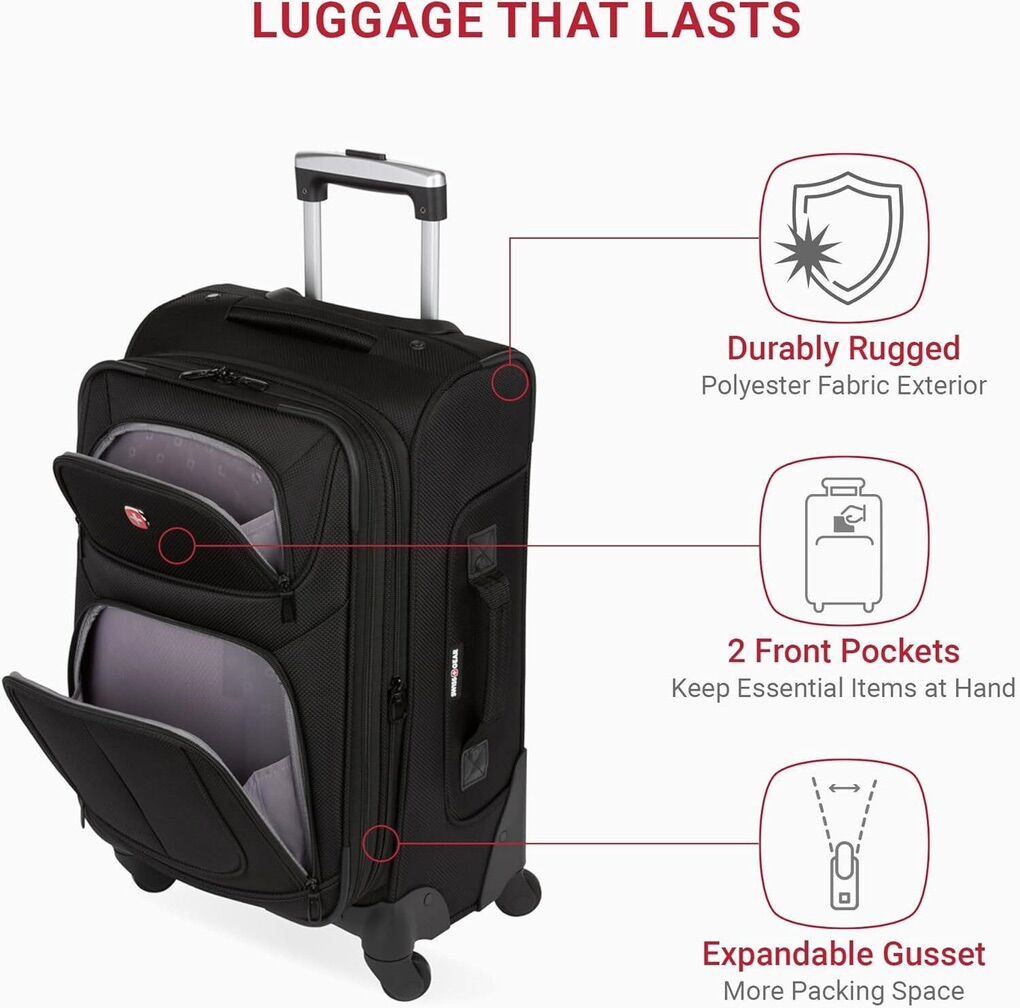 Perfect Carry-On for 1-3 Day Trips: Get through a crowded airport easily with this ergonomic, expandable, soft-sided carry-on luggage with an ample amount of storage and all the organizational aids that you need. Four 360-Degree Multi-Directional Spinner Wheels: Built with maximum maneuverability in mind, so you can navigate busy airports and small spaces with ease: top, side and bottom handles make carrying your suitcase easy. Durable Design, Effortless Organization: Made from a durable, scuff-resistant polyester fabric with fully lined interior, this expandable travel case gives you ample packing space and features adjustable tie-down straps for securing garments in place. Often Imitated But Never Equaled: Every SwissGear product is the culmination of our 125-year commitment to innovation, Swiss principles of design, and only the highest standards of quality