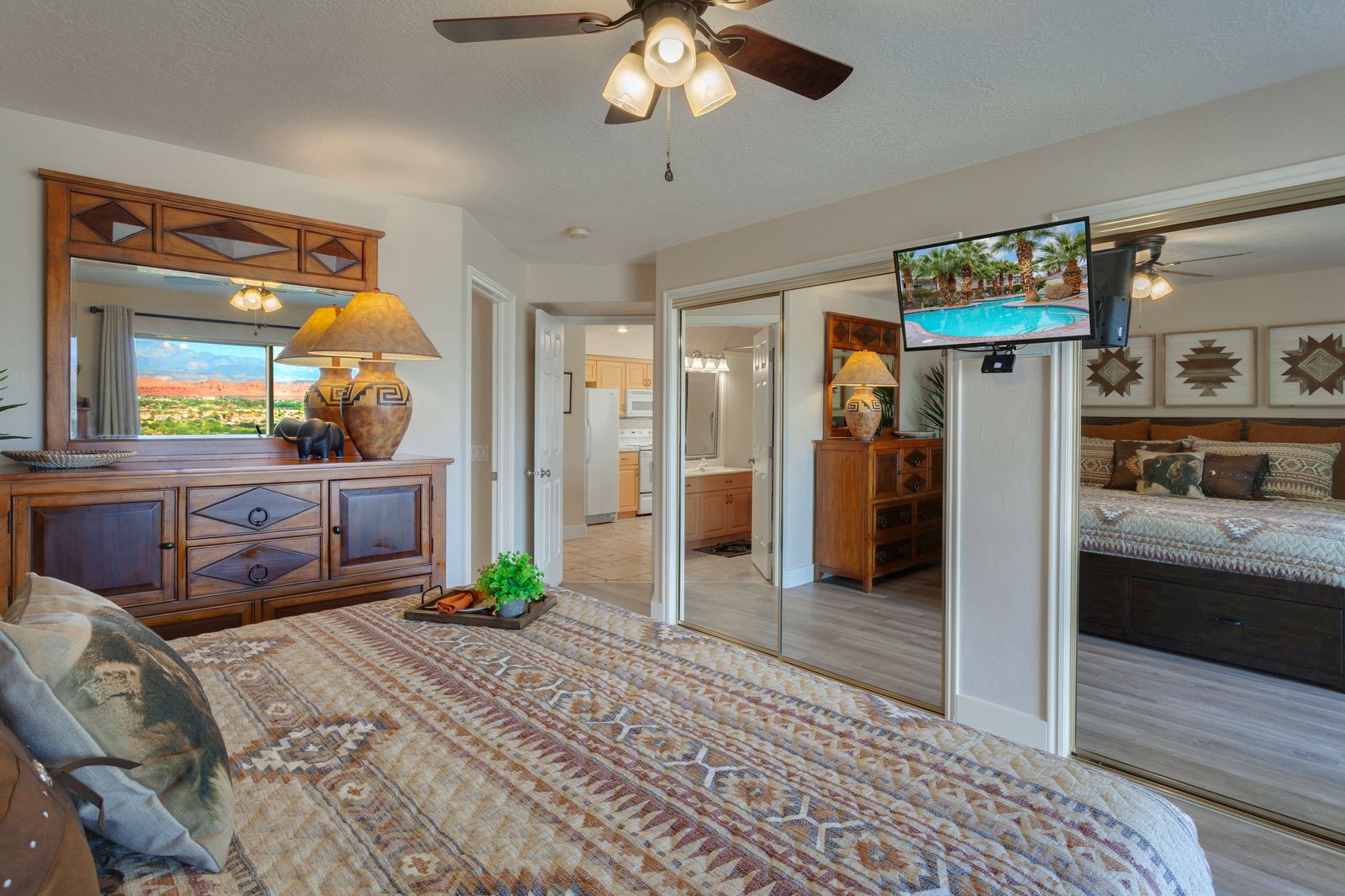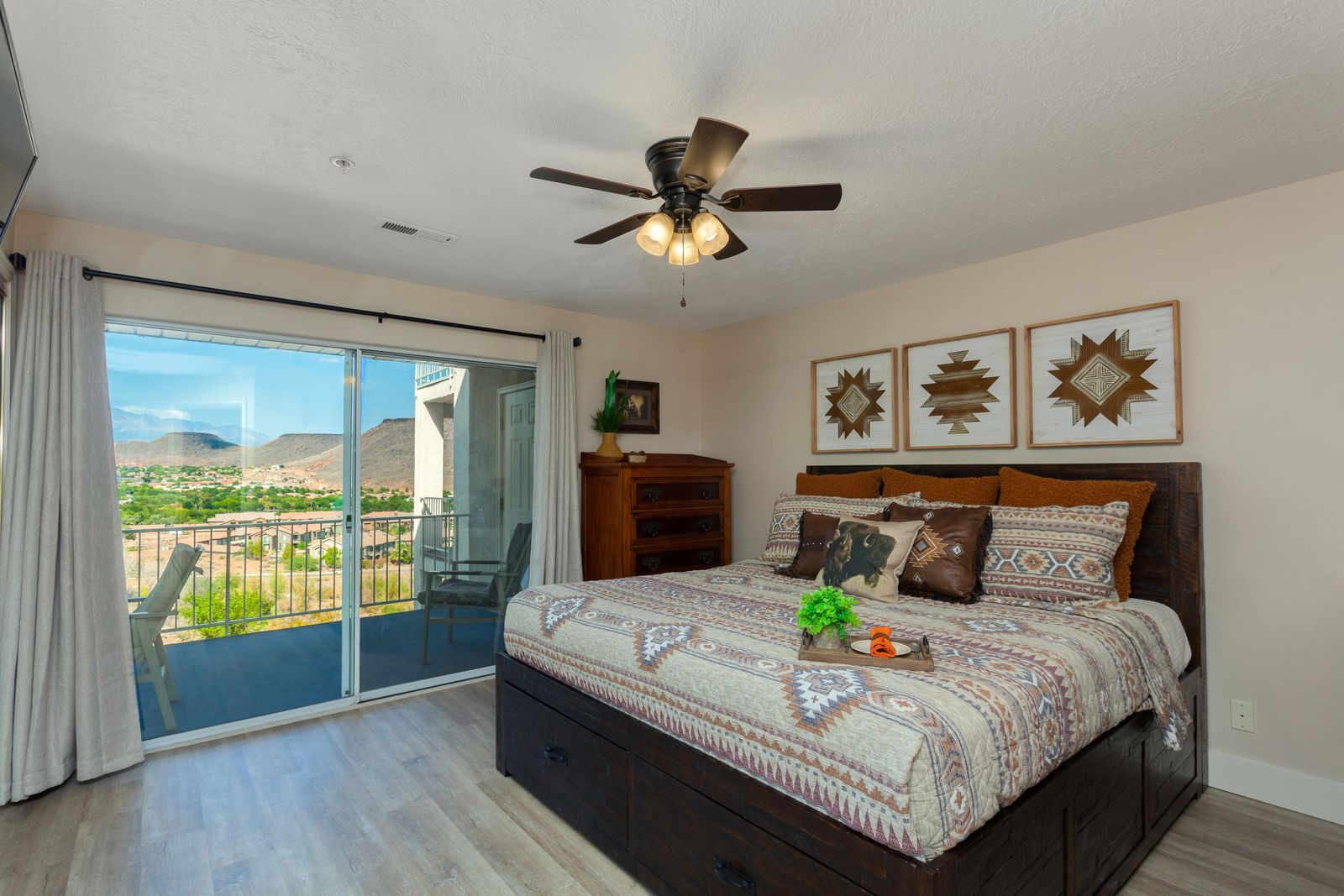 Bedroom 1: King Bed with a TV and Direct Balcony Access - Shared Bathroom