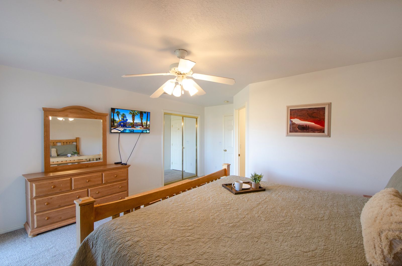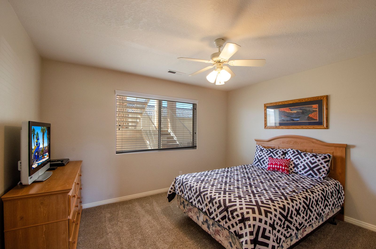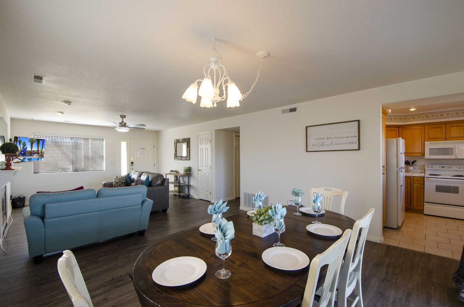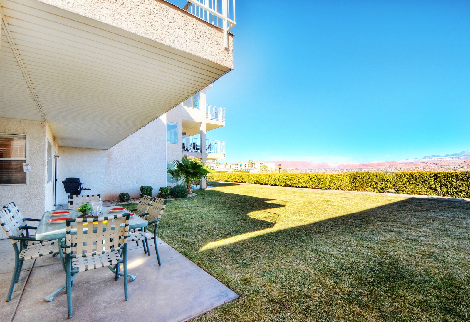 View-Topia is a 3 bedroom / 2 bath condo in the heart of Southern Utah. This newly renovated condo comfortably accommodates 10 guests. With new flooring in the living room, as well as updated light fixtures and a brand new kitchen table, this condo is sure to be a favorite vacations destination for years to come! Mornings will quickly become your favorite time of day at View-Topia, as you sip a hot cup of coffee and watch the desert sunrise up over the mountains on the patio. After a quiet morning alone, head out on a quick adventure! Multiple National and State parks are a short drive away, or Downtown St. George is always a great place to shop and have lunch. Come back to View-Topia for the afternoon and lounge poolside under the palms at one of the outdoor pools. The kids will love being able to swim, splash around in the splash pad, and play many outdoor games offered by Las Palmas; you might not get them to come back inside! Wrap up the day barbecuing on the back patio, enjoying each other’s company, and watching the sunset over the town. After a long day in the sun, make a bowl of popcorn and settle in for a good movie in the living room; with a Smart TV and DVD player, finding a movie everyone can agree on has never been easier. Whether you are lounging by the pool, exploring southern Utah, or taking in the extravagant views; you are sure to have the time of your life at View-Topia!