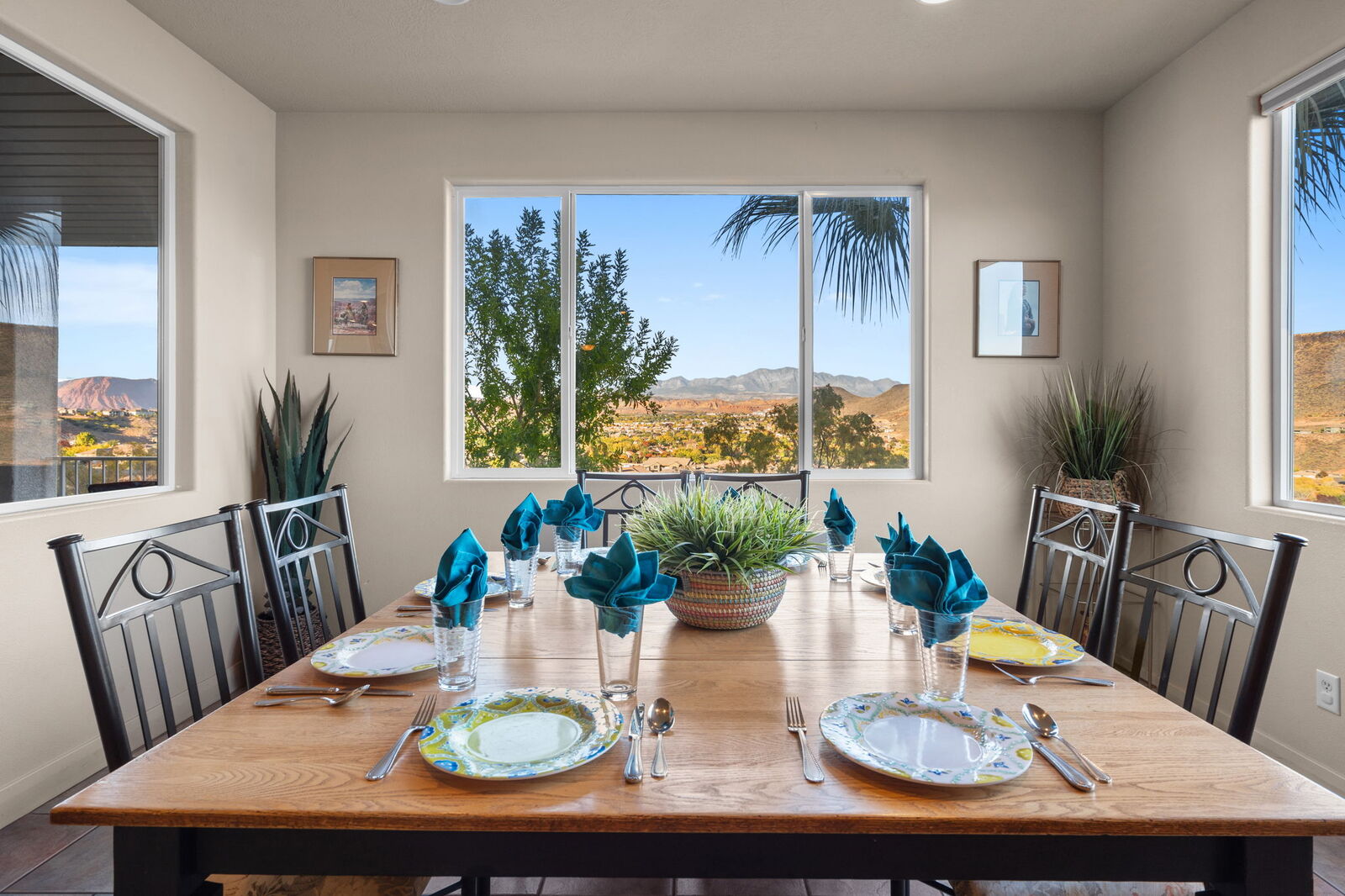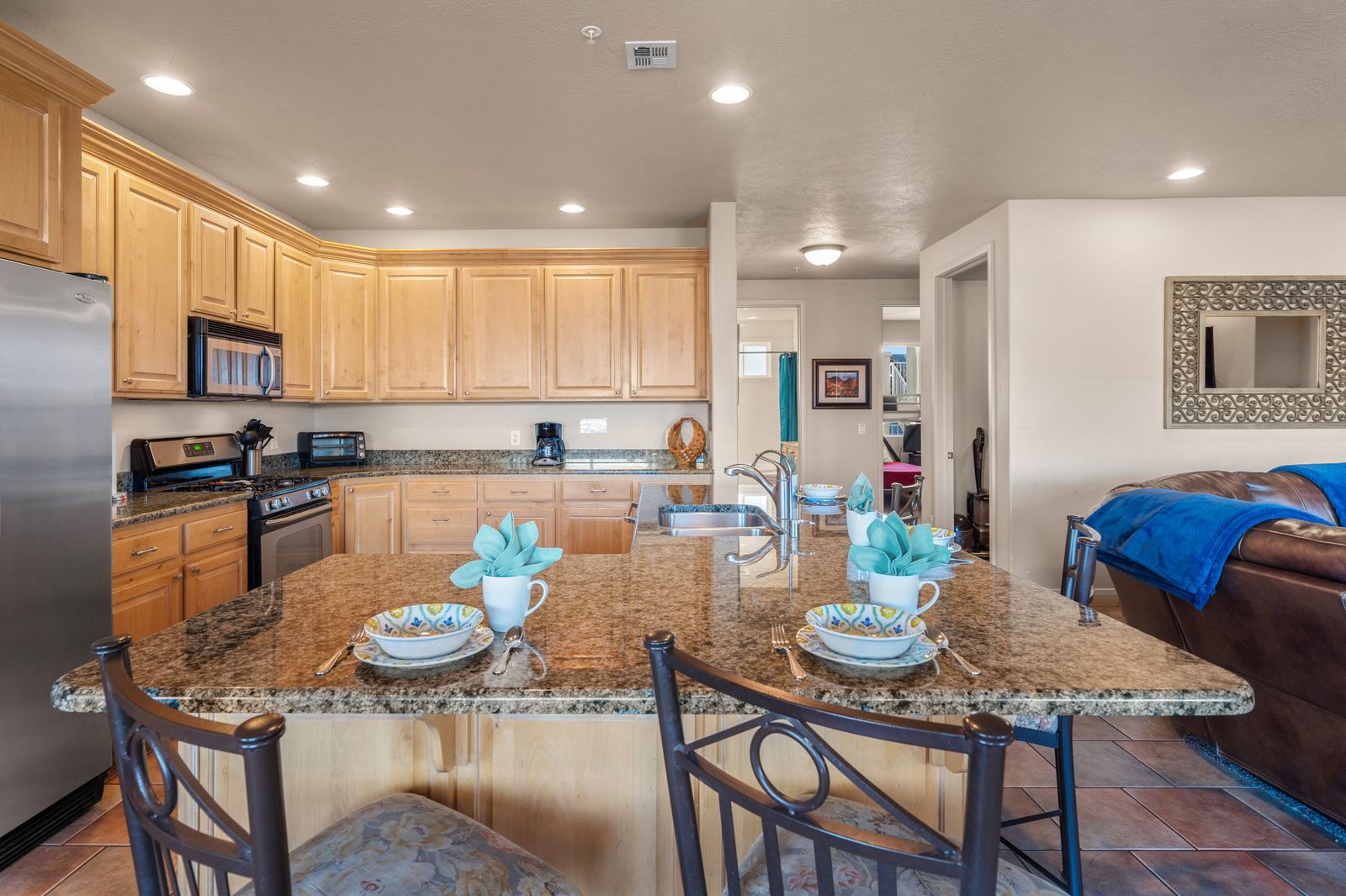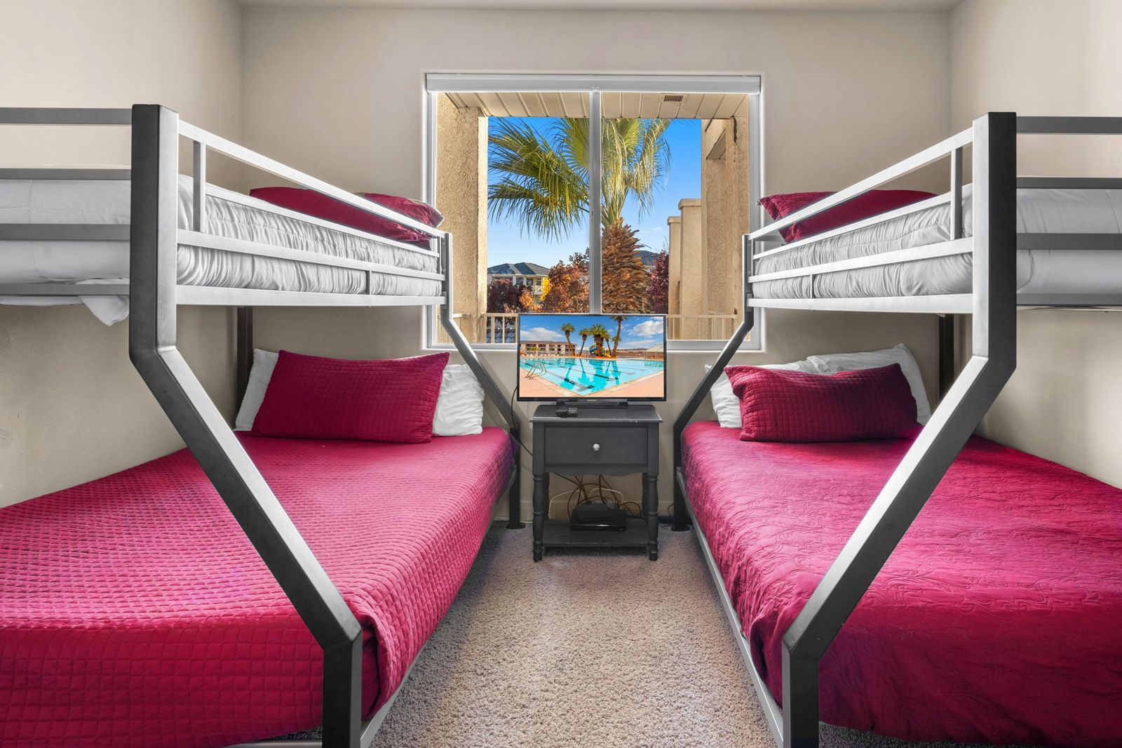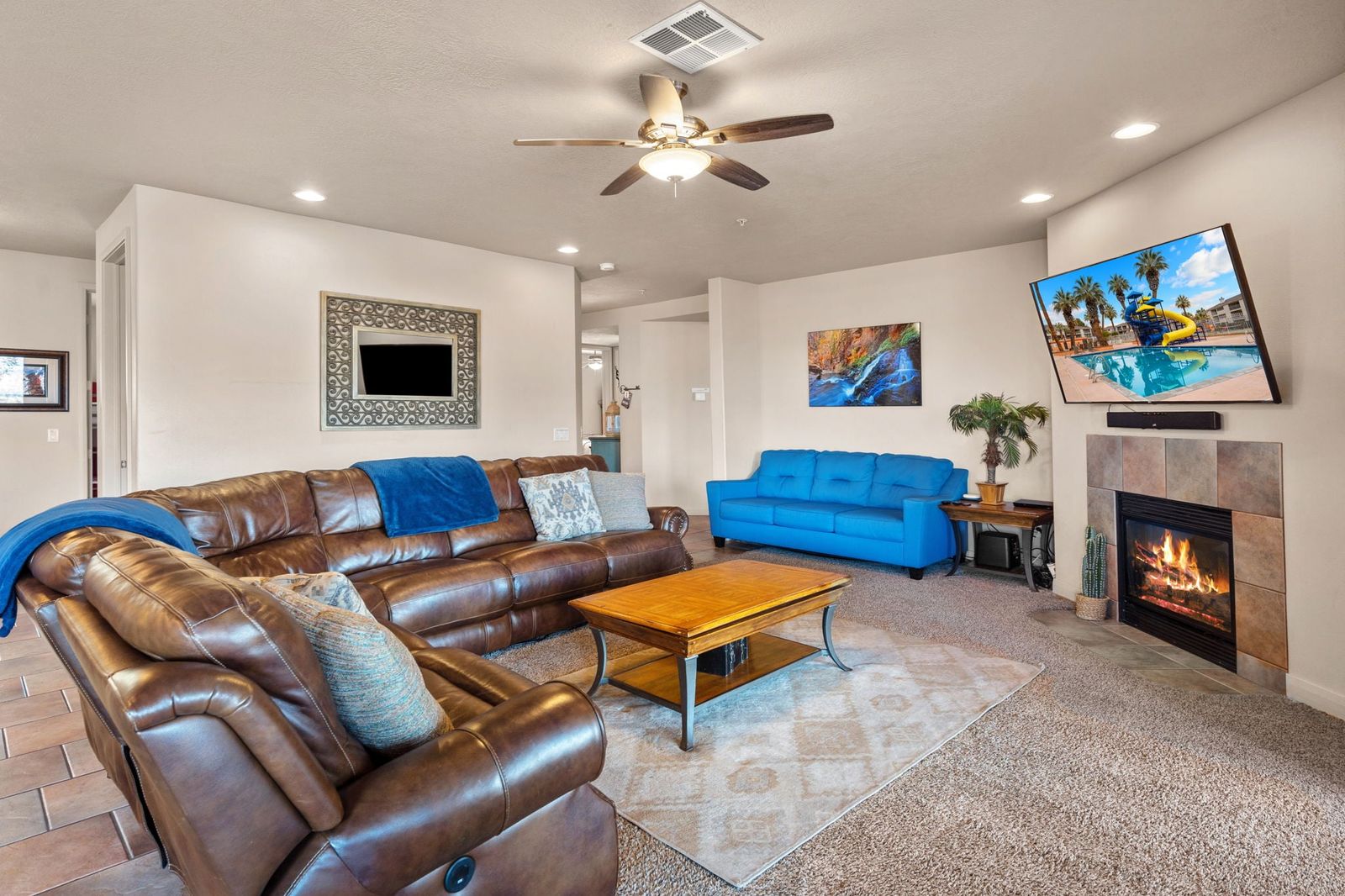 Red Rock View is the perfect condo for family and friend getaways! This 4 bedroom / 3 bath comfortably sleeps 12 guests; however, it can sleep up to 18 guests with the assistance of a king air mattress, 2 twin foam mats, and a queen hide-a-bed. Mornings will quickly become your favorite time of day at Red Rock View, as you sip a hot cup of coffee and watch the desert sun rise up over the mountains on the patio. After a quiet morning alone, head out on a quick adventure! Multiple National and State parks are a short drive away, or Downtown St. George is always a great place to shop and have lunch. Come back to Red Rock View for the afternoon and lounge poolside under the palms at one of the outdoor pools. The kids will love being able to swim, splash around in the splash pad, and play many outdoor games offered by Las Palmas; you might not get them to come back inside! Wrap up the day barbequing on the back patio, enjoying each other's company, and watching the sun set over town. After a long day in the sun, make a bowl of popcorn and settle in for good movie in the living room; with a Smart TV, finding a movie everyone can agree on has never been easier. Whether you are lounging by the pool, exploring southern Utah, or taking in the extravagant views; you will be making timeless memories staying at Red Rock View!