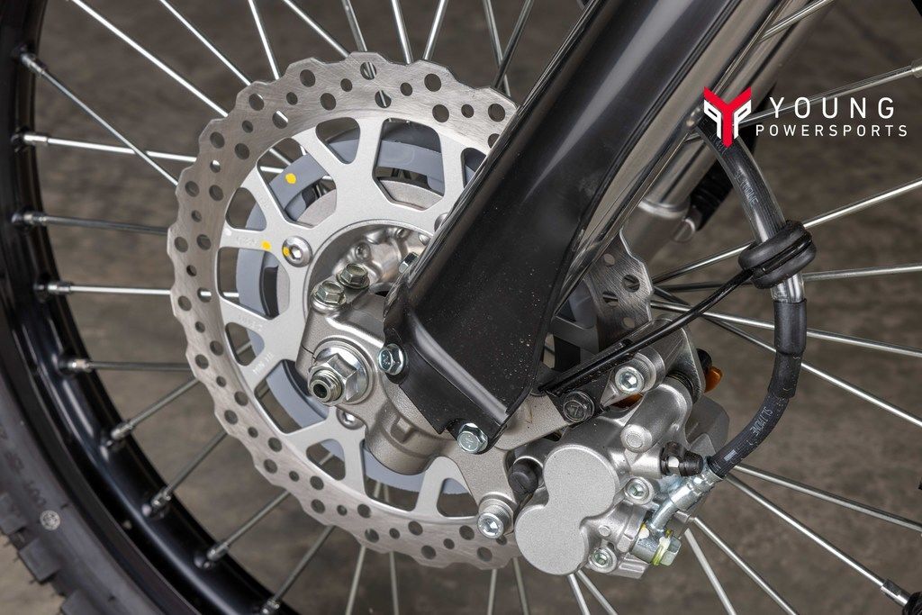 The KLX®300 highly versatile motorcycle exhibits agile maneuverability whether on- or off-road thanks to a slim, lightweight perimeter frame. The caster angle (26.7°) and short wheelbase contribute to quick handling, while the high rigidity of the frame ensures straight-line stability. Long-travel suspension is trail-tuned and offers 10 in of travel up front and 9.1 in in the rear. The 43mm inverted cartridge-style front fork has adjustable compression damping to optimize fork performance for conditions and personal preference. The Uni-Trak® rear suspension offers bump absorption, compression and rebound damping adjustability, and fully adjustable preload, allowing riders to tailor shock settings to personal preference. Substantial braking power comes from a powerful 250mm petal disc and twin-piston caliper up front and a 240mm petal disc and single-piston caliper in the rear. Strong dual-sport performance is further enabled with a 21-in front wheel and 18-in rear wheel. Wheel rigidity contributes to light, smooth handling and offers great durability for off-road riding.