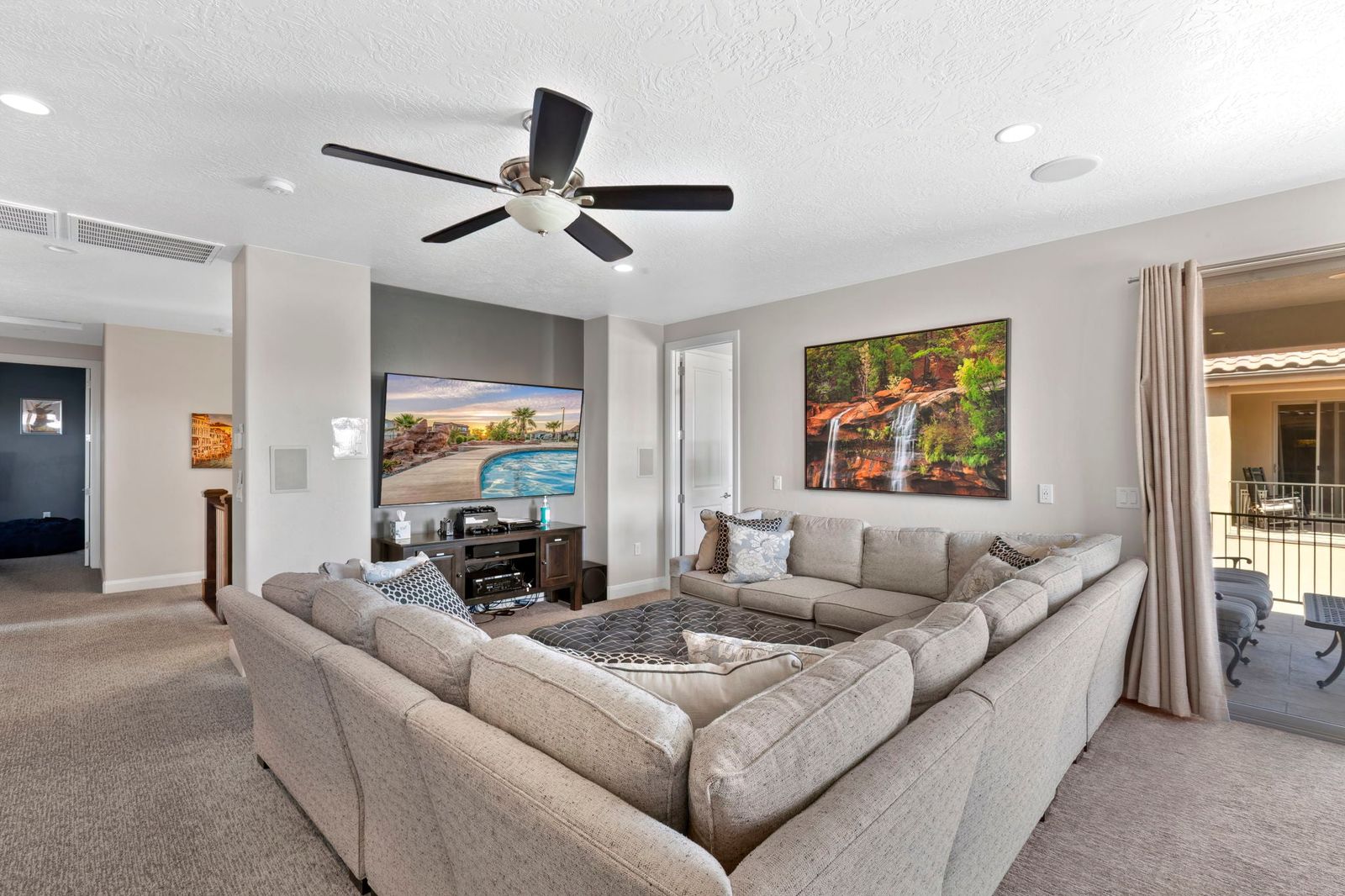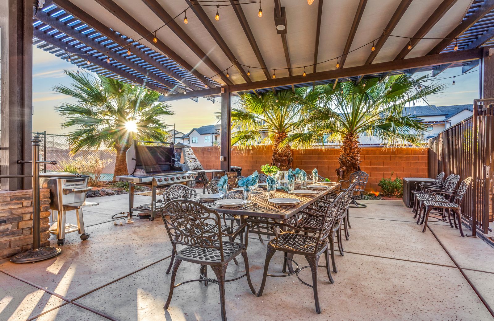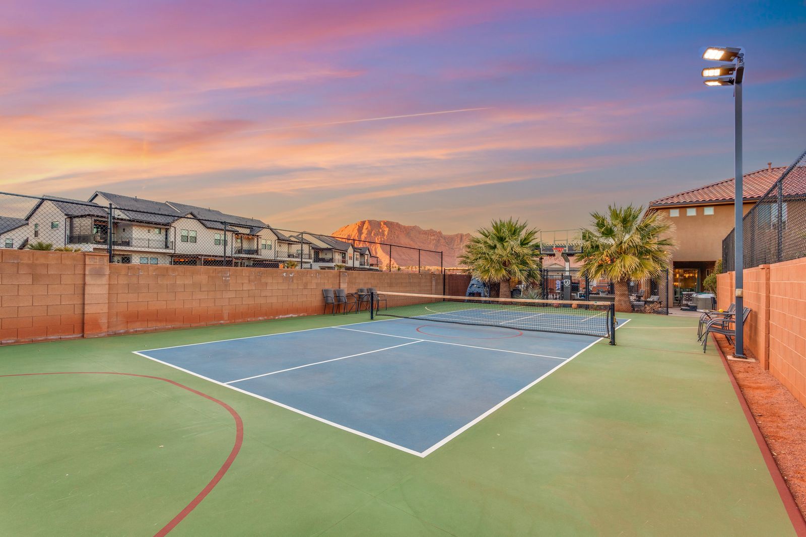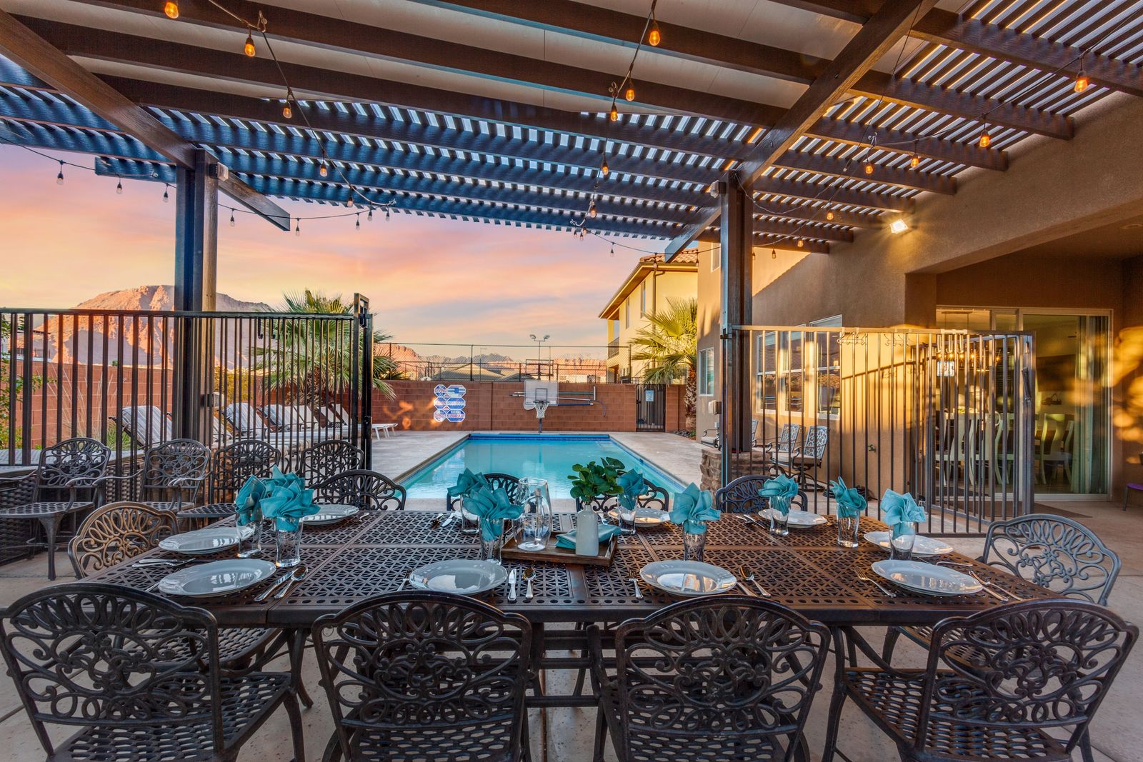The Resort is a beautiful 6 bedroom / 6 & 2 ½ bath home. The Resort can comfortably accommodate 20 guests or up to 26 guests with the assistance of 2 queen air mattresses and 2 twin foam mats. This extraordinary home was designed with features to create memories that will last a lifetime. With many amenities, you will not need to leave The Resort to have the vacation of your dreams! Spend your days lounging next to the private pool or challenging each other to a game of pool basketball. Compete in basketball, pickleball, tennis, or hockey on the sports court; or pull out spike ball and corn hole from the garage for even more entertainment! The kids will love climbing all over the kid rock wall or playing in the kid toy room while you barbeque a delicious meal. Grab a bowl of popcorn and settle in for a movie night, with Smart TVs, Direct TV, and surround sound; movie nights have never been so enjoyable! If everyone cannot agree on a movie, no worries! There are two living rooms, both with Smart TVs, Direct TV, an Xbox 1, and surround sound; everyone will be able to enjoy a movie or game of their choice. Have a game tournament in the game room, with 3 TVs, 3 Xbox 1’s, Super Nintendo, Atari game System, and Direct TV; game tournaments or streaming a playoff game has never been easier! Take comfort in the privacy of your own room for some quiet time, each with its own Smart TV, it is easy to relax alone. Roast marshmallows around your private fire pit while the sun sets behind the desert mountains. After a long day, grab a cold drink and wind down in the private hot tub under the starry sky. No matter how you spend your time, The Resort will have you creating timeless memories!