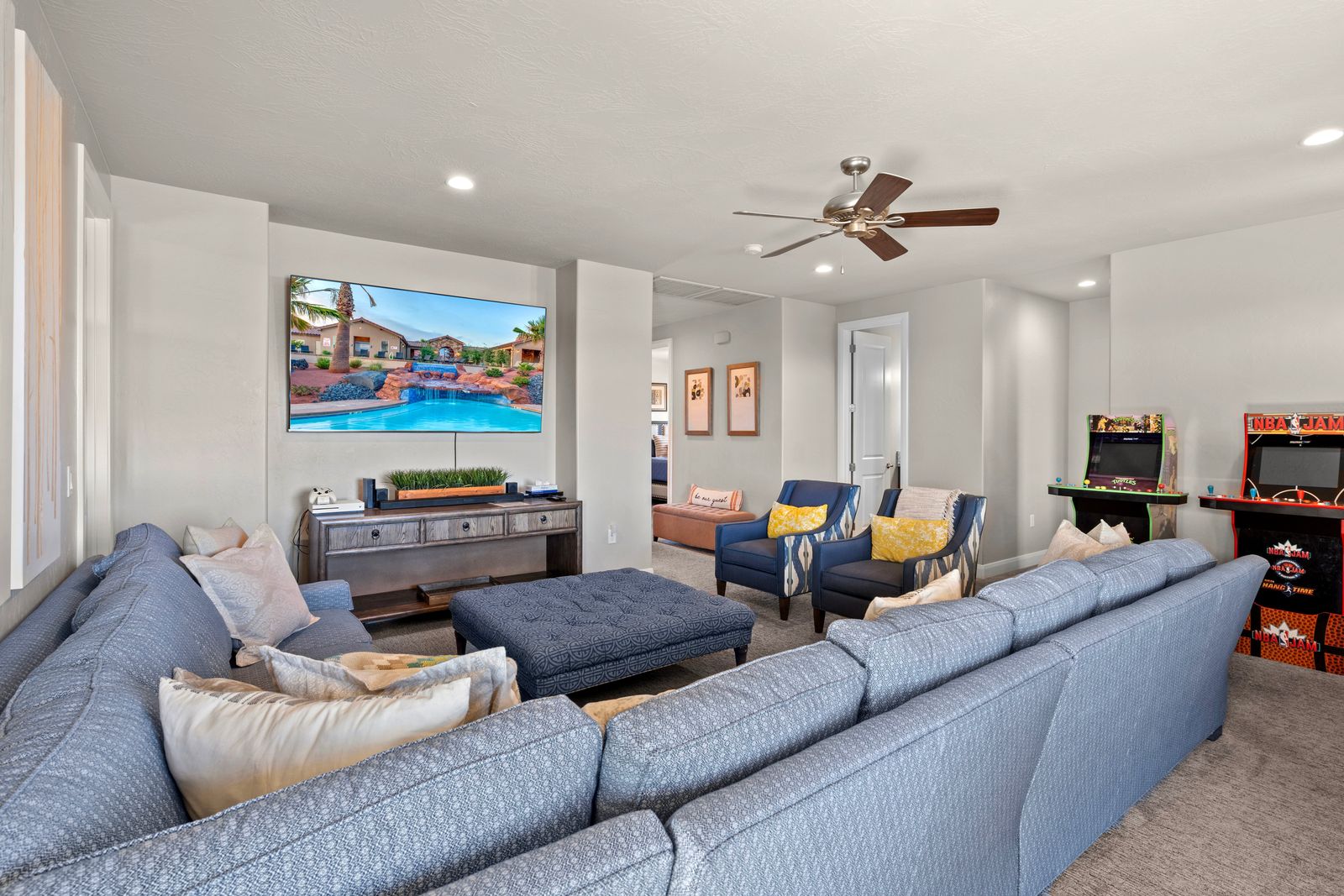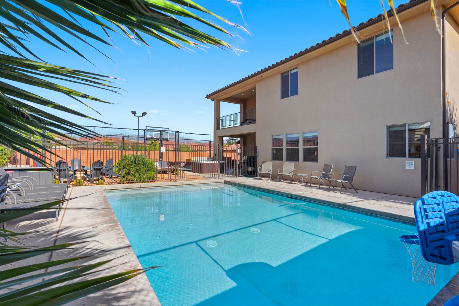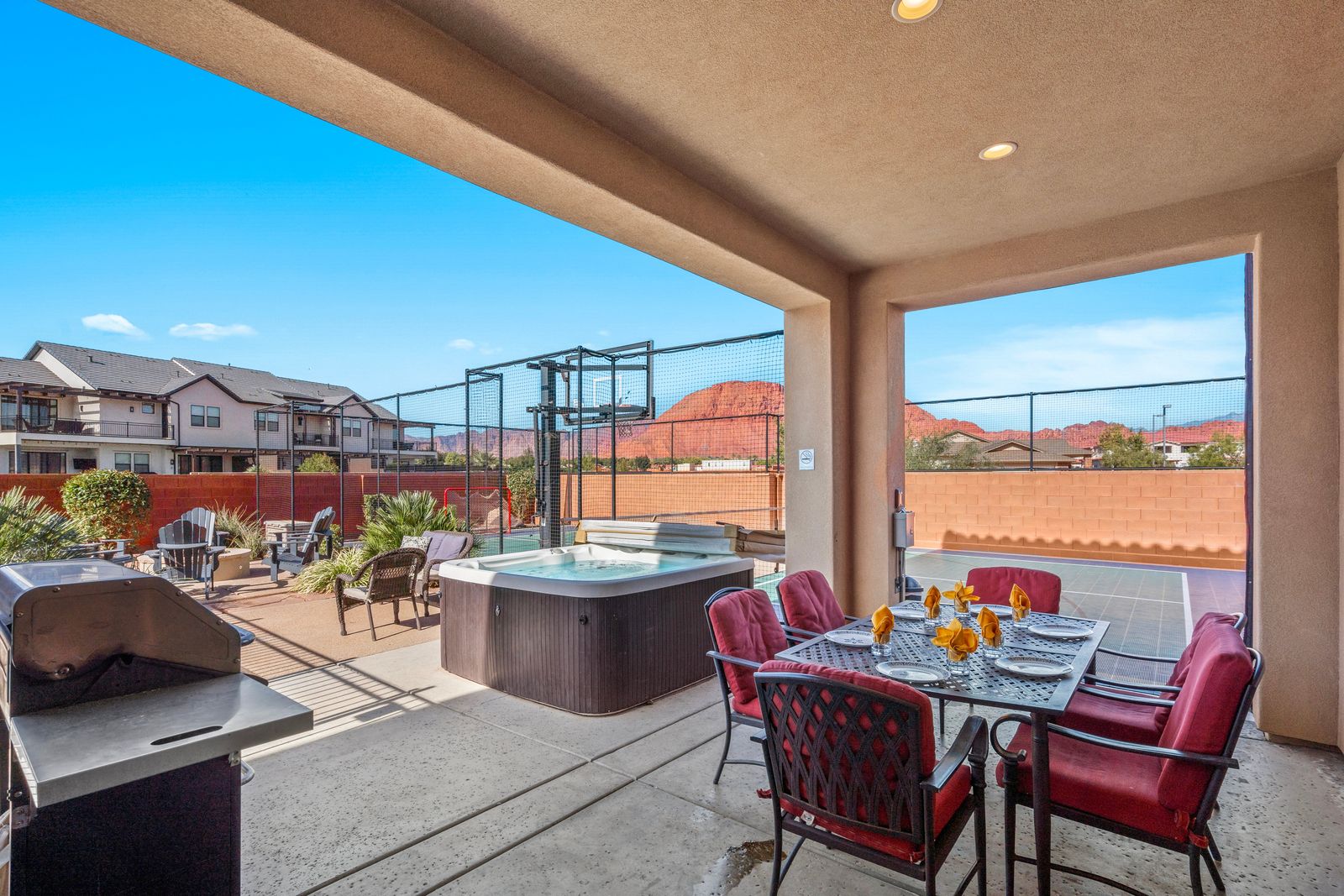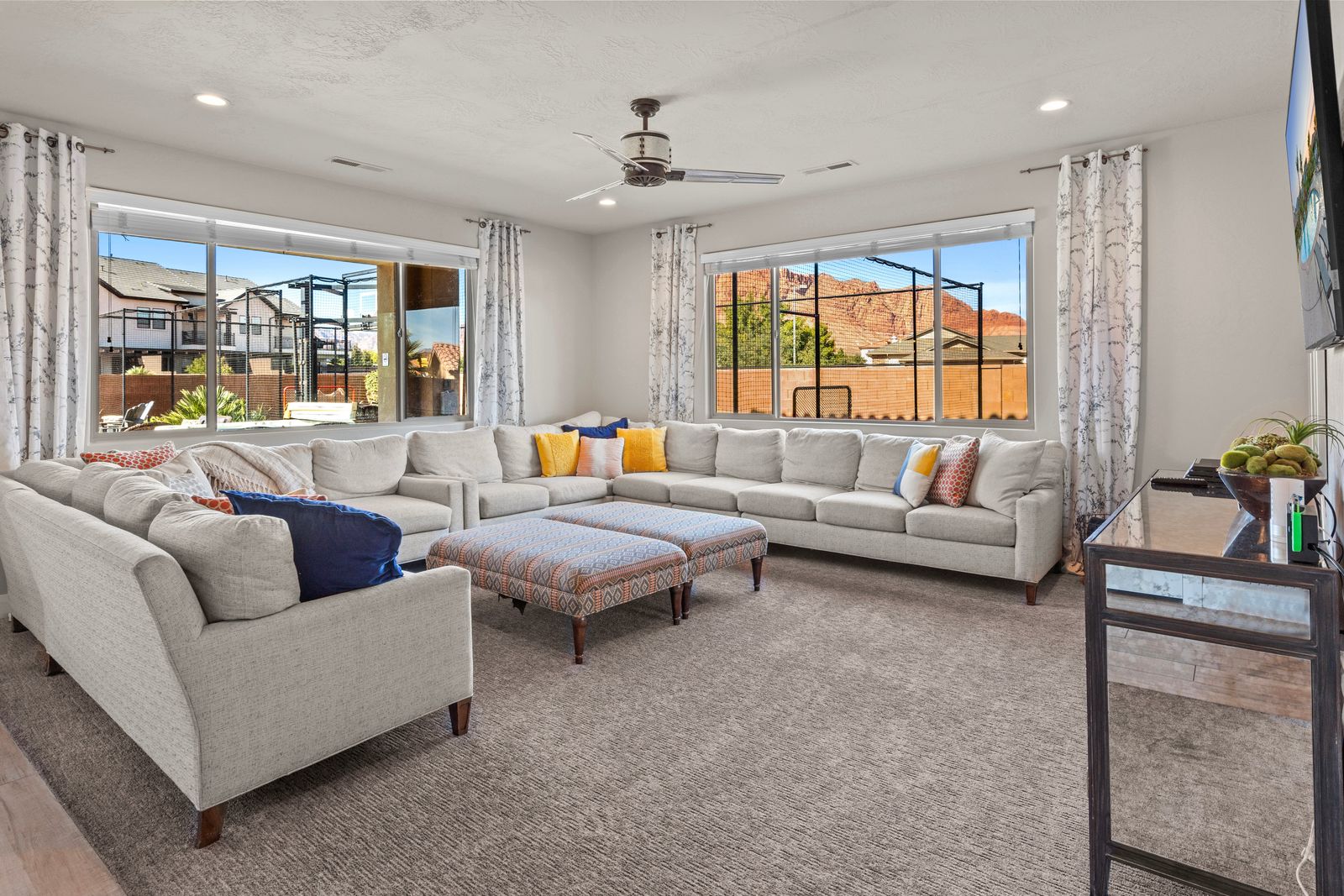 Welcome to our spectacular vacation rental in the heart of southern Utah, where your dream getaway becomes a reality! After exploring the breathtaking wonders of the region, unwind in your very own Private Pool & Hot Tub. Our property offers an outdoor oasis for all ages. The entire family can enjoy an expansive 18' x 28' private fenced pool and a separate splash pad. Sports enthusiasts will appreciate our private Sports Court®, equipped for pickleball, basketball, volleyball, jungle gym and various other court games to keep everyone active and entertained. Entertainment options are boundless here. Dive into a world of fun with a Pac-Man arcade game featuring an impressive selection of 160 games. For tech enthusiasts, we have three types of game consoles, including two Xbox Ones connected to two 4K TVs, a PlayStation connected to a 72" 4K TV, and a Nintendo Switch connected to an astonishing 82" 4K TV. With 1G internet service, seamless streaming is guaranteed on our six TVs, making it perfect for accommodating multiple guests enjoying their favorite shows and videos.