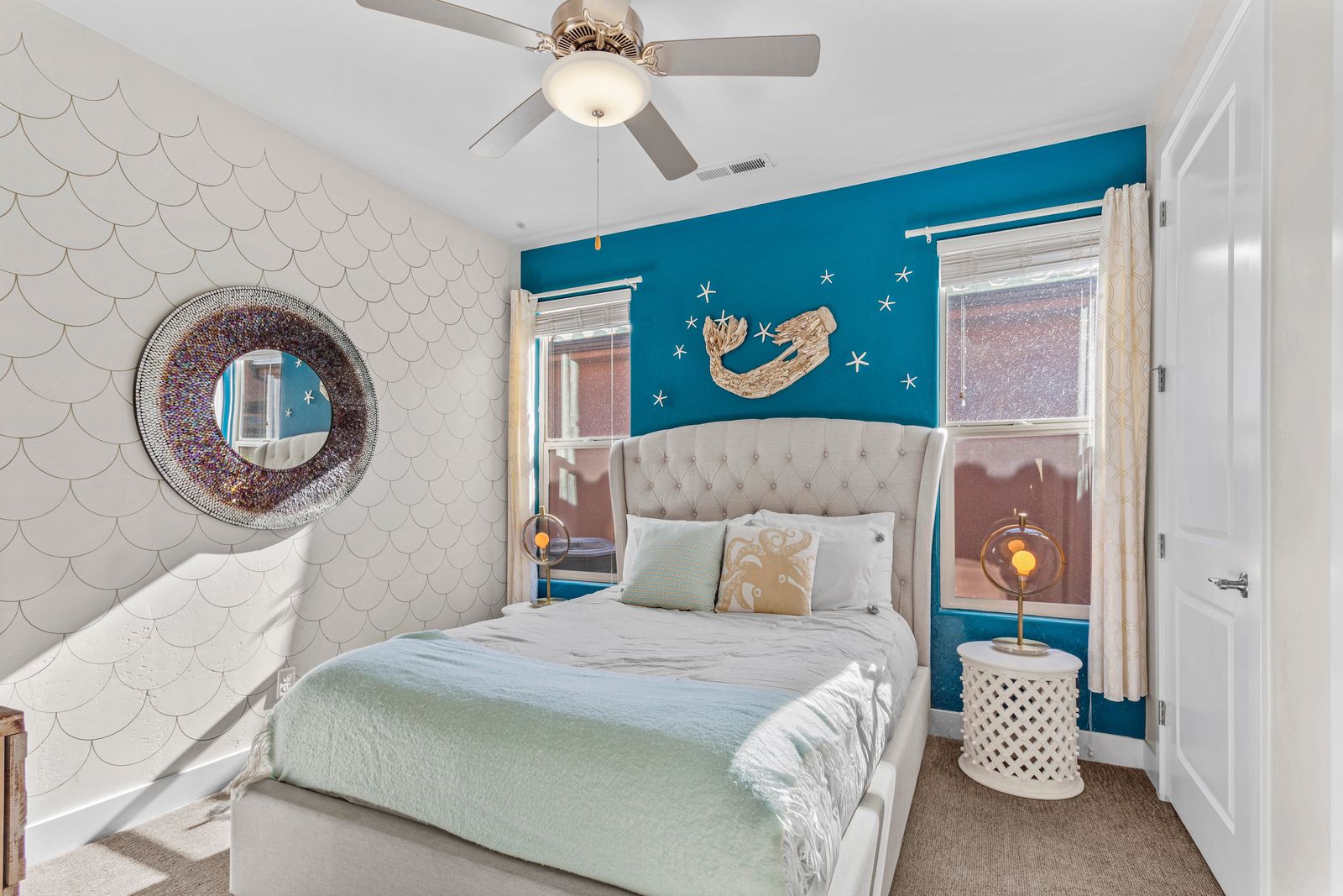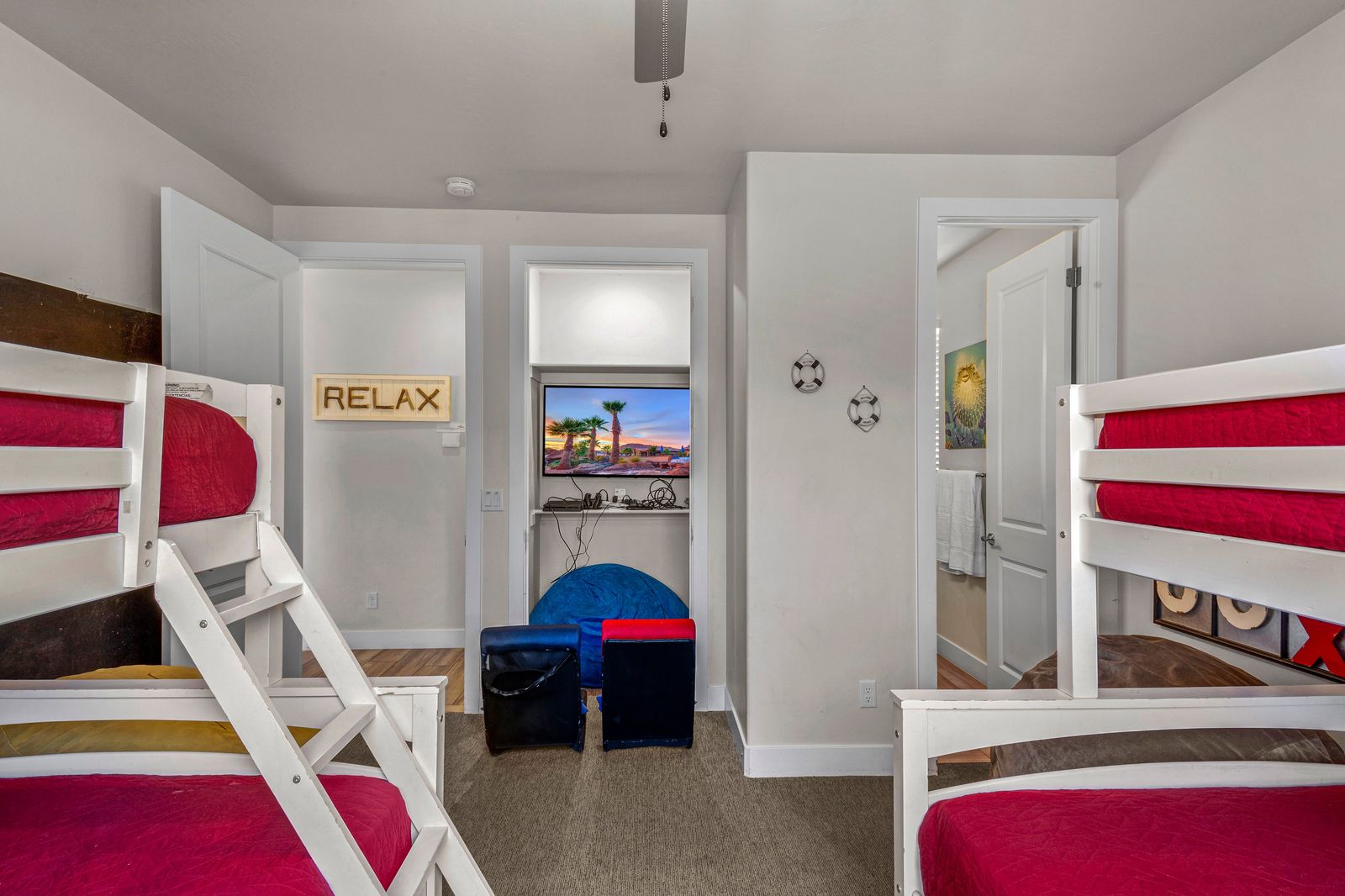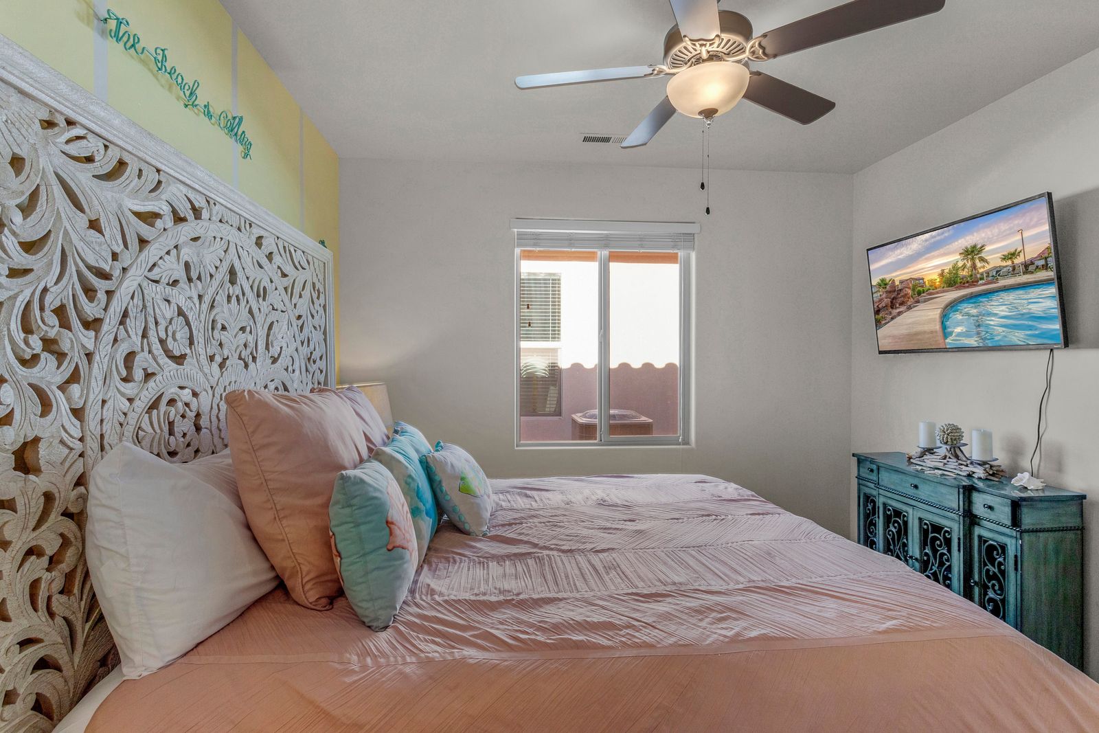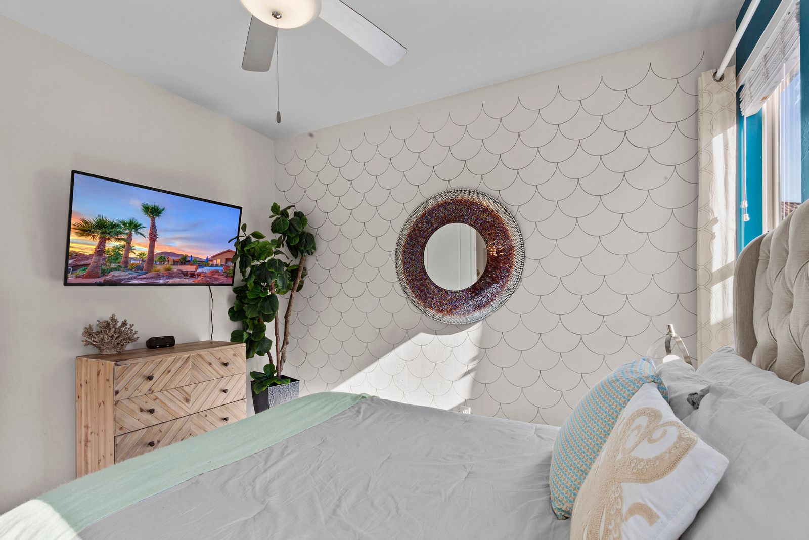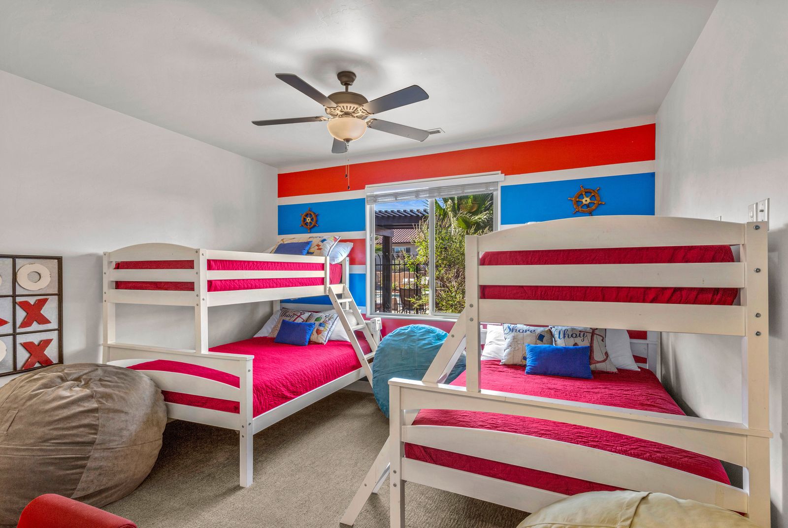 The Bahama Beach Club is a beautiful 5 bedroom / 5 bath home that comfortably sleeps 14 guests or up to 18 guests with the assistance of 2 queen air mattresses. With a different theme in every room, you will not know which room to choose! The Sailor Suite comes with built in reading lights for the late-night book worms, and the ultimate gamers closet stocked with an Insignia Roku TV, a PS4, and plenty of board games. The Mermaid Suite comes with an Insignia Roku TV and a mattress so comfortable it would send King Triton off to the sweetest of dreams. The Seahorse Suite comes with an Insignia Roku TV and two charging stations. The Retro Beach Suite will have you traveling back in time and comes with an Insignia Roku TV. Anchors away in the Sailboat Suite with an Insignia Roku TV. Barbeque steaks on the back patio under the setting desert sun. Cozy up in the giant bamboo lounge chairs in your own tropical beach oasis while having a movie night with the whole family, play to win in your own ping pong tournament, and laugh the day away while playing one of many fun and exciting family games! Regardless of what you do, you will have the absolute best vacation at The Bahama Beach Club!