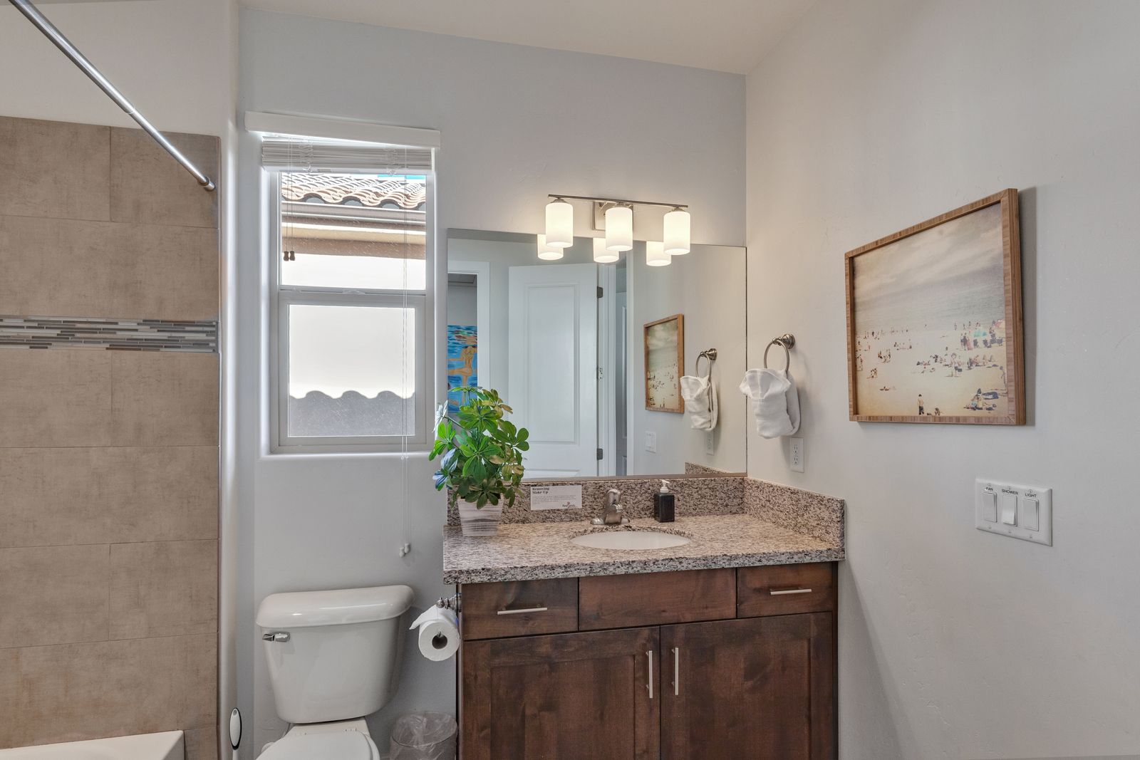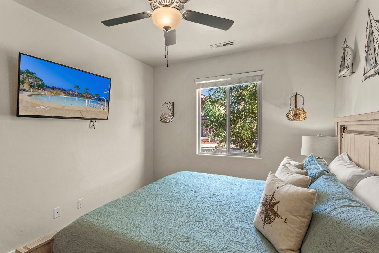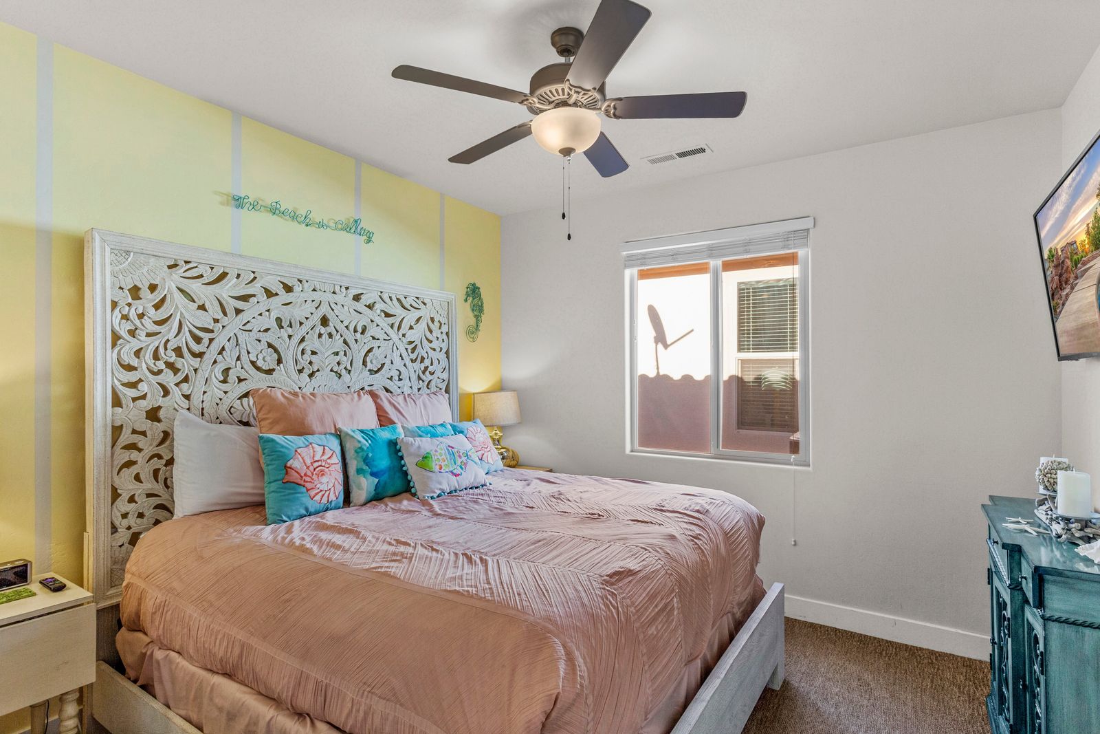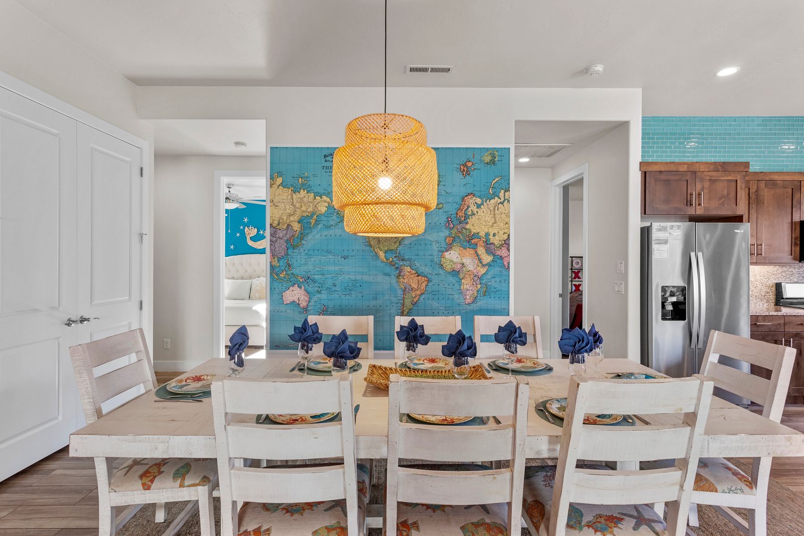 The Bahama Beach Club is a beautiful 5 bedroom / 5 bath home that comfortably sleeps 14 guests or up to 18 guests with the assistance of 2 queen air mattresses. With a different theme in every room, you will not know which room to choose! The Sailor Suite comes with built in reading lights for the late-night book worms, and the ultimate gamers closet stocked with an Insignia Roku TV, a PS4, and plenty of board games. The Mermaid Suite comes with an Insignia Roku TV and a mattress so comfortable it would send King Triton off to the sweetest of dreams. The Seahorse Suite comes with an Insignia Roku TV and two charging stations. The Retro Beach Suite will have you traveling back in time and comes with an Insignia Roku TV. Anchors away in the Sailboat Suite with an Insignia Roku TV. Barbeque steaks on the back patio under the setting desert sun. Cozy up in the giant bamboo lounge chairs in your own tropical beach oasis while having a movie night with the whole family, play to win in your own ping pong tournament, and laugh the day away while playing one of many fun and exciting family games! Regardless of what you do, you will have the absolute best vacation at The Bahama Beach Club!