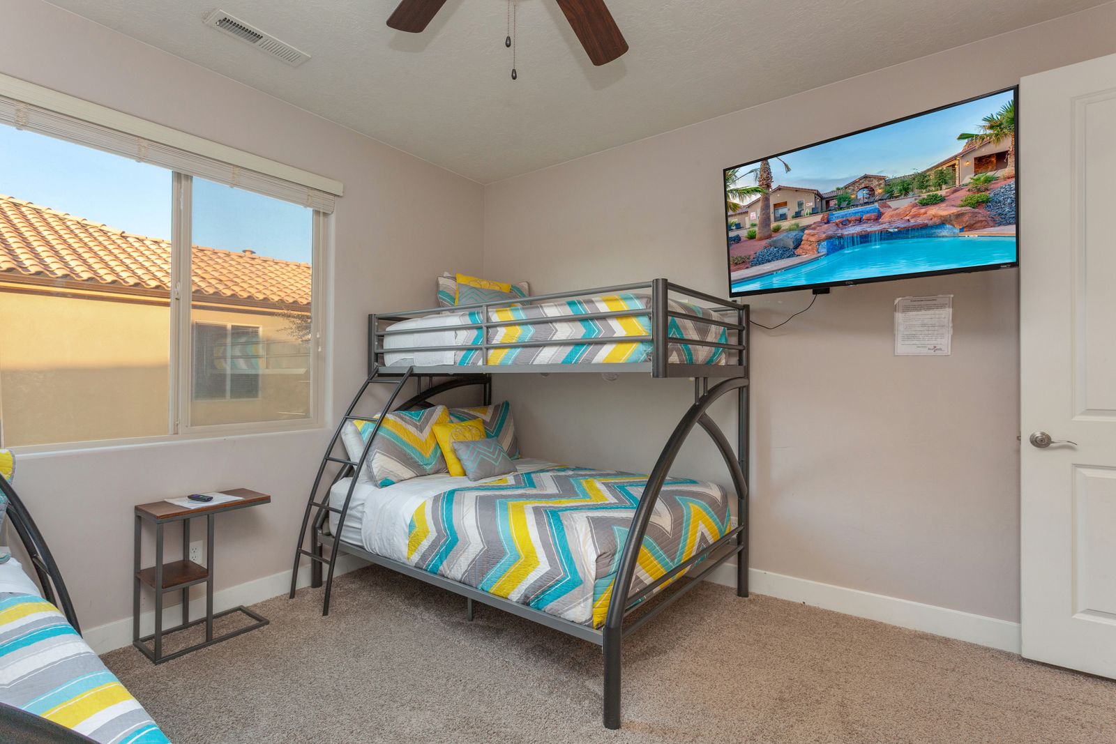 This beautiful 5 bedroom / 5 bath home comfortably sleeps 16 guests, or up to 18 guests with the assistance of a queen air mattress. Spend your days enjoying the surrounding beauty of Southern Utah and take a day trip to one of the National and State Parks or stay home and take advantage of Moon River Retreat’s amenities! Enjoy direct access to Paradise Village’s resort style pool and waterpark right out your back door, challenge each other to a ping pong tournament in the garage, or compete on the Nintendo switch in the living room! Cook a dinner that everyone will love in the expansive, fully equipped kitchen, or barbeque on the back patio. After a long day, wind down under the starry night sky in your private hot tub. No matter how you spend your days, Moon River Retreat is the best vacation home you could ask for!