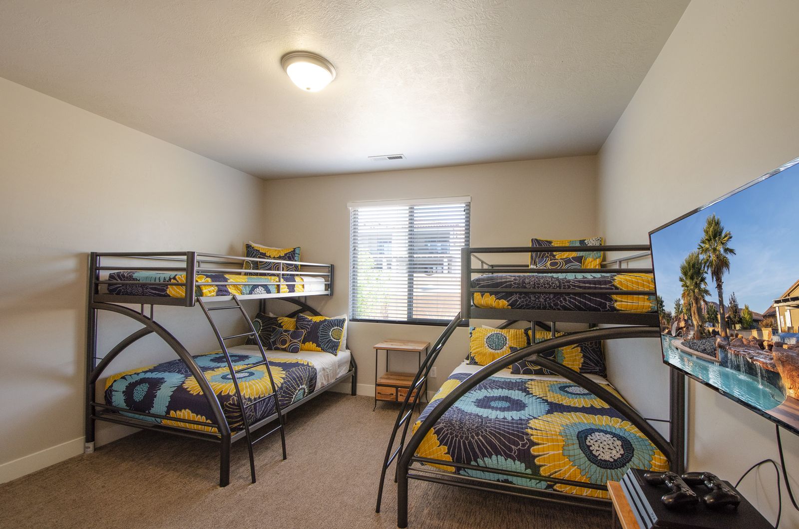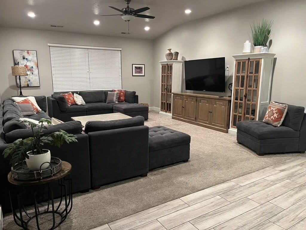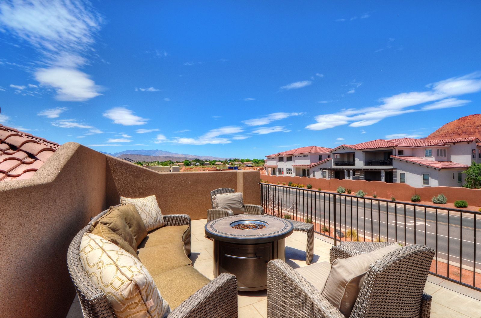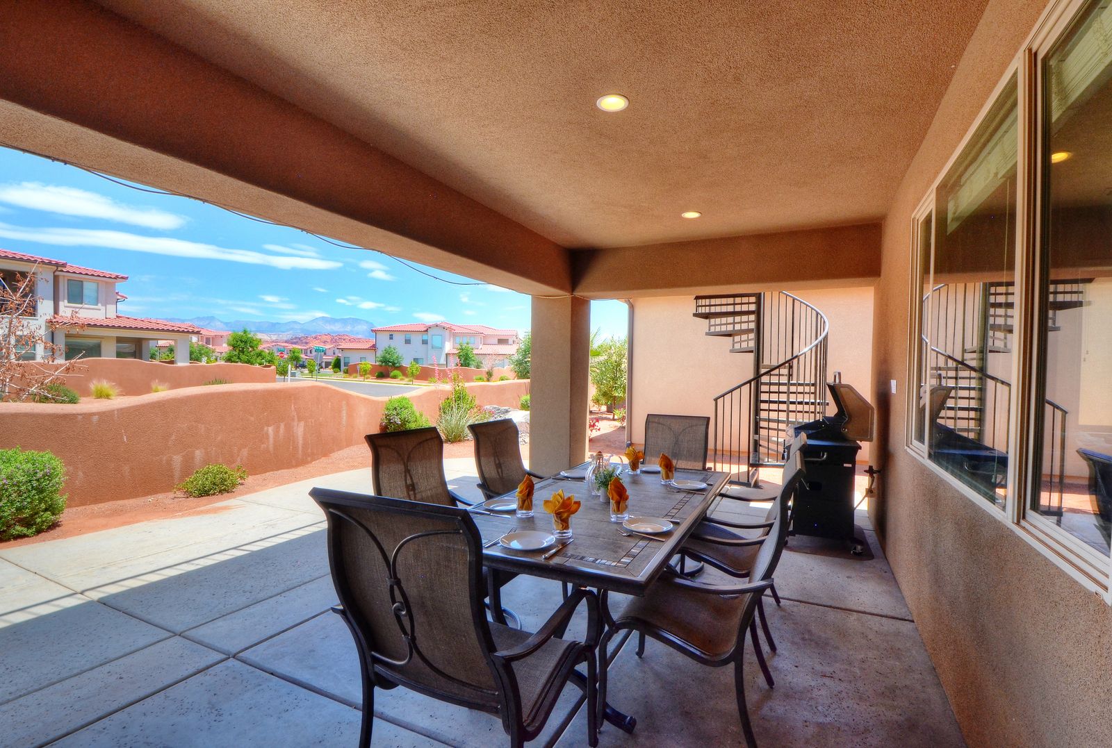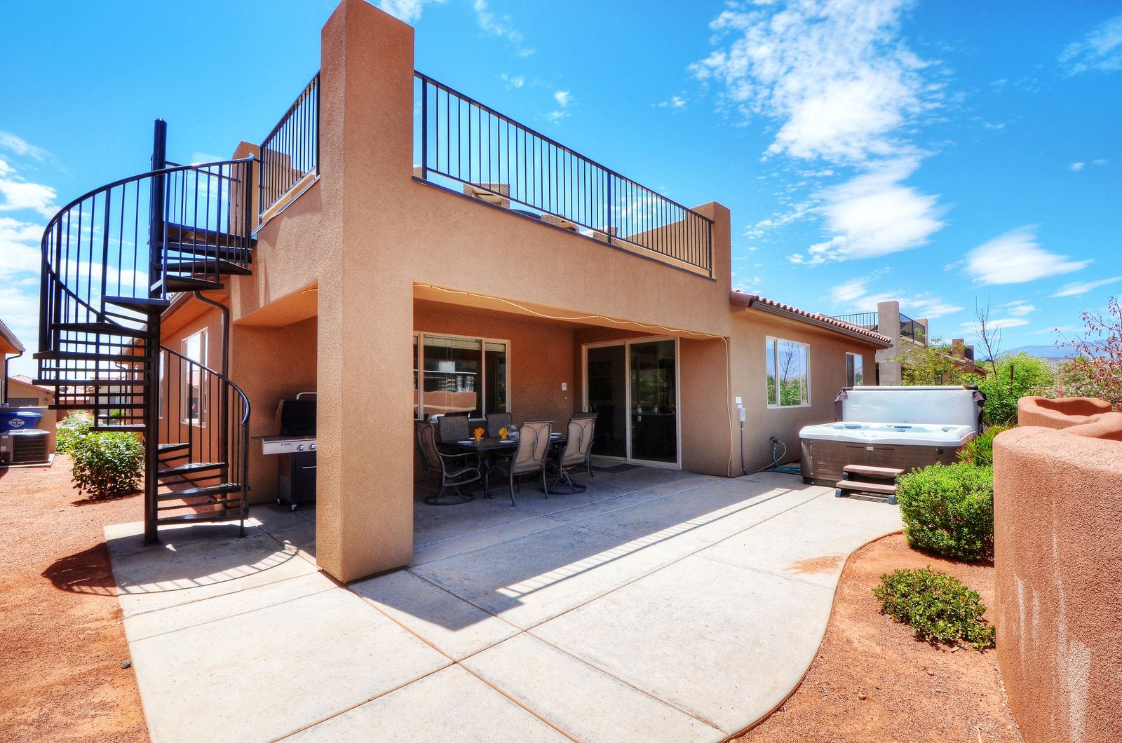 Mountain View Retreat is a beautiful 5 bedrooms / 5 bath that can comfortably accommodate 14 guests or up to 16 guests with the assistance of a queen air mattress. The expansive fully equipped kitchen, grill, indoor & outdoor dining, and outdoor lounge areas make hosting family & friends a breeze. Spend your days lounging by Paradise Village’s resort-style pool, swimming at the waterpark, or challenging each other to ping pong and spike ball tournaments! Take advantage of the many bike paths right out your front door and explore southern Utah on the bikes provided. Host a game night playing one of the many board and card games provided or challenging each other to games on the PS4. Grab your roasting sticks and some marshmallows to head up to the balcony to watch the sunset over the desert mountains while making a delicious smore! At the end of a long day, relax your muscles in your private hot tub under the starry night sky. Take solace in the comfort of your own room, each with a Smart TV, finding some peace and quiet has never been easier! No matter how you spend your days, you are sure to find relaxation, comfort, and extravagant views while staying at Mountain View Retreat!