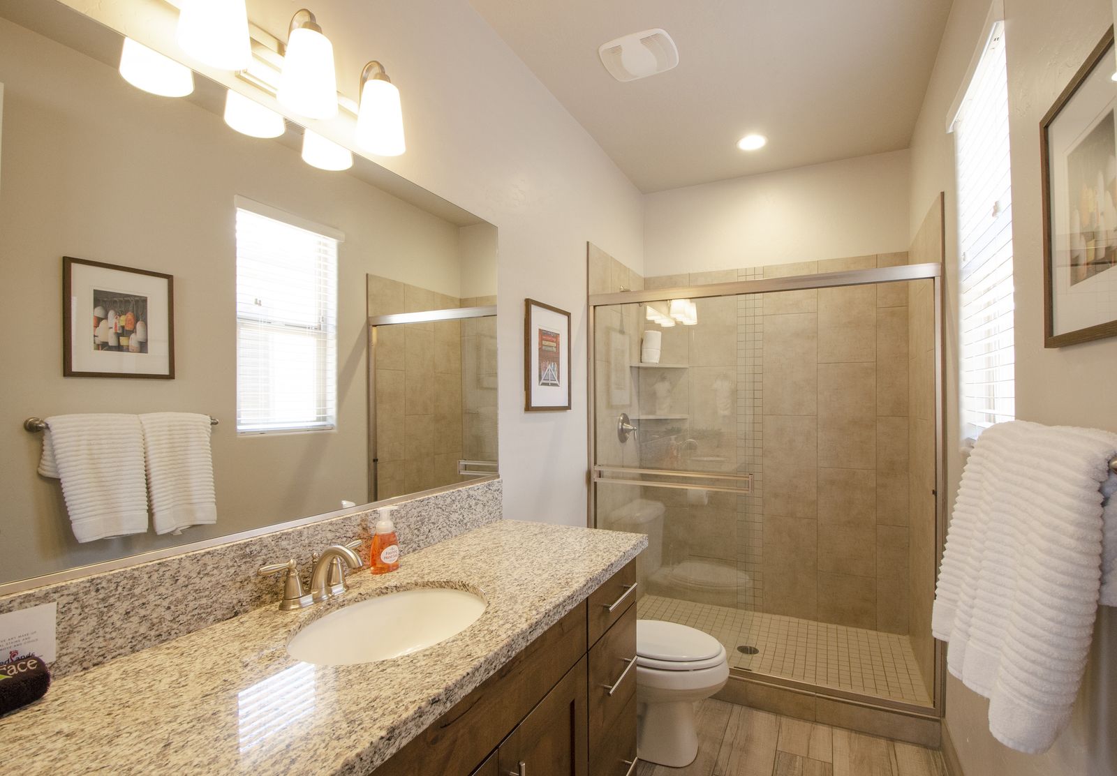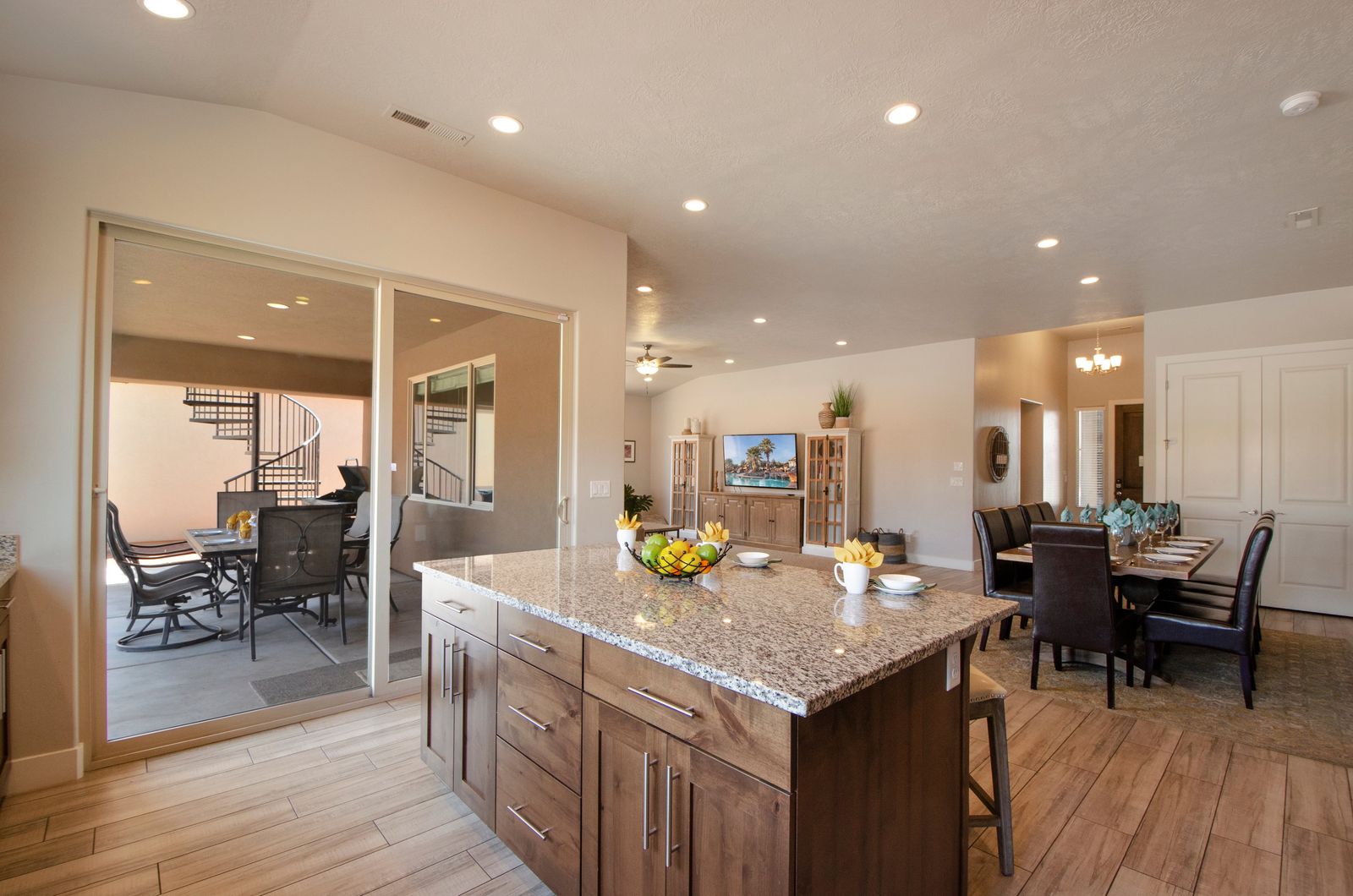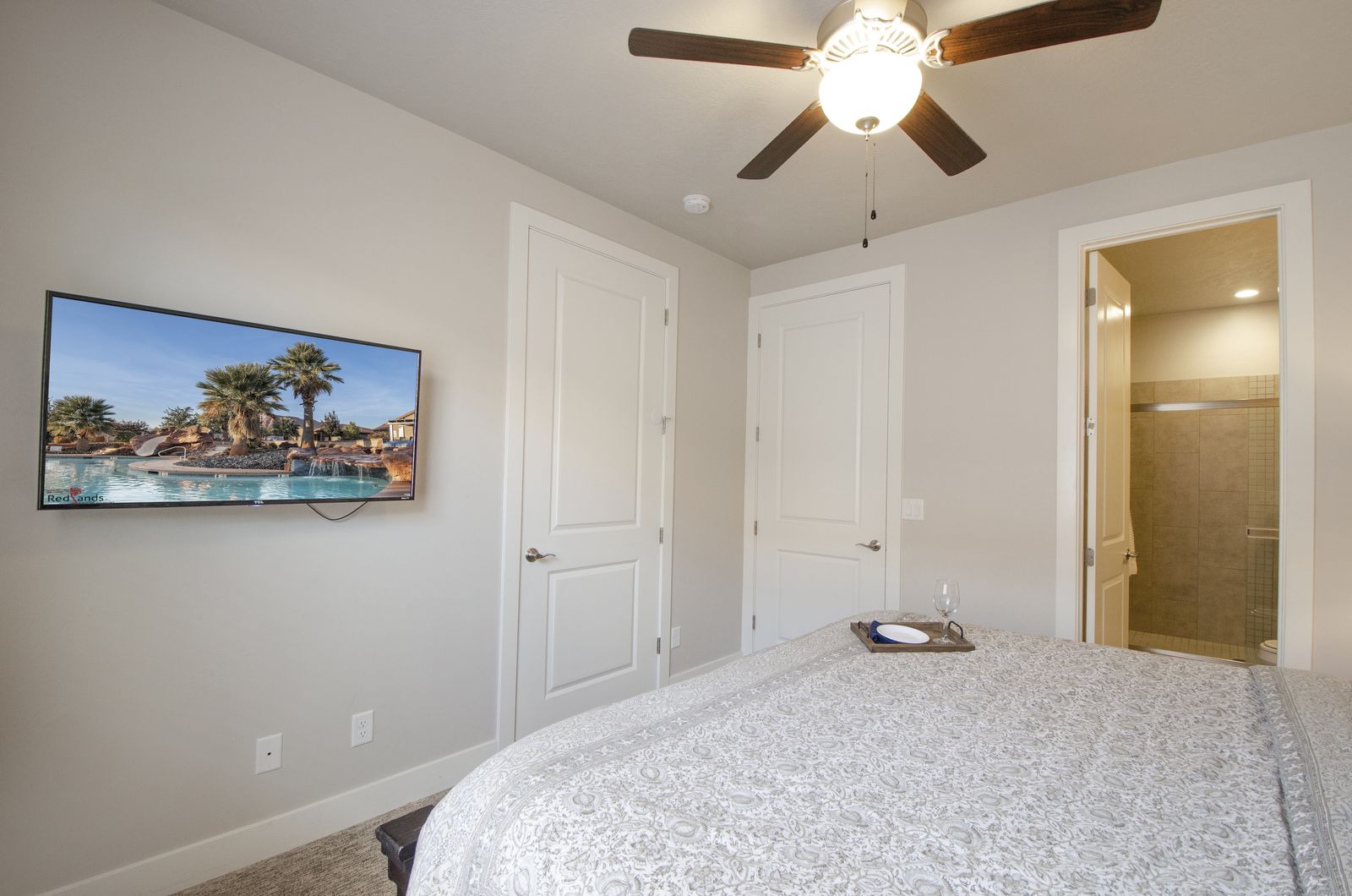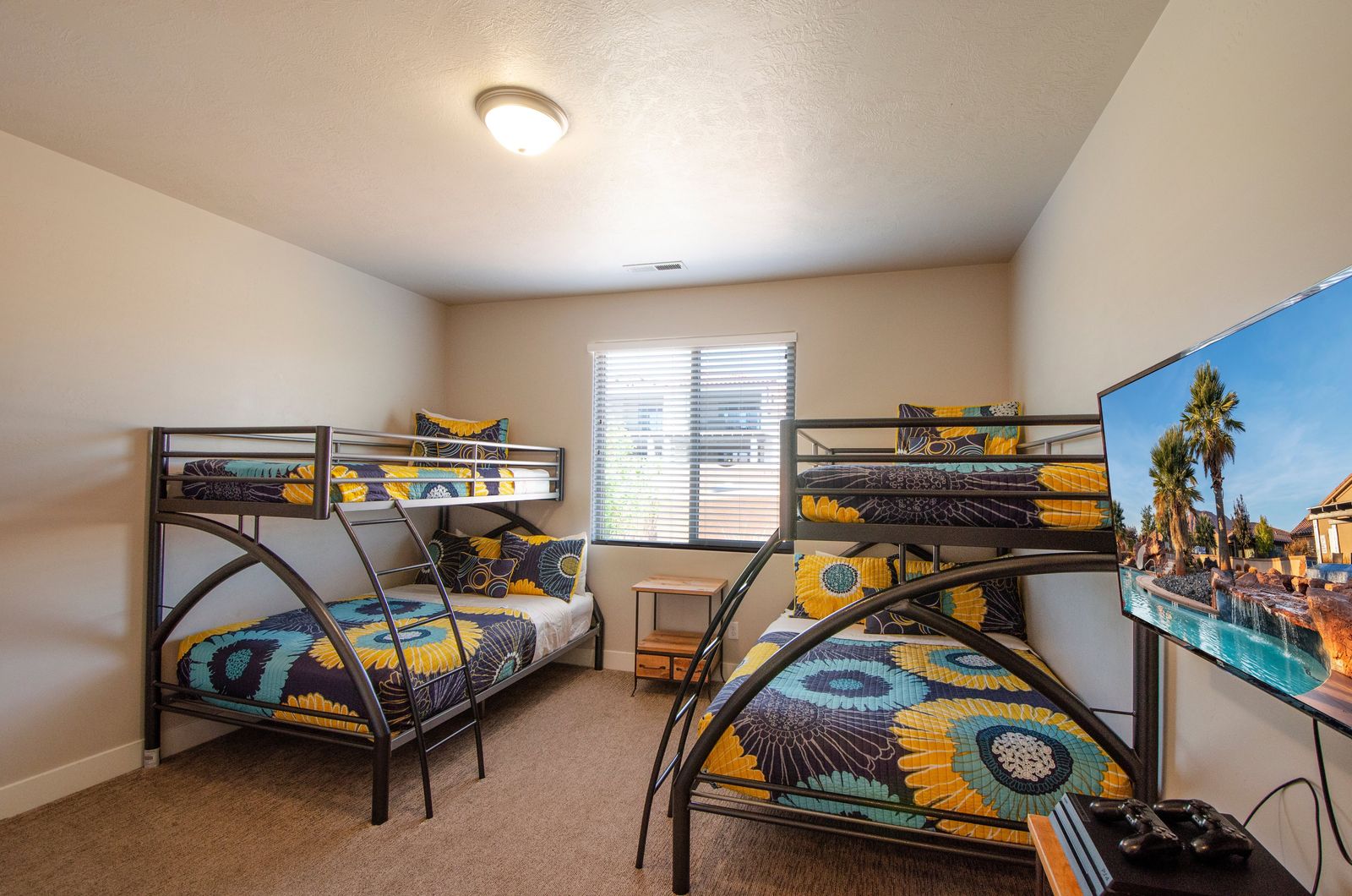 Mountain View Retreat is a beautiful 5 bedrooms / 5 bath that can comfortably accommodate 14 guests or up to 16 guests with the assistance of a queen air mattress. The expansive fully equipped kitchen, grill, indoor & outdoor dining, and outdoor lounge areas make hosting family & friends a breeze. Spend your days lounging by Paradise Village’s resort-style pool, swimming at the waterpark, or challenging each other to ping pong and spike ball tournaments! Take advantage of the many bike paths right out your front door and explore southern Utah on the bikes provided. Host a game night playing one of the many board and card games provided or challenging each other to games on the PS4. Grab your roasting sticks and some marshmallows to head up to the balcony to watch the sunset over the desert mountains while making a delicious smore! At the end of a long day, relax your muscles in your private hot tub under the starry night sky. Take solace in the comfort of your own room, each with a Smart TV, finding some peace and quiet has never been easier! No matter how you spend your days, you are sure to find relaxation, comfort, and extravagant views while staying at Mountain View Retreat!