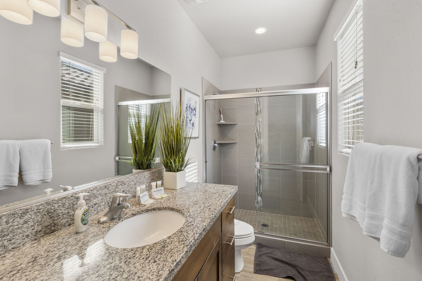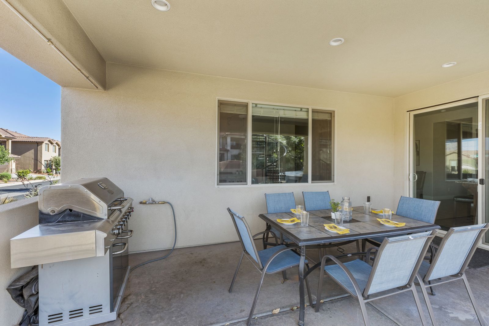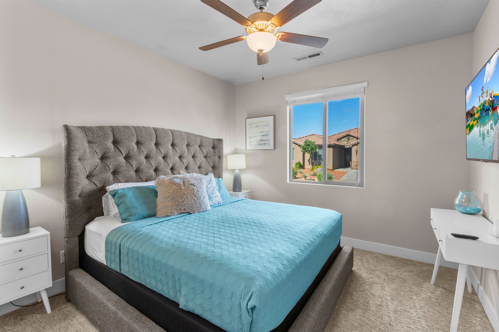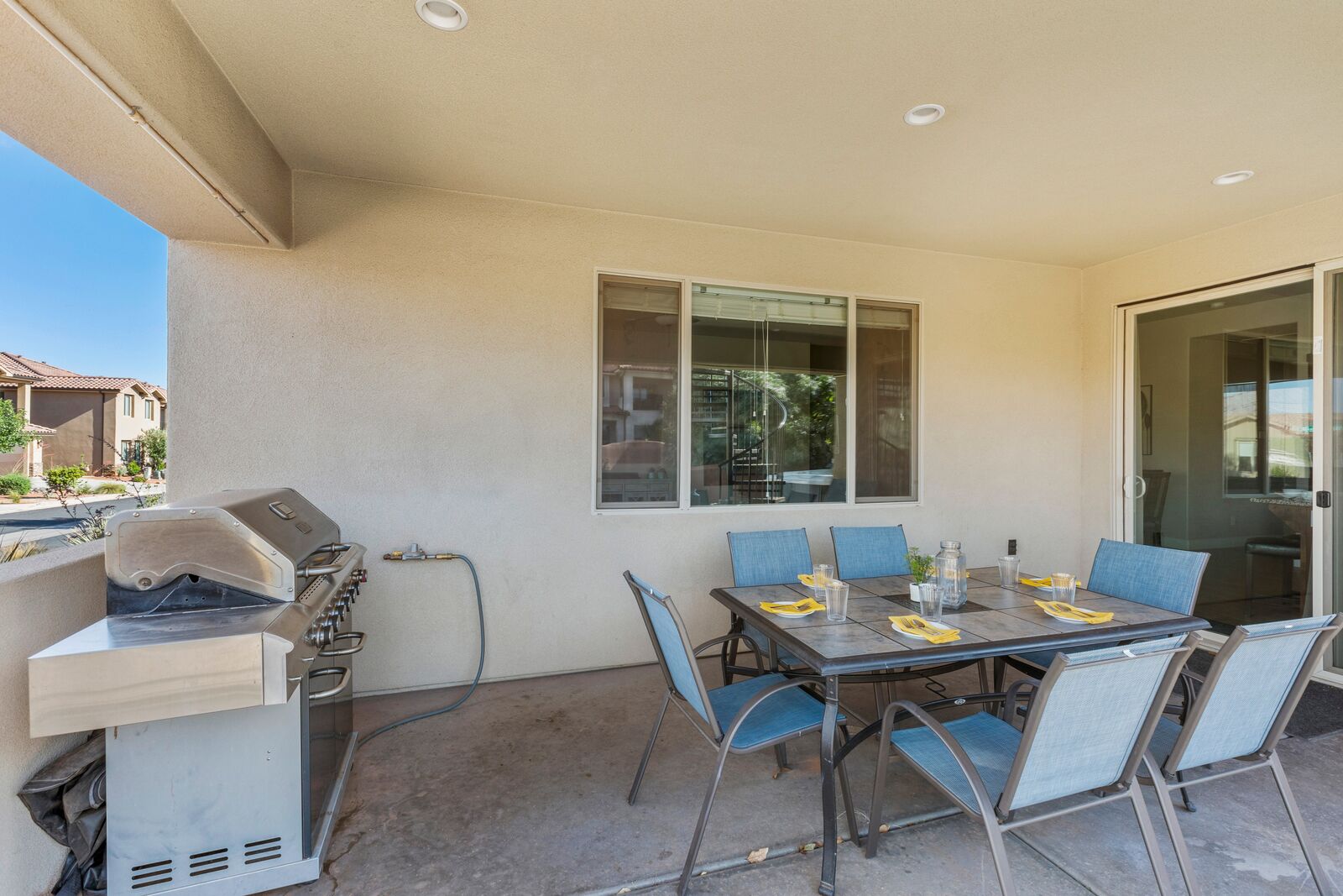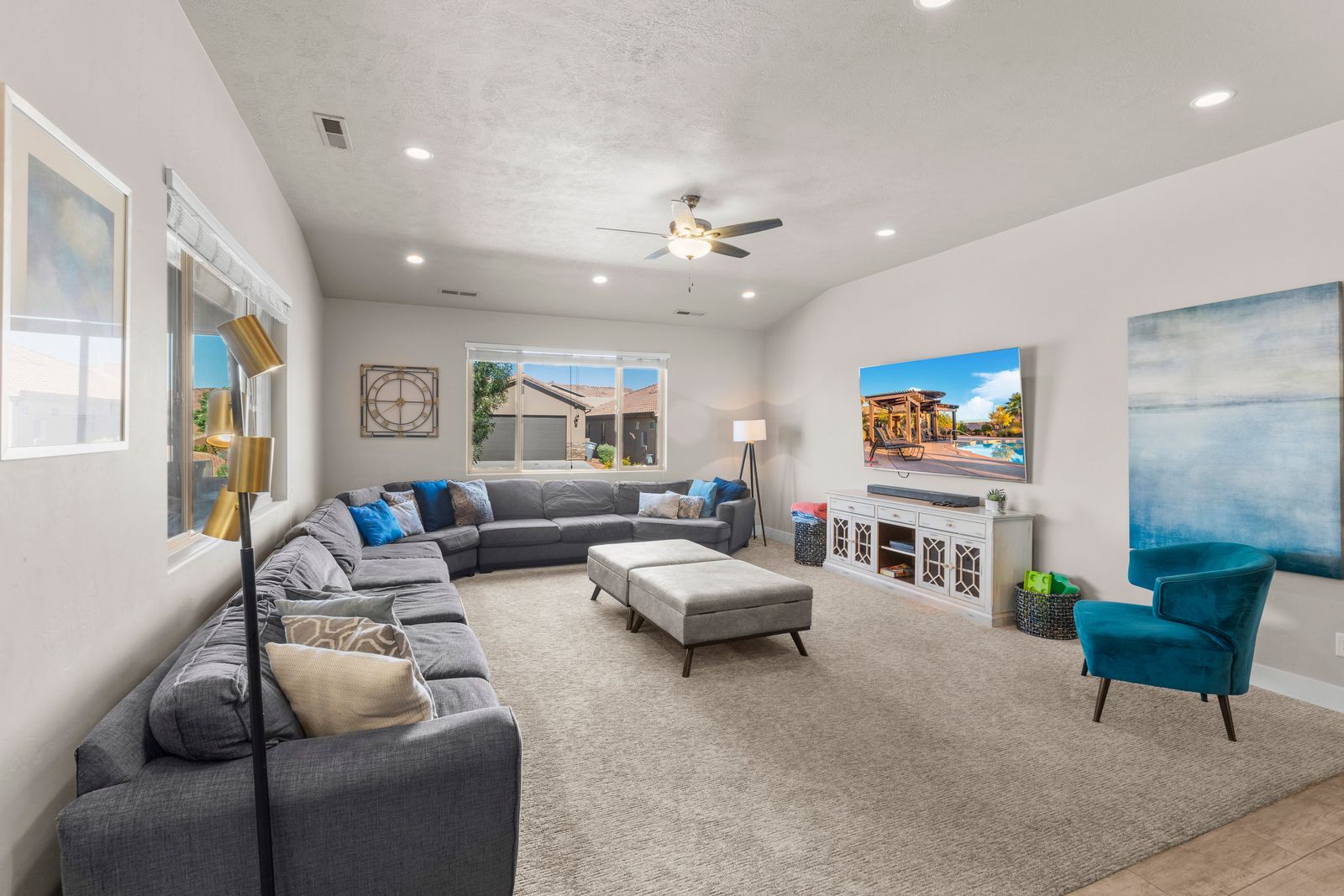 Fun in the Sun is a modern 5 bedroom / 5 bath that can comfortably accommodate 19 guests. The expansive fully equipped kitchen, grill, indoor & outdoor dining, and outdoor lounge areas make hosting family & friends a breeze. Mornings will quickly become your favorite time of day as you watch the sunrise over Snow Canyon State Park on the balcony, sipping a hot cup of coffee. Spend your days exploring southern Utah along the bike paths right out your front door on the bikes provided or lounge next to Paradise Village’s Resort Style pool and swim at the waterpark. Back at the home, challenge each other to games on the Xbox 1 in a friendly tournament! After a long day of hiking through the surrounding desert terrain, rest your tired muscles in your private hot tub under the starry sky or treat yourself to a smores and roast marshmallows on the balcony! Grab a bowl of popcorn and settle in for a good laugh while watching a movie on the Smart TV with a soundbar. No matter how you spend your vacation, you are sure to have Fun in the Sun!