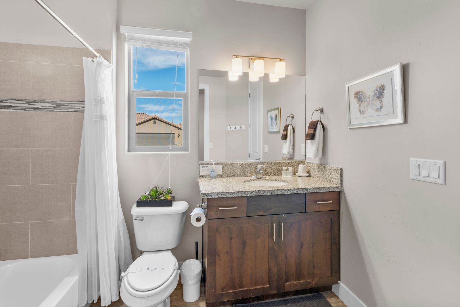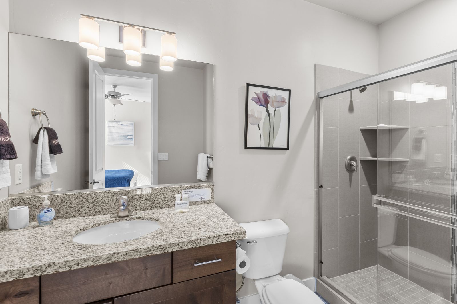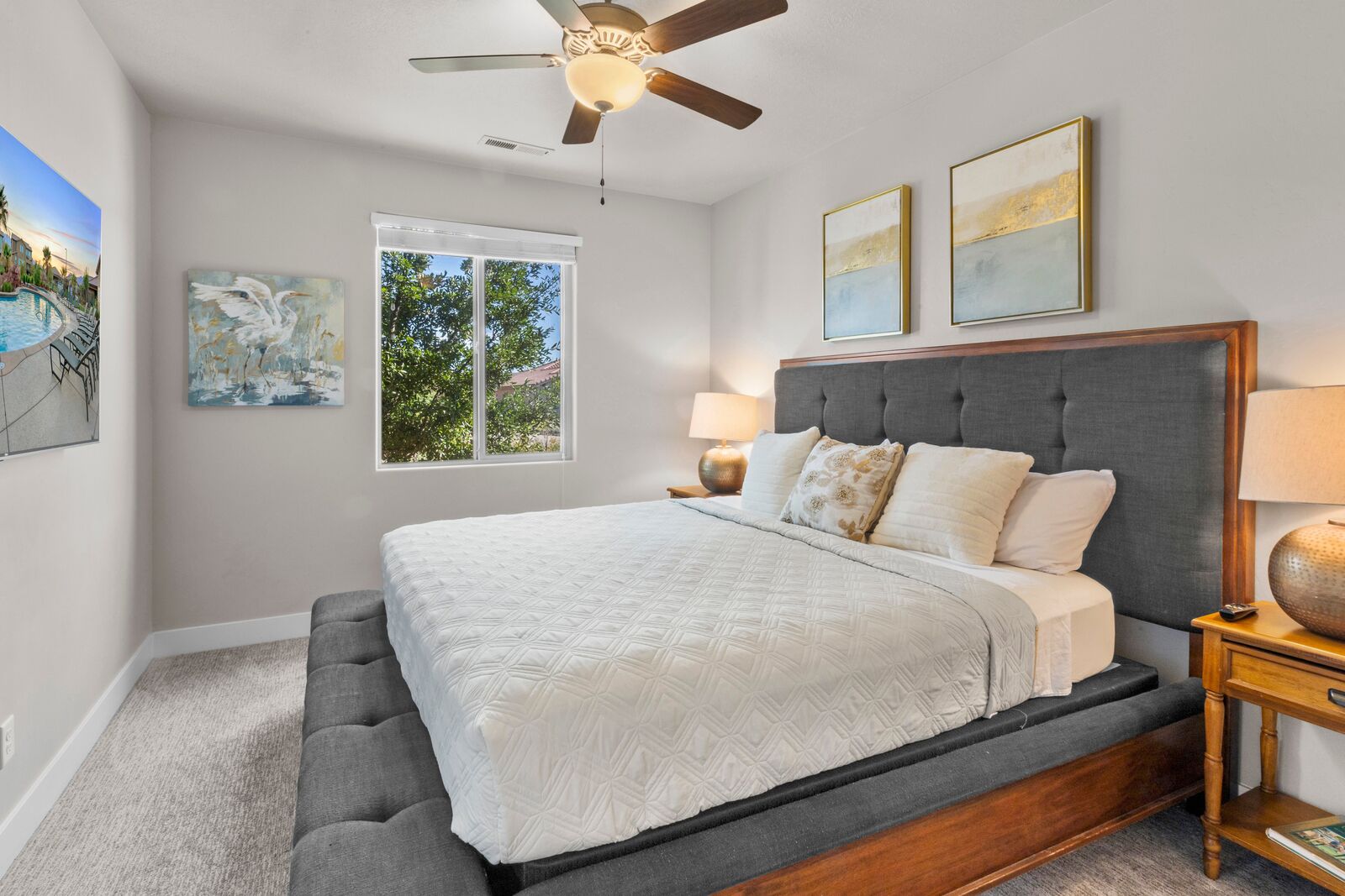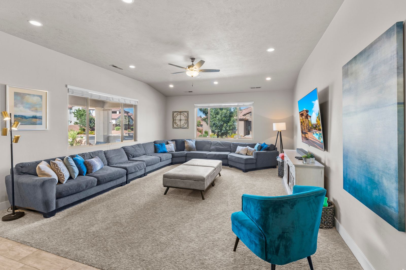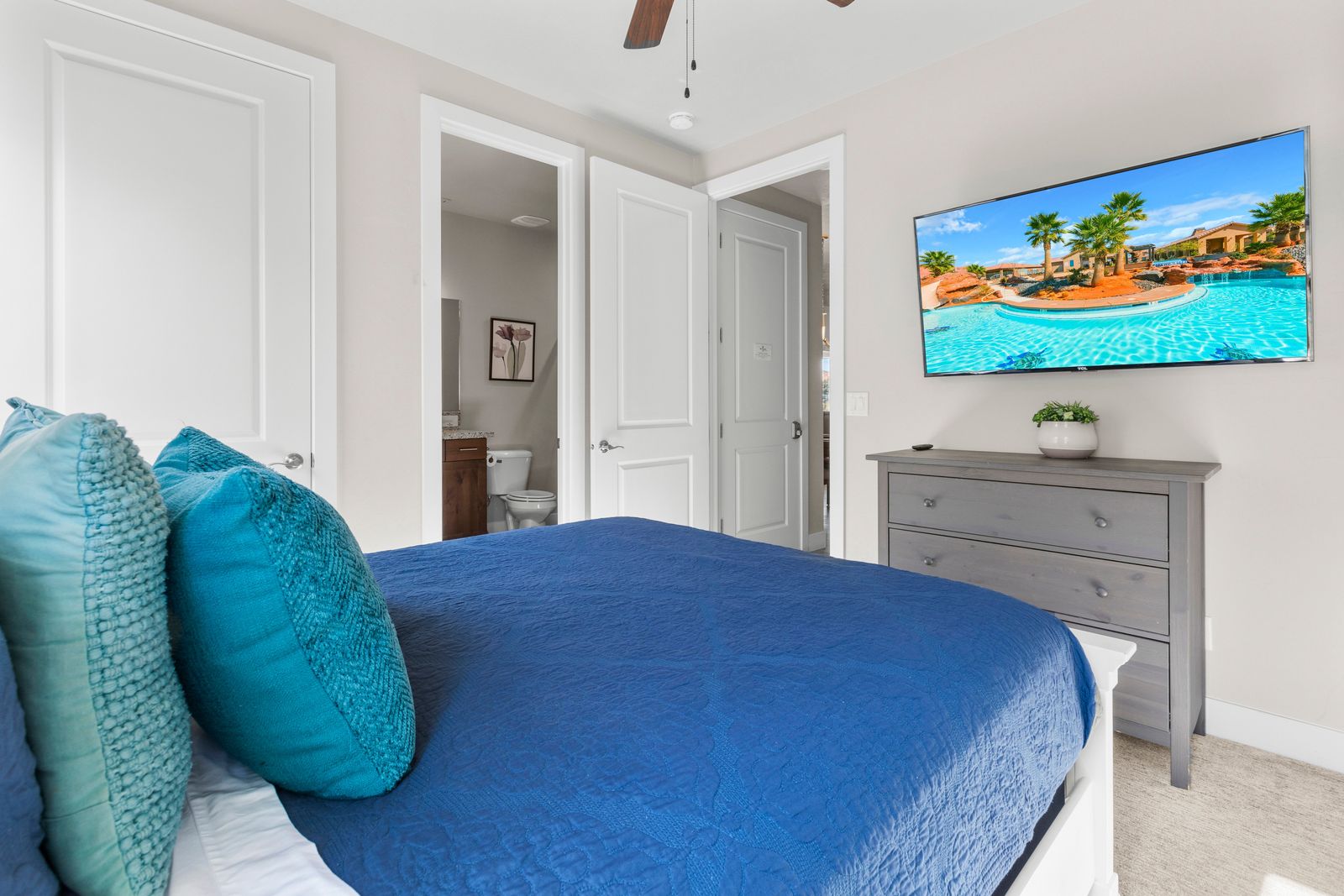 Fun in the Sun is a modern 5 bedroom / 5 bath that can comfortably accommodate 19 guests. The expansive fully equipped kitchen, grill, indoor & outdoor dining, and outdoor lounge areas make hosting family & friends a breeze. Mornings will quickly become your favorite time of day as you watch the sunrise over Snow Canyon State Park on the balcony, sipping a hot cup of coffee. Spend your days exploring southern Utah along the bike paths right out your front door on the bikes provided or lounge next to Paradise Village’s Resort Style pool and swim at the waterpark. Back at the home, challenge each other to games on the Xbox 1 in a friendly tournament! After a long day of hiking through the surrounding desert terrain, rest your tired muscles in your private hot tub under the starry sky or treat yourself to a smores and roast marshmallows on the balcony! Grab a bowl of popcorn and settle in for a good laugh while watching a movie on the Smart TV with a soundbar. No matter how you spend your vacation, you are sure to have Fun in the Sun!