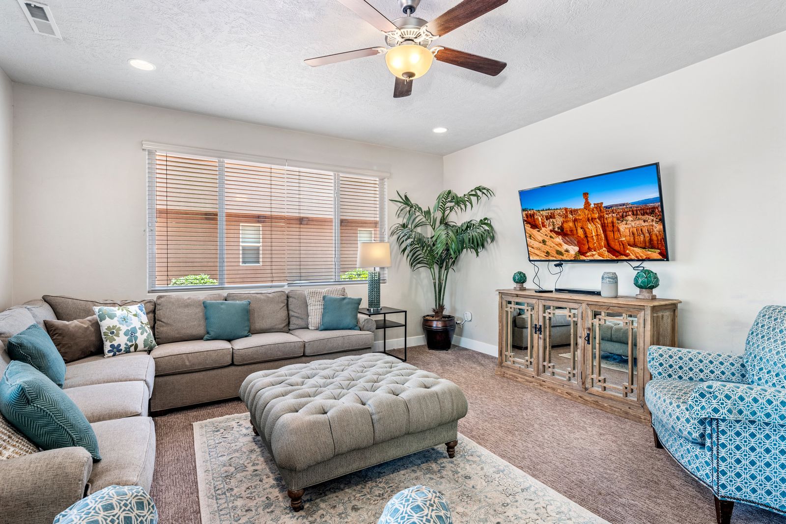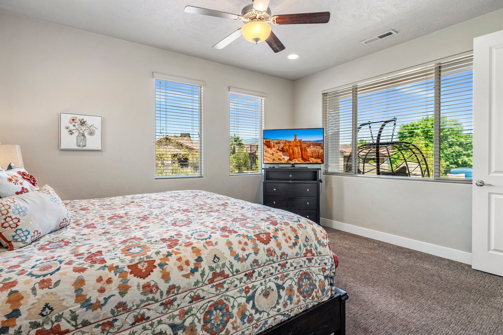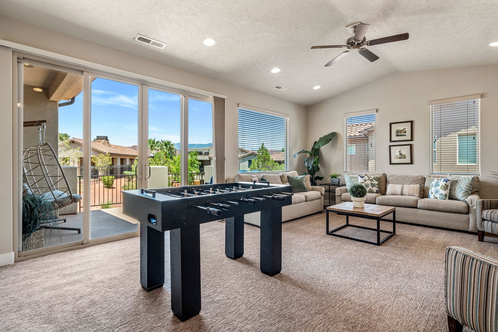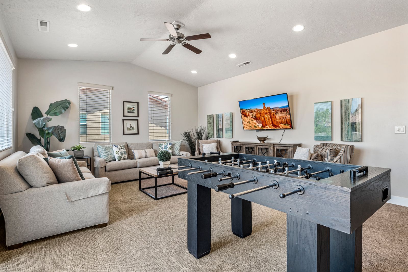 Poolside Paradise is a beautiful 4 bedroom / 4 & 2 ½ bath home that can comfortably accommodate 12 guests or up to 20 guests with the assistance of 3 queen air mattresses. The expansive fully equipped kitchen, grill, indoor & outdoor dining, and outdoor lounge areas make hosting family & friends a breeze. Spend your days lounging next to Paradise Village’s resort-style pool or swimming at their waterpark! Take off for a day trip to one of the National or State parks within a close drive to explore the beauty Southern Utah has to offer. Back at home, challenge each other to ping pong or foosball tournaments. Evenings will quickly become your favorite time of day as you lounge in the hammock on the balcony while watching the sunset over the desert mountains! Grab a bowl of popcorn and settle in for a cozy movie night, with two living rooms, each with a Smart TV, everyone will be able to find a movie they can enjoy! Whether you are adventuring through Southern Utah, lounging poolside, or competing in a ping pong tournament, you will find your own personal paradise at Poolside Paradise!