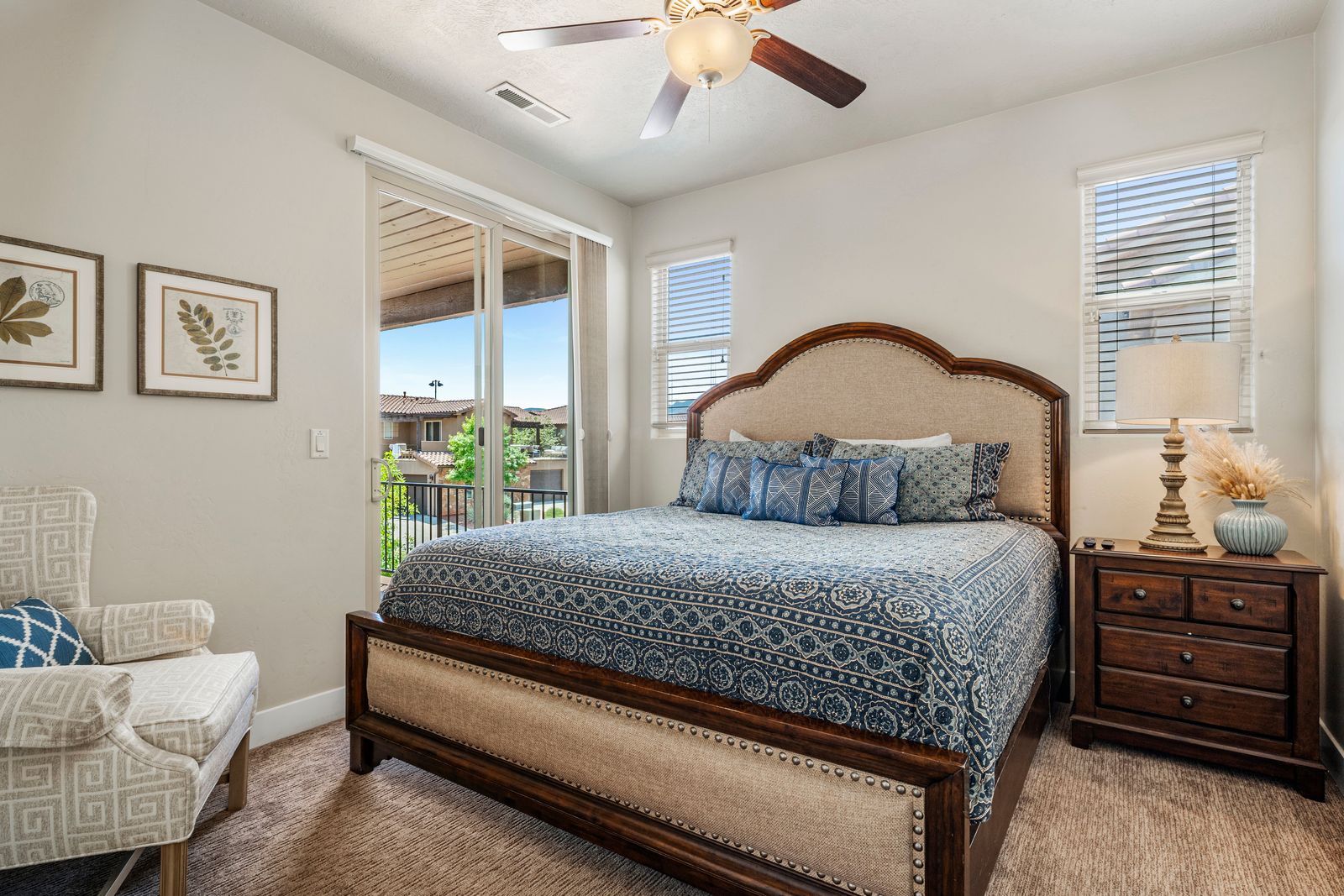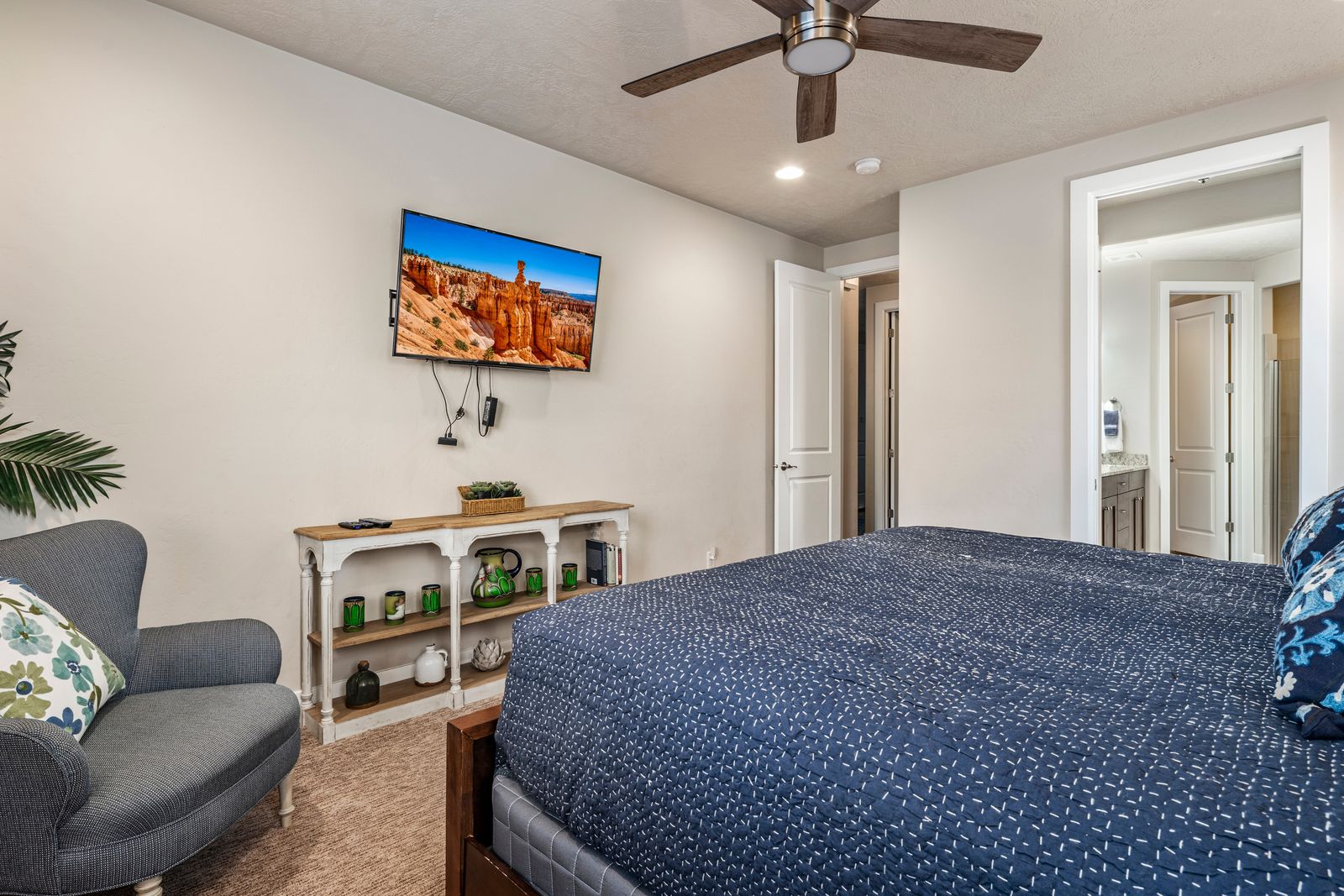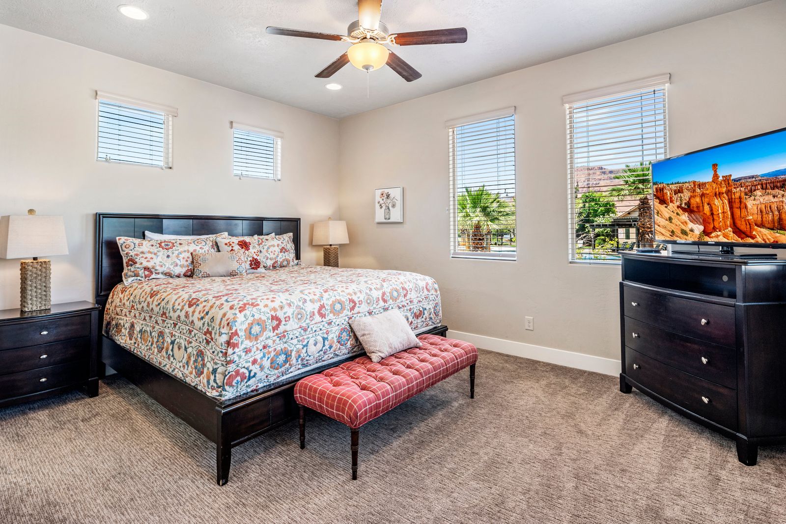 Poolside Paradise is a beautiful 4 bedroom / 4 & 2 ½ bath home that can comfortably accommodate 12 guests or up to 20 guests with the assistance of 3 queen air mattresses. The expansive fully equipped kitchen, grill, indoor & outdoor dining, and outdoor lounge areas make hosting family & friends a breeze. Spend your days lounging next to Paradise Village’s resort-style pool or swimming at their waterpark! Take off for a day trip to one of the National or State parks within a close drive to explore the beauty Southern Utah has to offer. Back at home, challenge each other to ping pong or foosball tournaments. Evenings will quickly become your favorite time of day as you lounge in the hammock on the balcony while watching the sunset over the desert mountains! Grab a bowl of popcorn and settle in for a cozy movie night, with two living rooms, each with a Smart TV, everyone will be able to find a movie they can enjoy! Whether you are adventuring through Southern Utah, lounging poolside, or competing in a ping pong tournament, you will find your own personal paradise at Poolside Paradise!