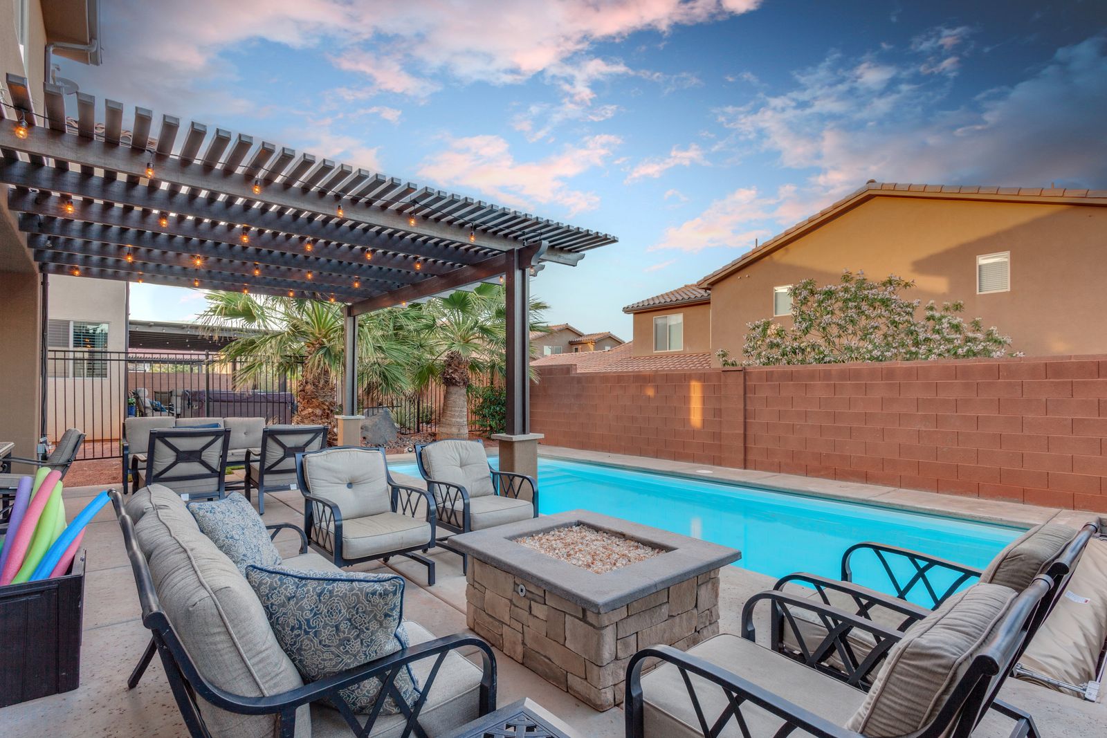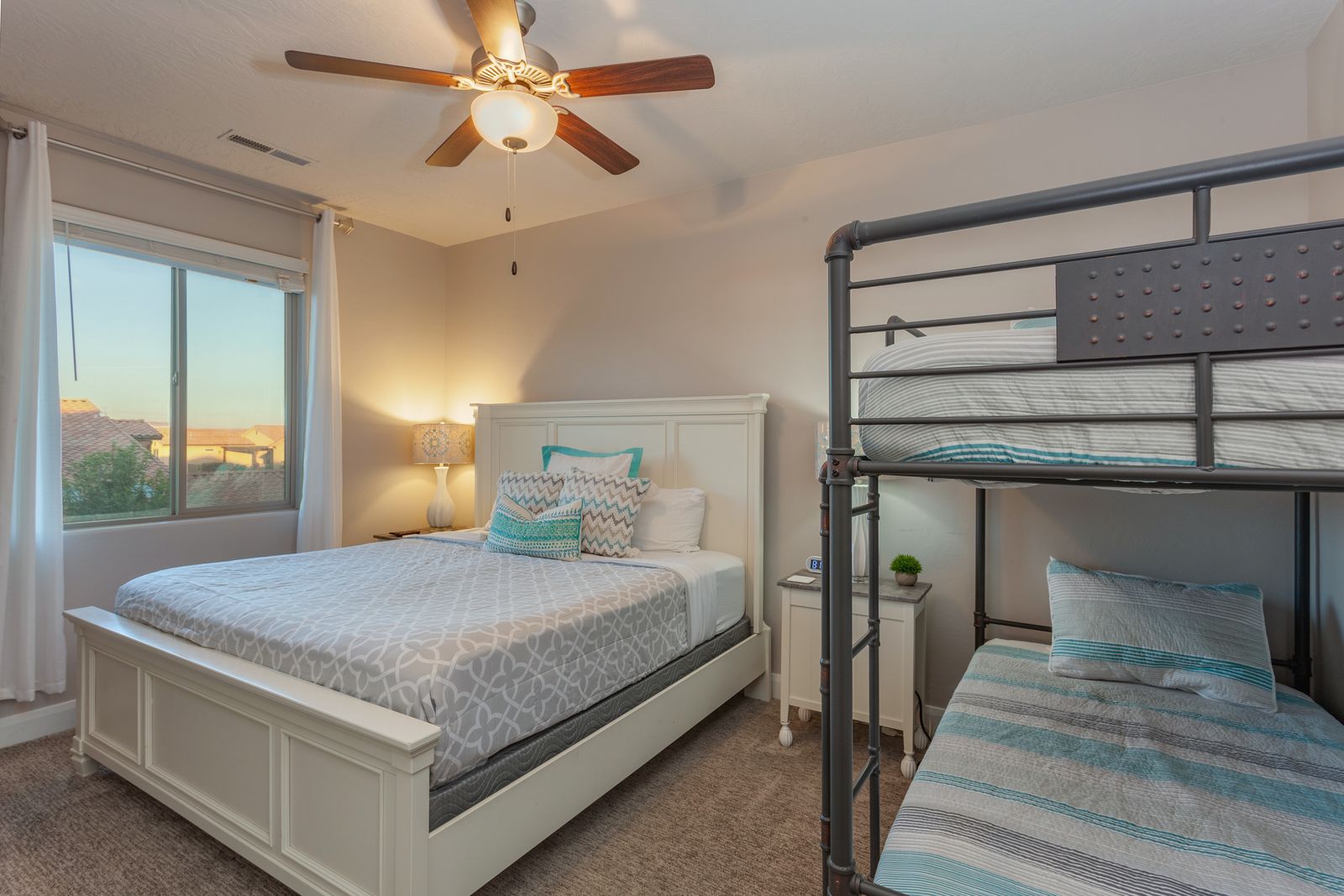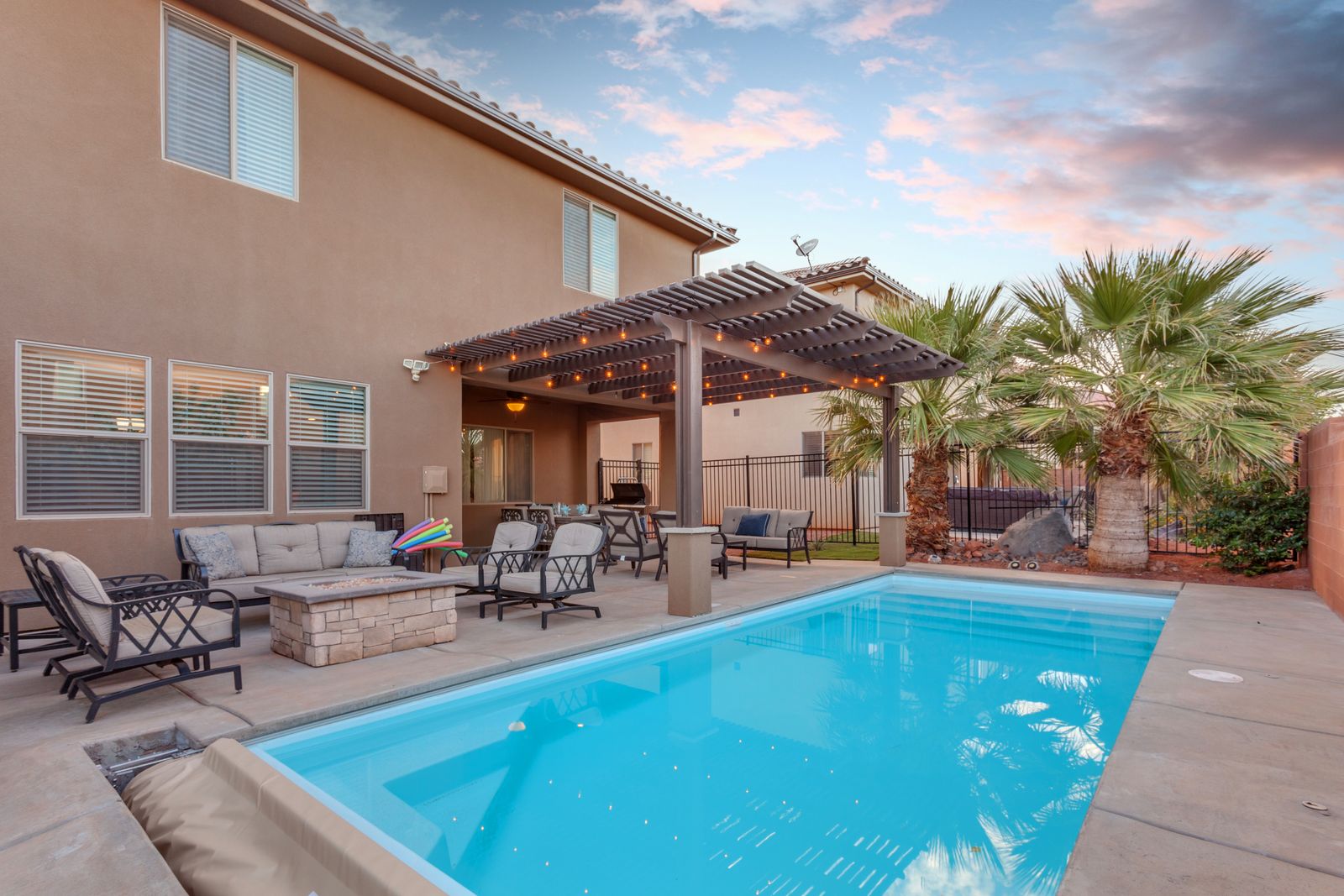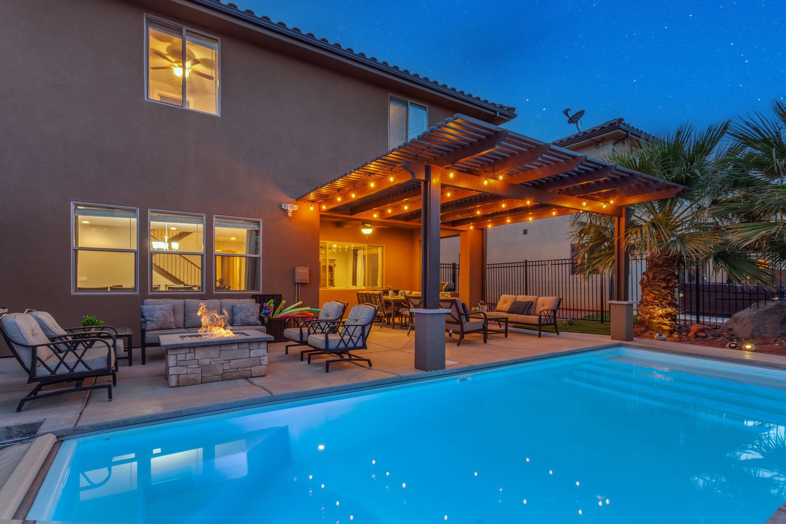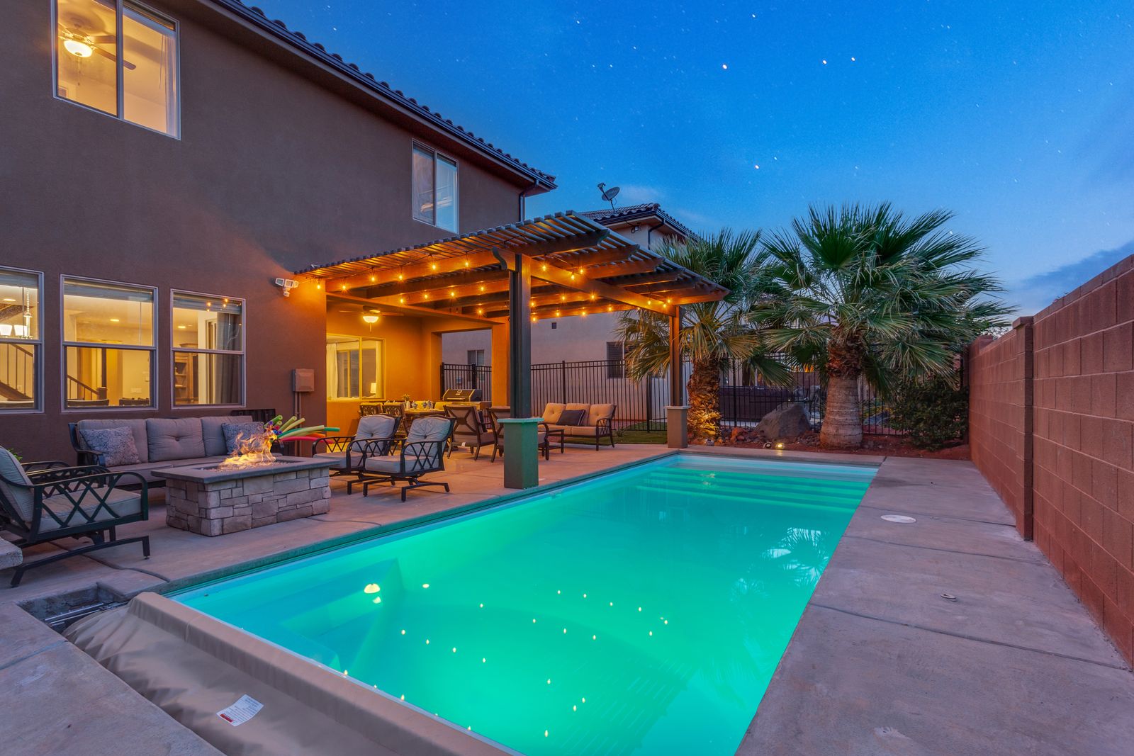 Sunset is a beautiful 7 bedroom / 7.5 bath home that comfortably sleeps 24 guests or up to 26 guests with the assistance of a queen air mattress. Spend your days exploring the nearby National and State Parks, practicing your putt on one of the many golf courses, biking through the desert mountains, or never leave home! With Foosball, Ping pong, cable, 3 Xbox 1’s, and a resort-style pool and water park; you do not need to leave Sunset to have the vacation of your dreams! The expansive, fully equipped kitchen, grill, and indoor and outdoor dining make hosting friends and family a breeze. Grab a cold drink and head up to the balcony to catch a spectacular sunset over the desert mountains. Spend your nights roasting marshmallows around the fire under the starry sky or soaking your tired muscles in your brand new private hot tub and pool with a light show! Host a movie night in one of the two living rooms, both with smart tv and cable, picking a movie everyone will love is easy. Grab some peace and quiet in the comfort of your own room, each with a Smart TV, making it easy to relax! No matter how you spend your vacation, it is bound to be filled with spectacular views and timeless memories made while staying at Sunset!