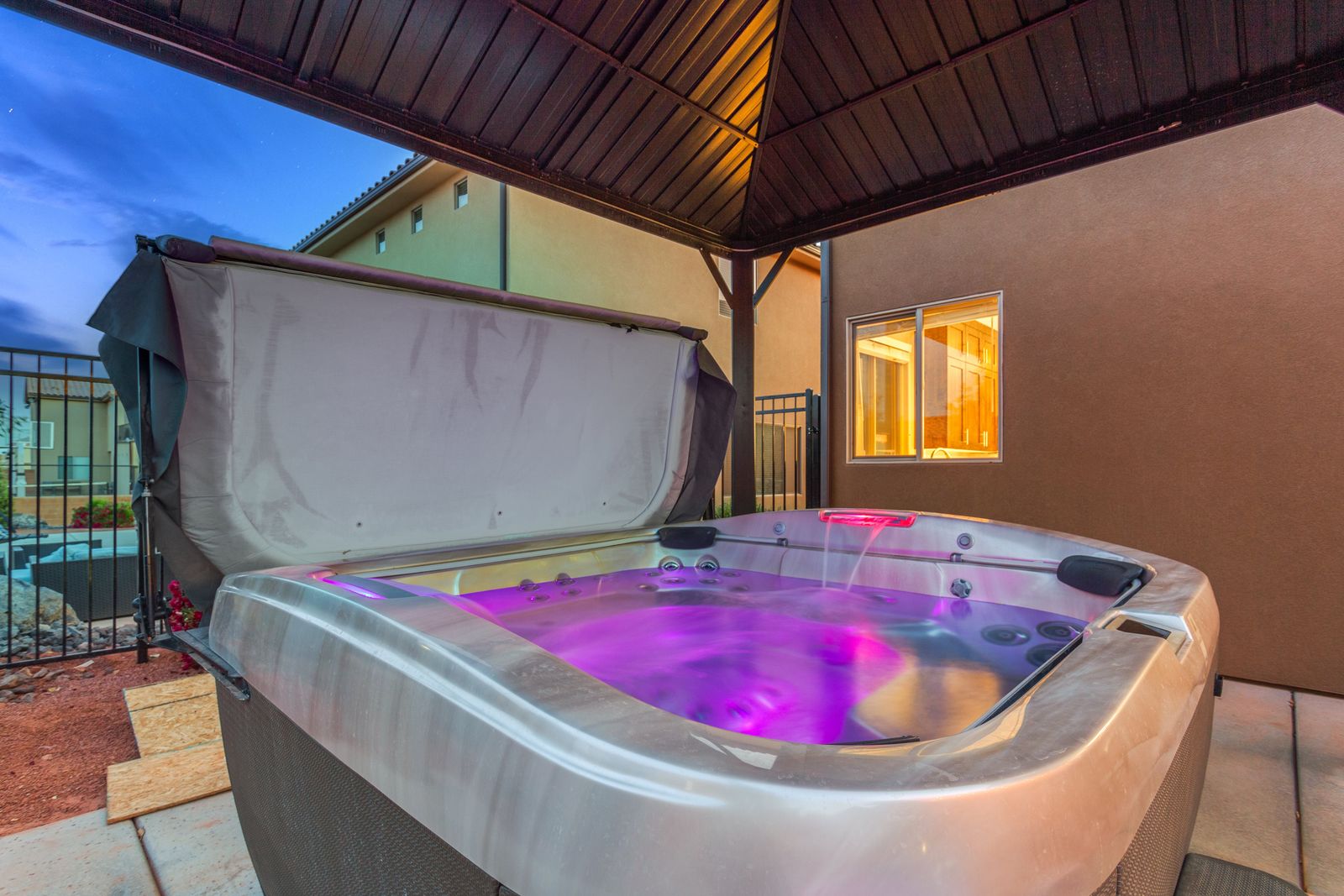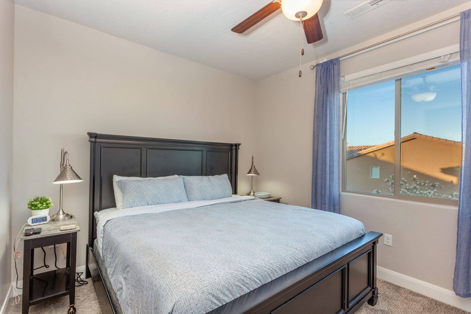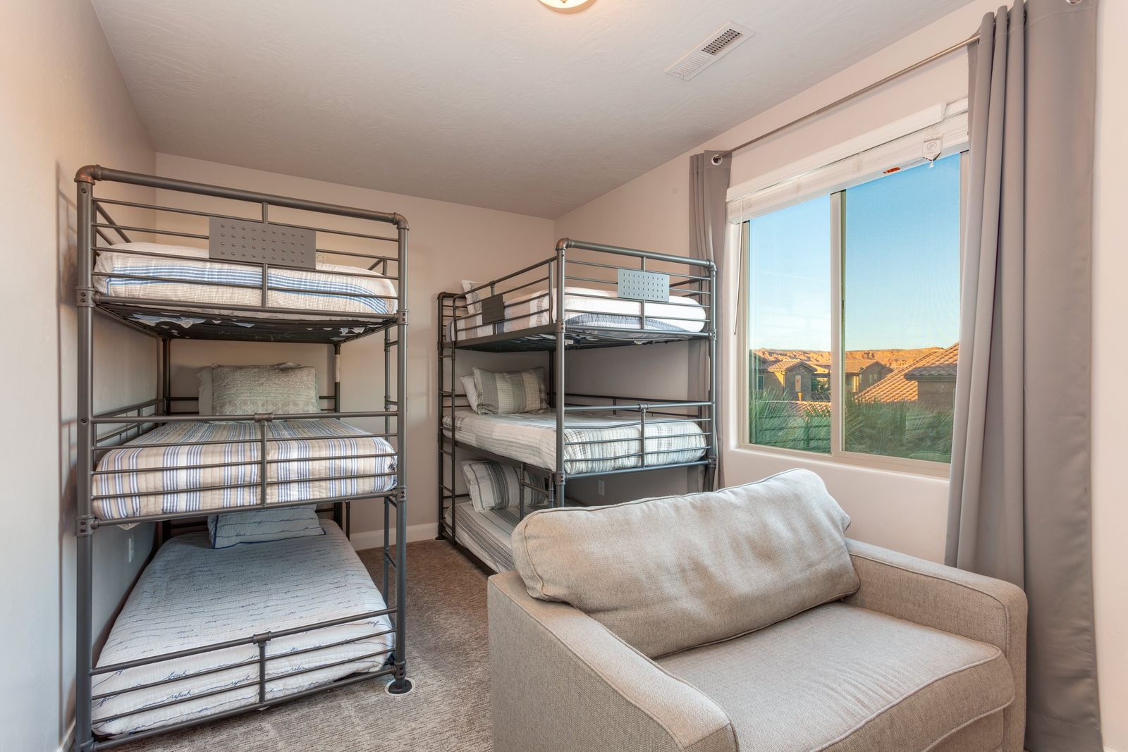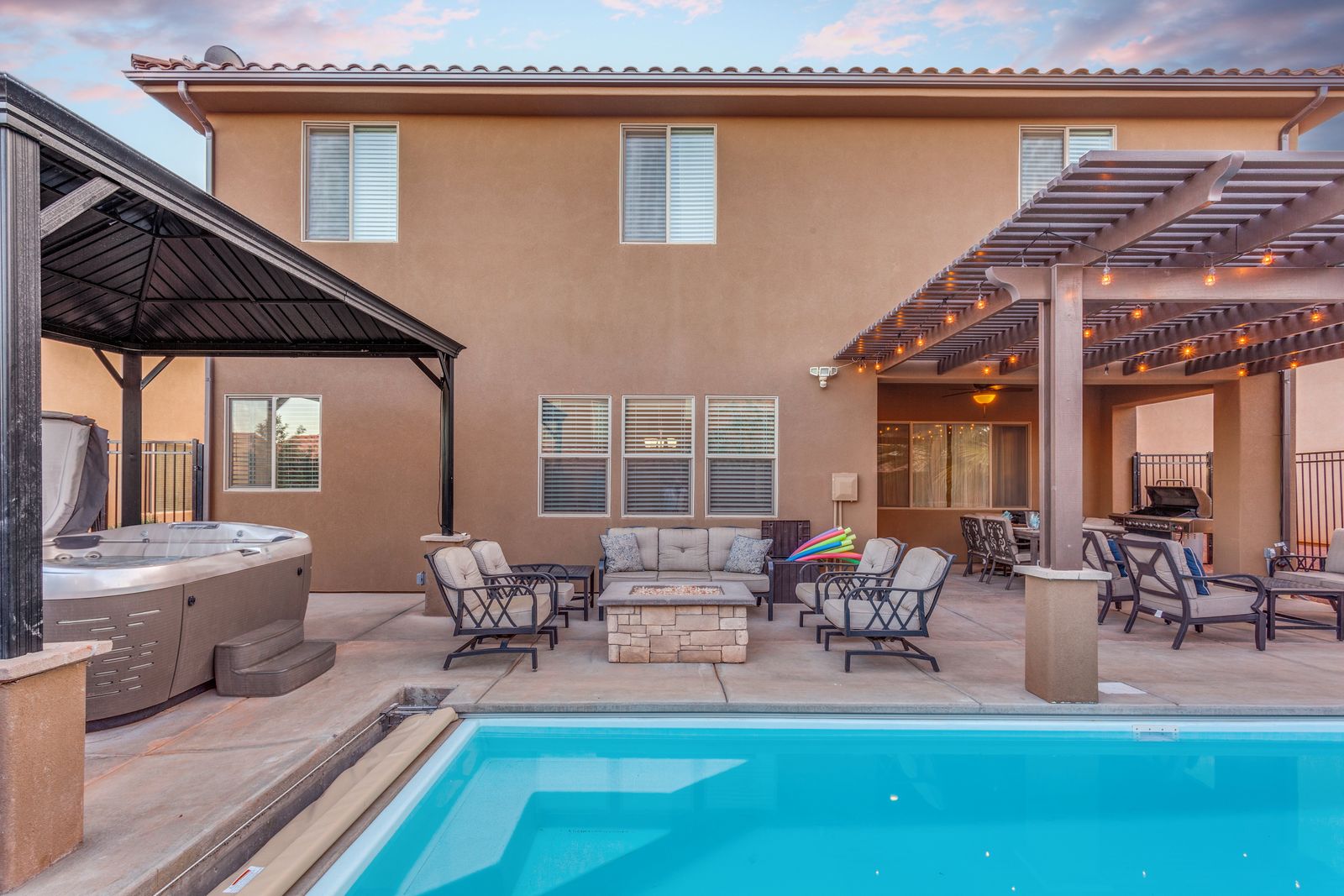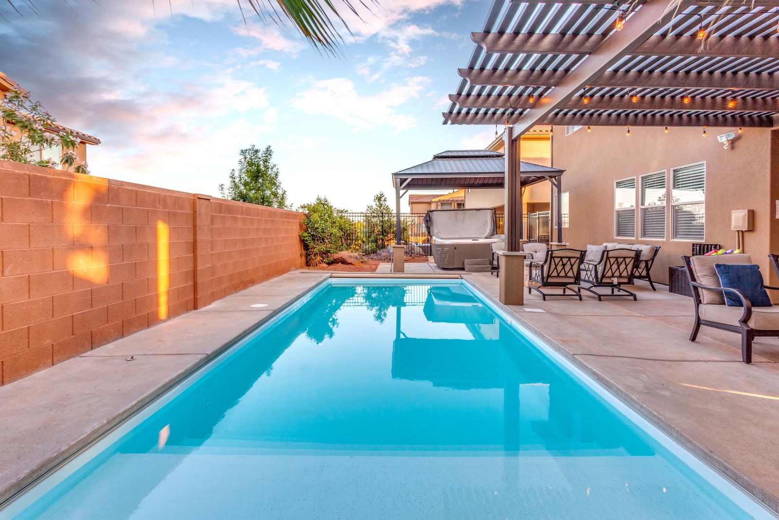 Sunset is a beautiful 7 bedroom / 7.5 bath home that comfortably sleeps 24 guests or up to 26 guests with the assistance of a queen air mattress. Spend your days exploring the nearby National and State Parks, practicing your putt on one of the many golf courses, biking through the desert mountains, or never leave home! With Foosball, Ping pong, cable, 3 Xbox 1’s, and a resort-style pool and water park; you do not need to leave Sunset to have the vacation of your dreams! The expansive, fully equipped kitchen, grill, and indoor and outdoor dining make hosting friends and family a breeze. Grab a cold drink and head up to the balcony to catch a spectacular sunset over the desert mountains. Spend your nights roasting marshmallows around the fire under the starry sky or soaking your tired muscles in your brand new private hot tub and pool with a light show! Host a movie night in one of the two living rooms, both with smart tv and cable, picking a movie everyone will love is easy. Grab some peace and quiet in the comfort of your own room, each with a Smart TV, making it easy to relax! No matter how you spend your vacation, it is bound to be filled with spectacular views and timeless memories made while staying at Sunset!
