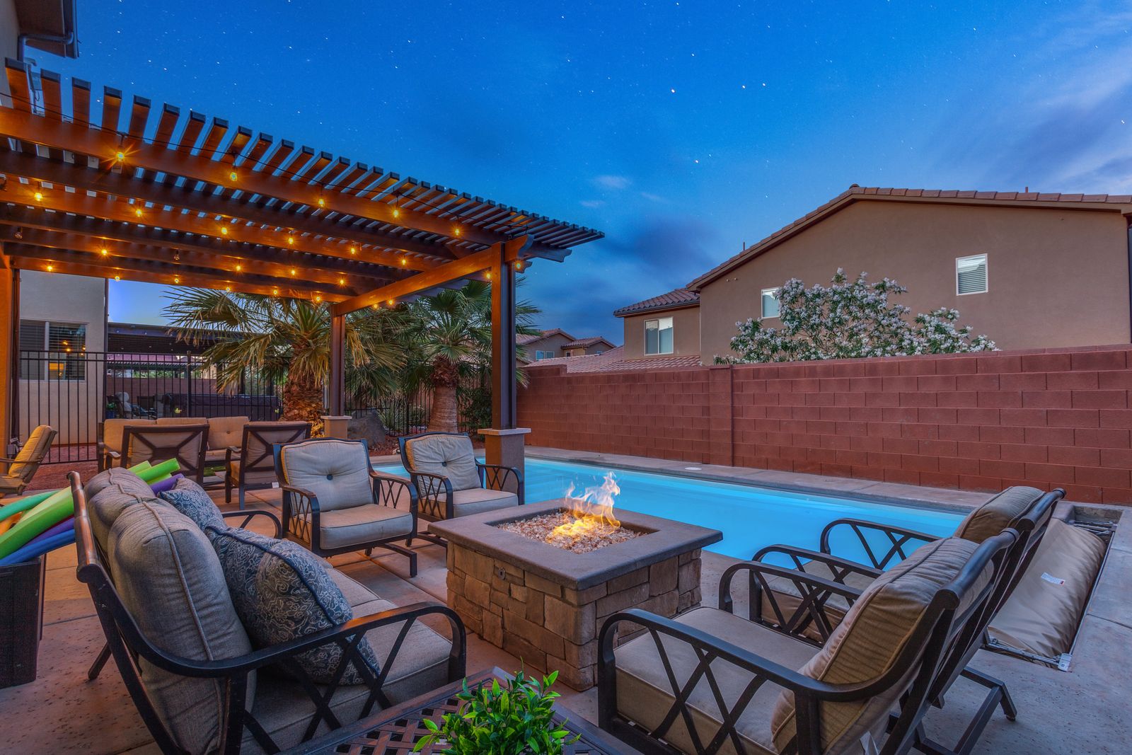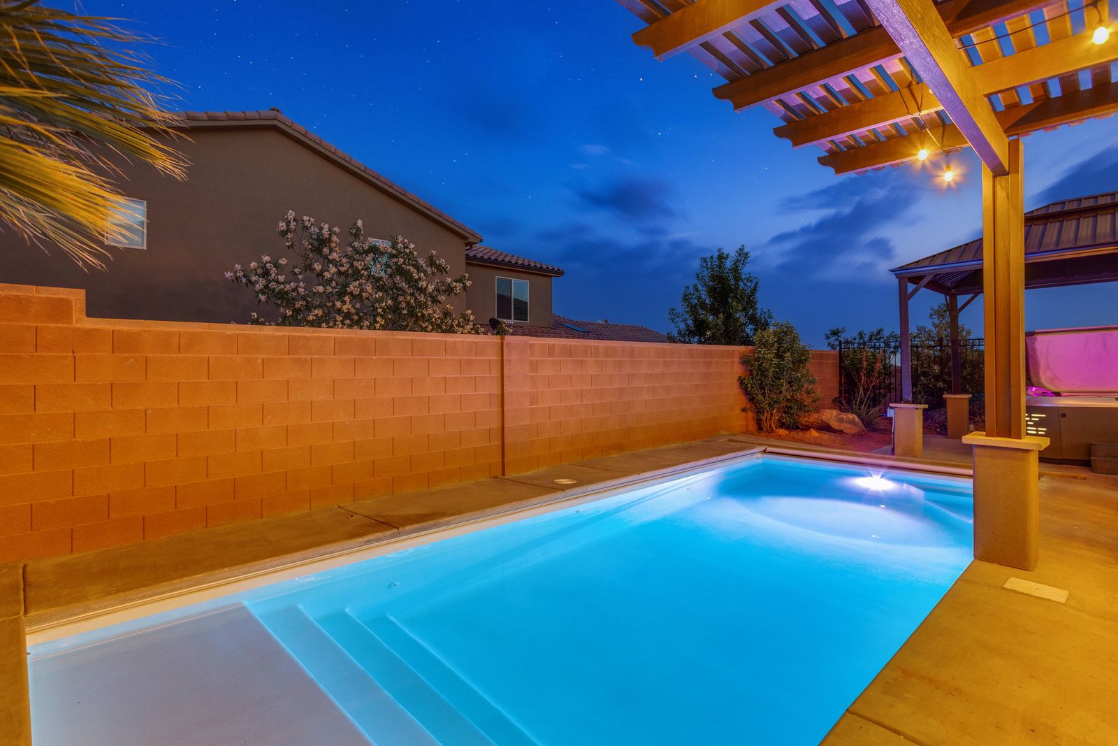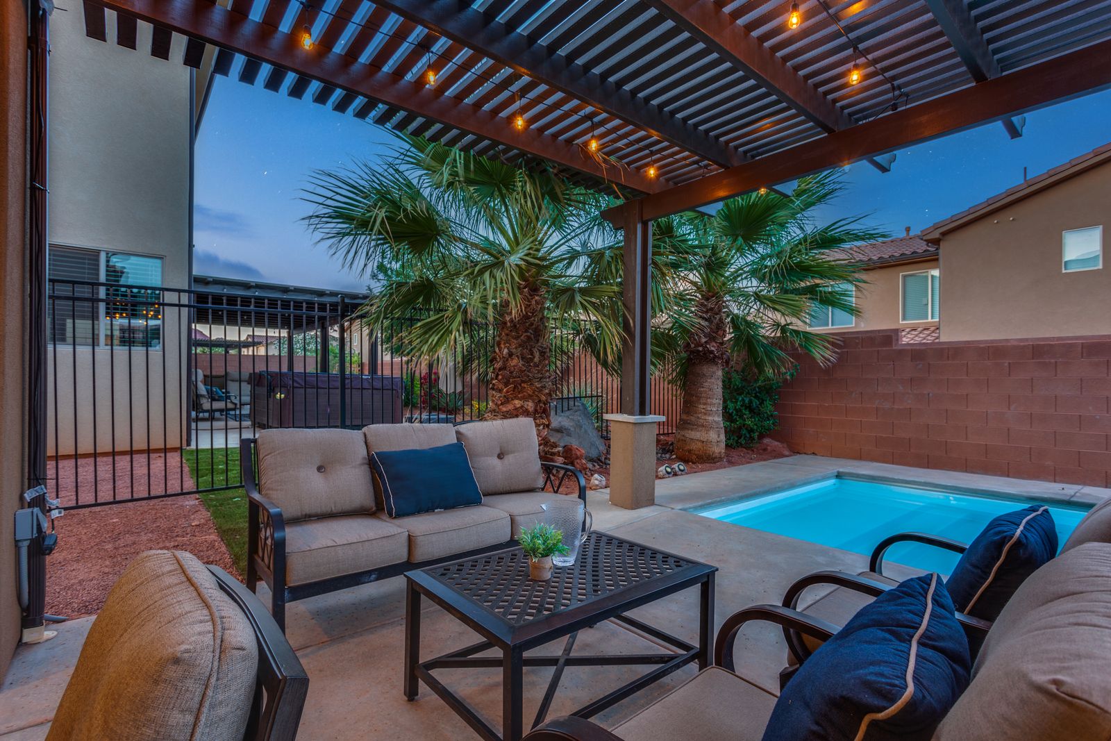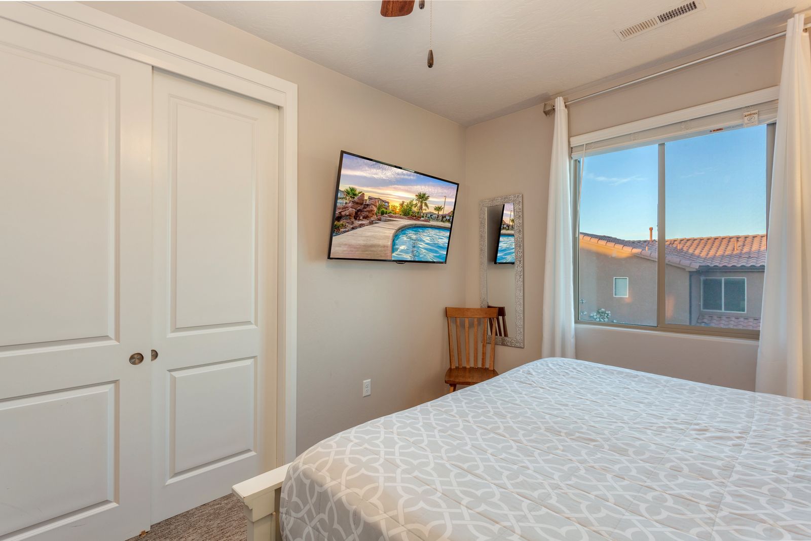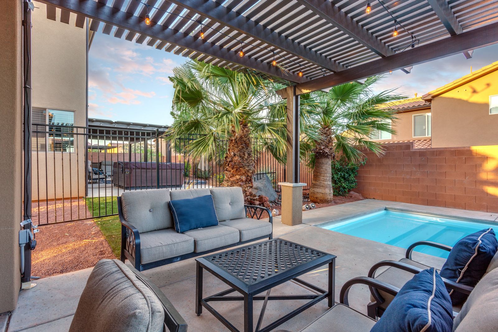 Sunset is a beautiful 7 bedroom / 7.5 bath home that comfortably sleeps 24 guests or up to 26 guests with the assistance of a queen air mattress. Spend your days exploring the nearby National and State Parks, practicing your putt on one of the many golf courses, biking through the desert mountains, or never leave home! With Foosball, Ping pong, cable, 3 Xbox 1’s, and a resort-style pool and water park; you do not need to leave Sunset to have the vacation of your dreams! The expansive, fully equipped kitchen, grill, and indoor and outdoor dining make hosting friends and family a breeze. Grab a cold drink and head up to the balcony to catch a spectacular sunset over the desert mountains. Spend your nights roasting marshmallows around the fire under the starry sky or soaking your tired muscles in your brand new private hot tub and pool with a light show! Host a movie night in one of the two living rooms, both with smart tv and cable, picking a movie everyone will love is easy. Grab some peace and quiet in the comfort of your own room, each with a Smart TV, making it easy to relax! No matter how you spend your vacation, it is bound to be filled with spectacular views and timeless memories made while staying at Sunset!