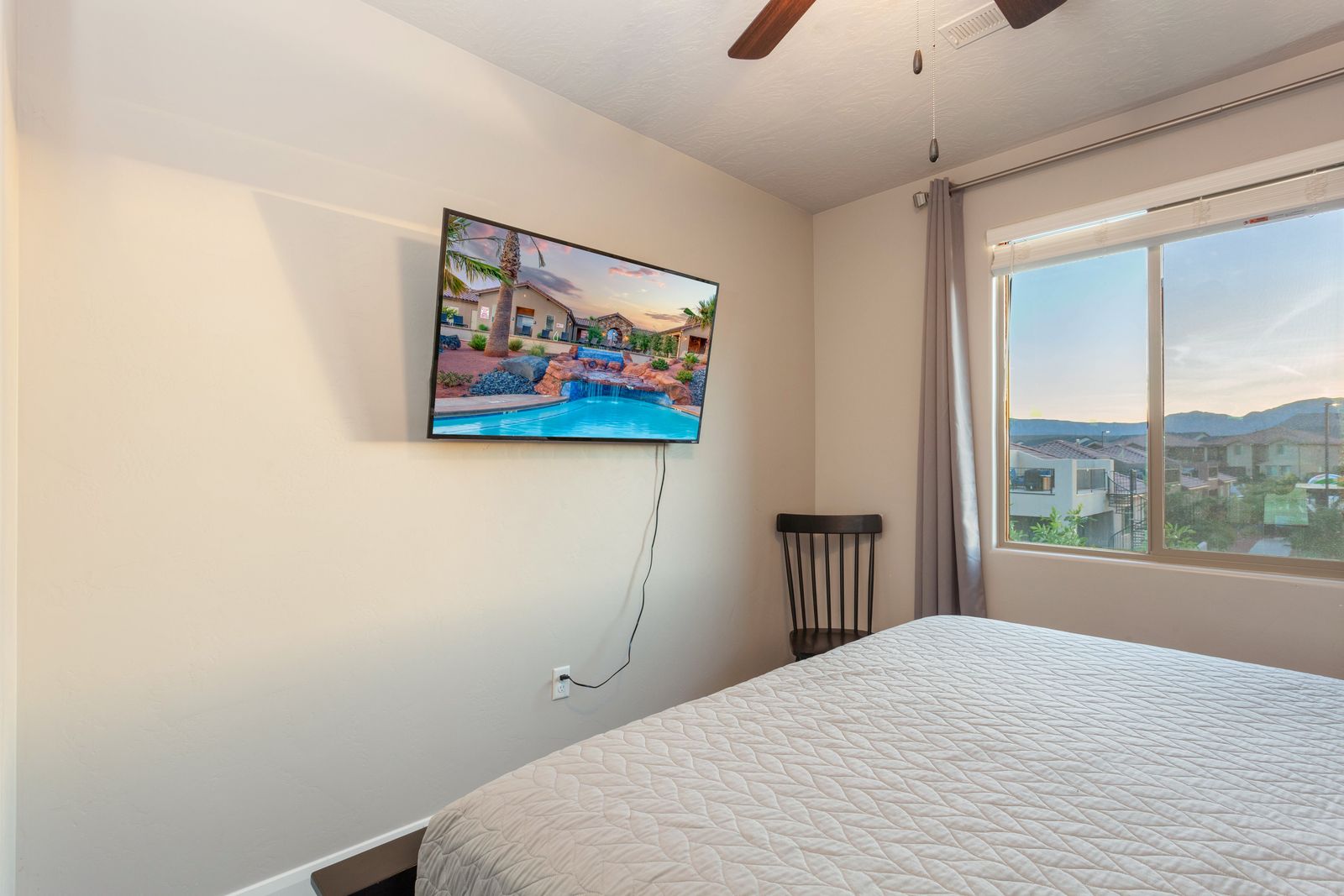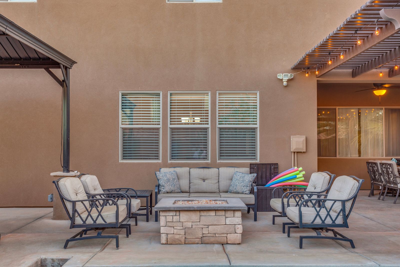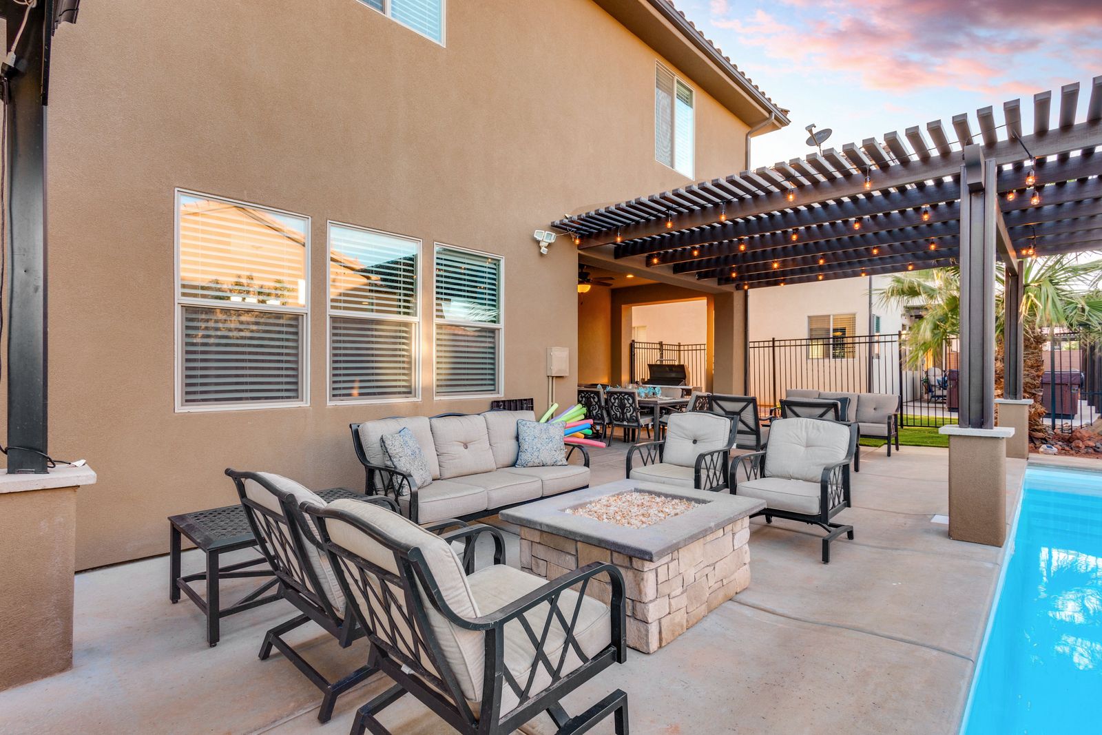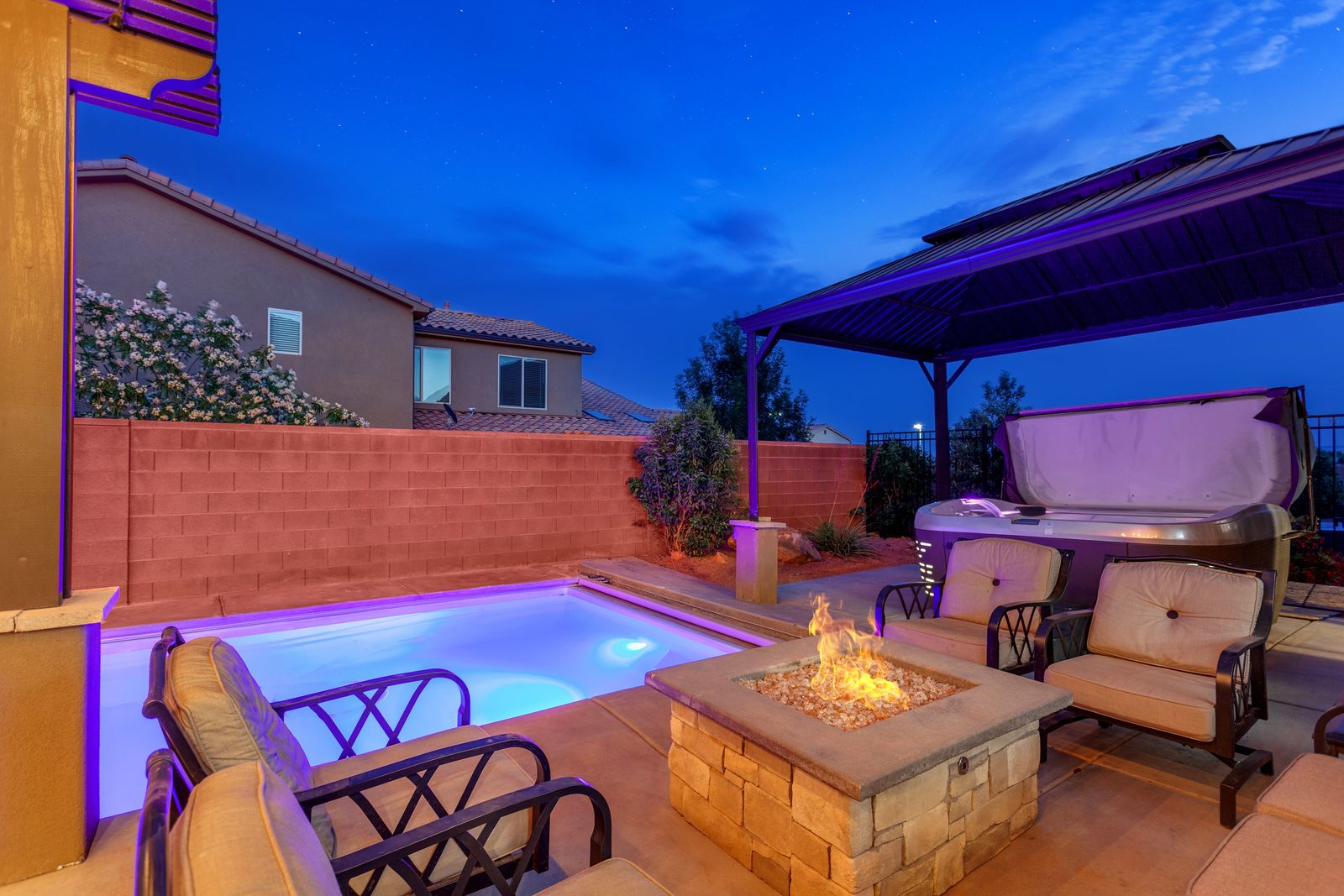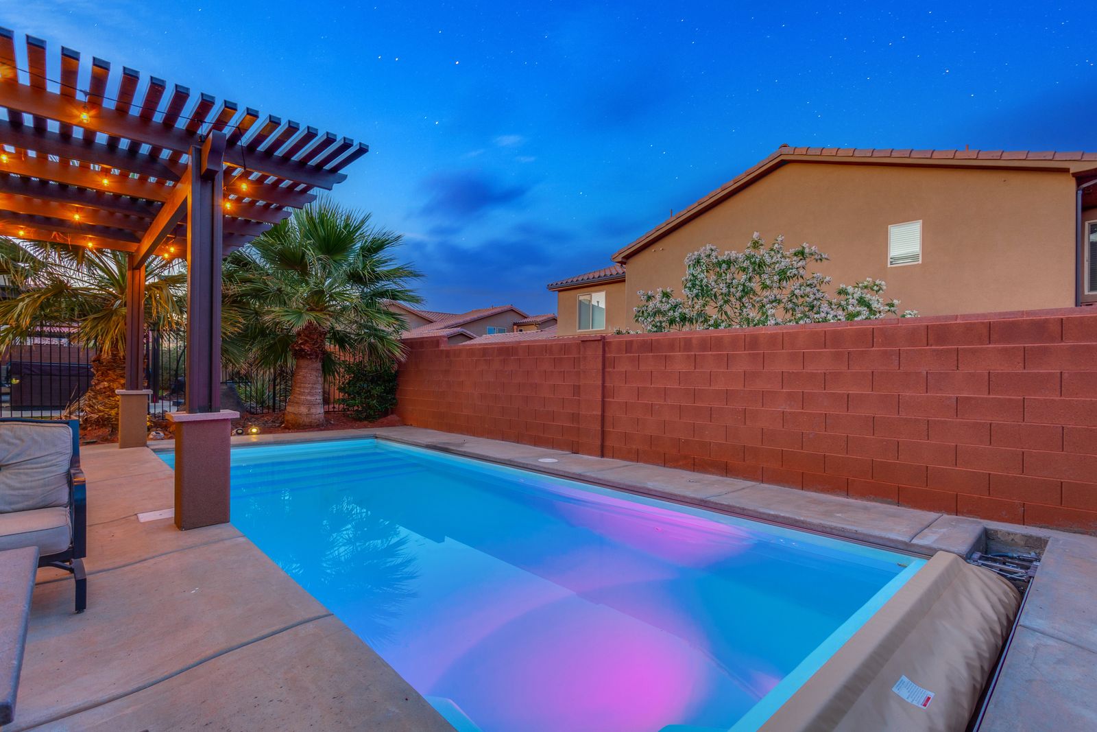 Sunset is a beautiful 7 bedroom / 7.5 bath home that comfortably sleeps 24 guests or up to 26 guests with the assistance of a queen air mattress. Spend your days exploring the nearby National and State Parks, practicing your putt on one of the many golf courses, biking through the desert mountains, or never leave home! With Foosball, Ping pong, cable, 3 Xbox 1’s, and a resort-style pool and water park; you do not need to leave Sunset to have the vacation of your dreams! The expansive, fully equipped kitchen, grill, and indoor and outdoor dining make hosting friends and family a breeze. Grab a cold drink and head up to the balcony to catch a spectacular sunset over the desert mountains. Spend your nights roasting marshmallows around the fire under the starry sky or soaking your tired muscles in your brand new private hot tub and pool with a light show! Host a movie night in one of the two living rooms, both with smart tv and cable, picking a movie everyone will love is easy. Grab some peace and quiet in the comfort of your own room, each with a Smart TV, making it easy to relax! No matter how you spend your vacation, it is bound to be filled with spectacular views and timeless memories made while staying at Sunset!