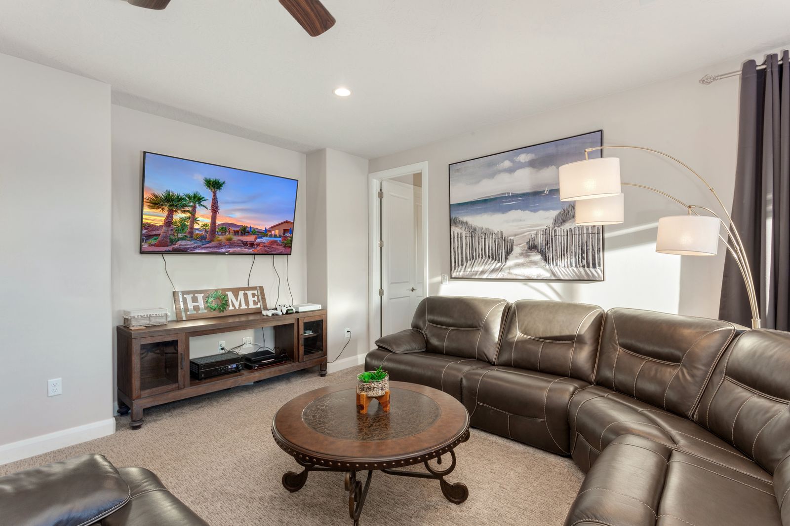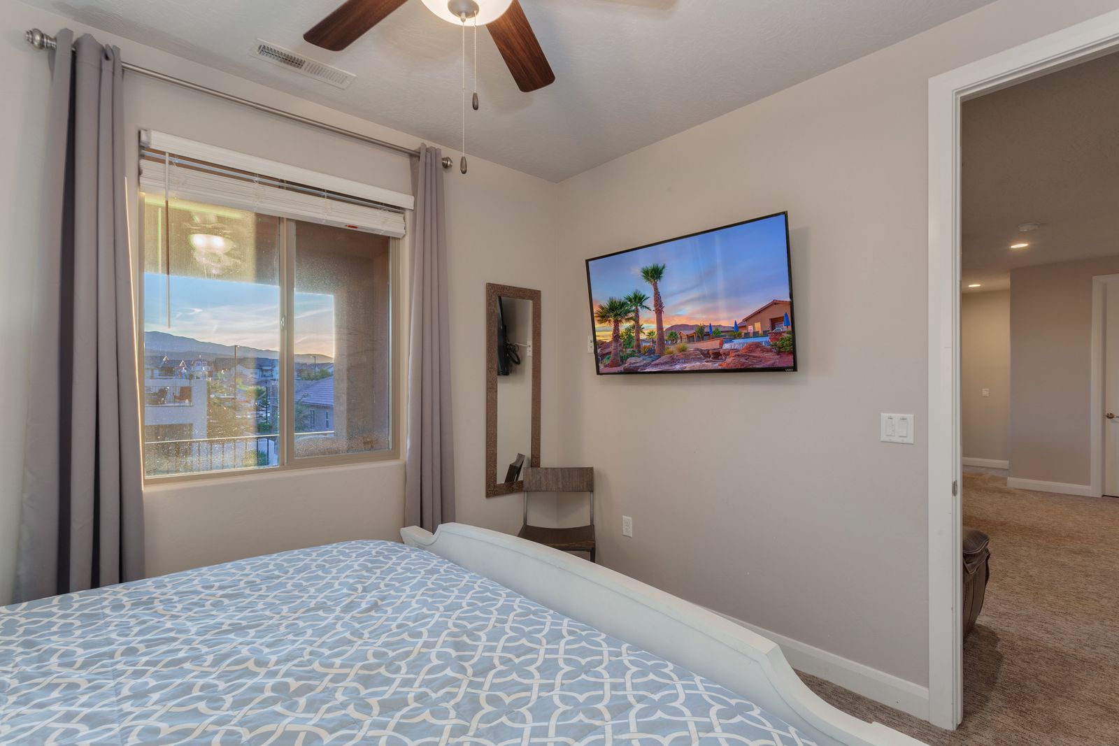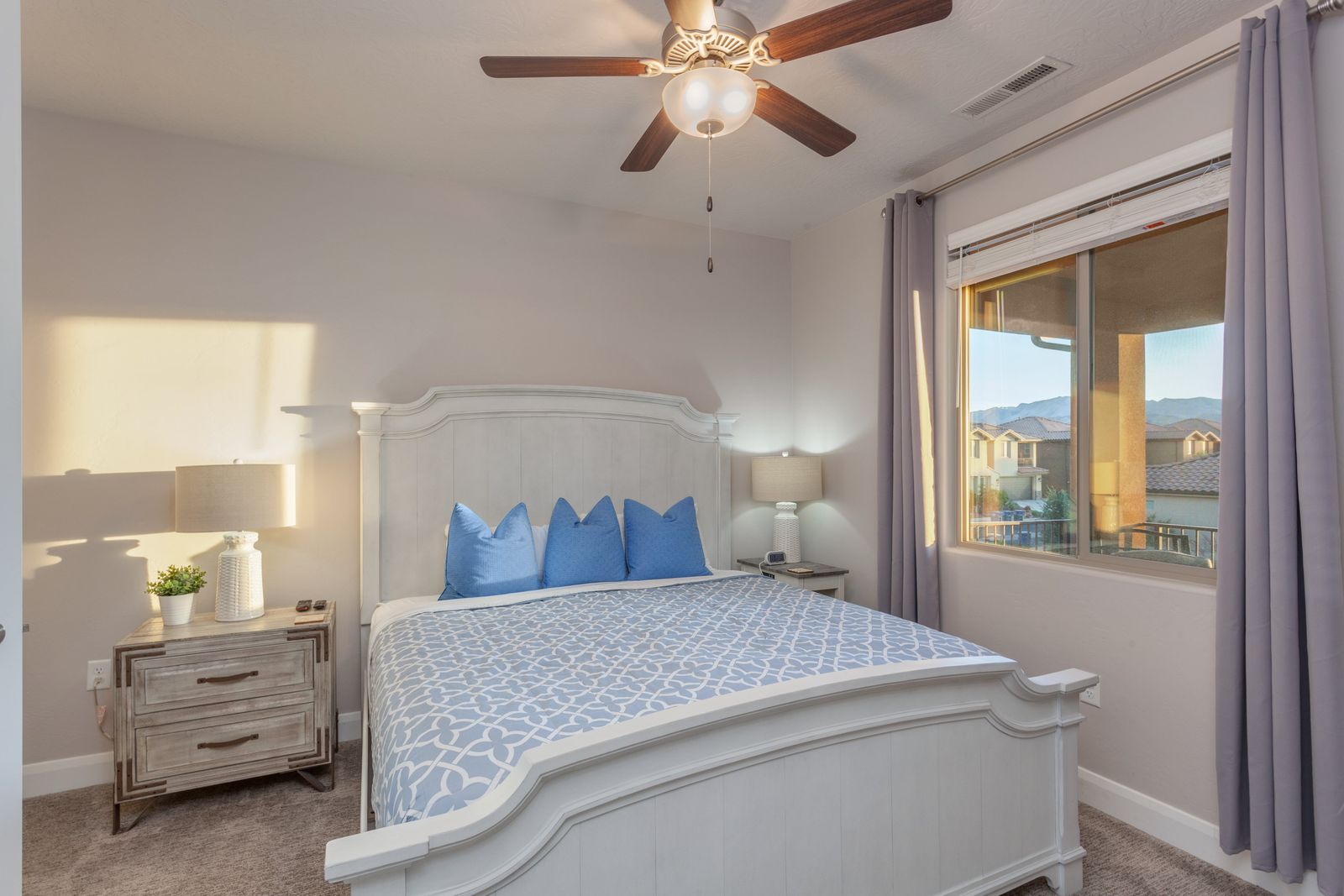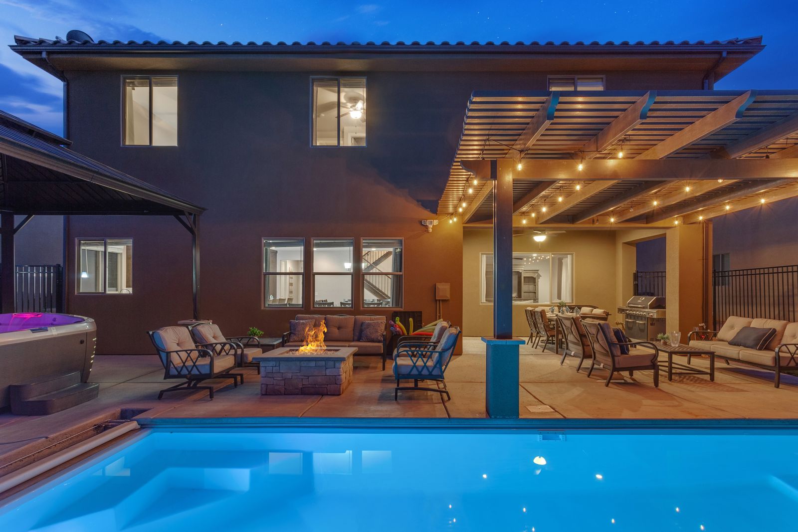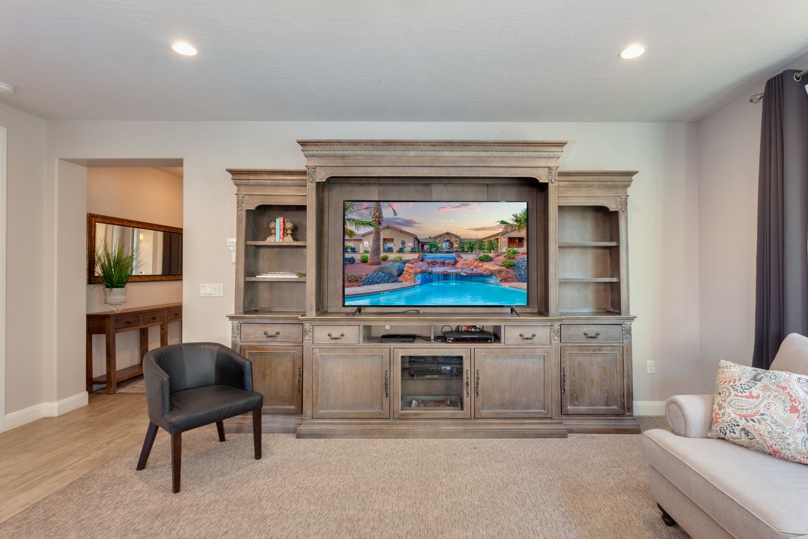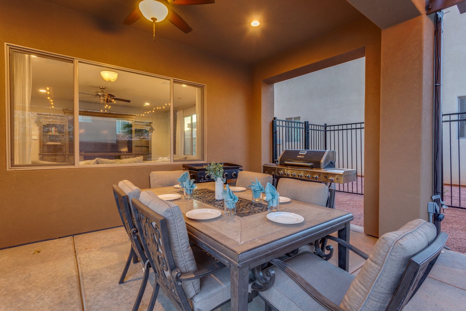Sunset is a beautiful 7 bedroom / 7.5 bath home that comfortably sleeps 24 guests or up to 26 guests with the assistance of a queen air mattress. Spend your days exploring the nearby National and State Parks, practicing your putt on one of the many golf courses, biking through the desert mountains, or never leave home! With Foosball, Ping pong, cable, 3 Xbox 1’s, and a resort-style pool and water park; you do not need to leave Sunset to have the vacation of your dreams! The expansive, fully equipped kitchen, grill, and indoor and outdoor dining make hosting friends and family a breeze. Grab a cold drink and head up to the balcony to catch a spectacular sunset over the desert mountains. Spend your nights roasting marshmallows around the fire under the starry sky or soaking your tired muscles in your brand new private hot tub and pool with a light show! Host a movie night in one of the two living rooms, both with smart tv and cable, picking a movie everyone will love is easy. Grab some peace and quiet in the comfort of your own room, each with a Smart TV, making it easy to relax! No matter how you spend your vacation, it is bound to be filled with spectacular views and timeless memories made while staying at Sunset!
