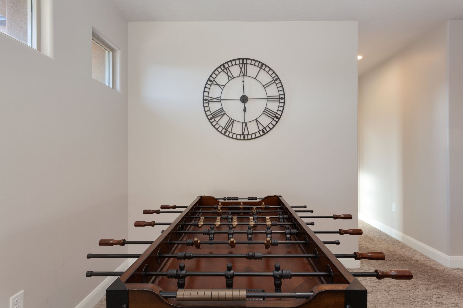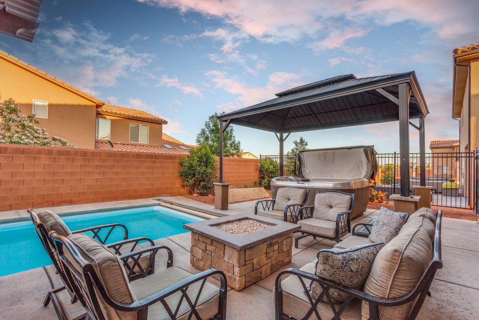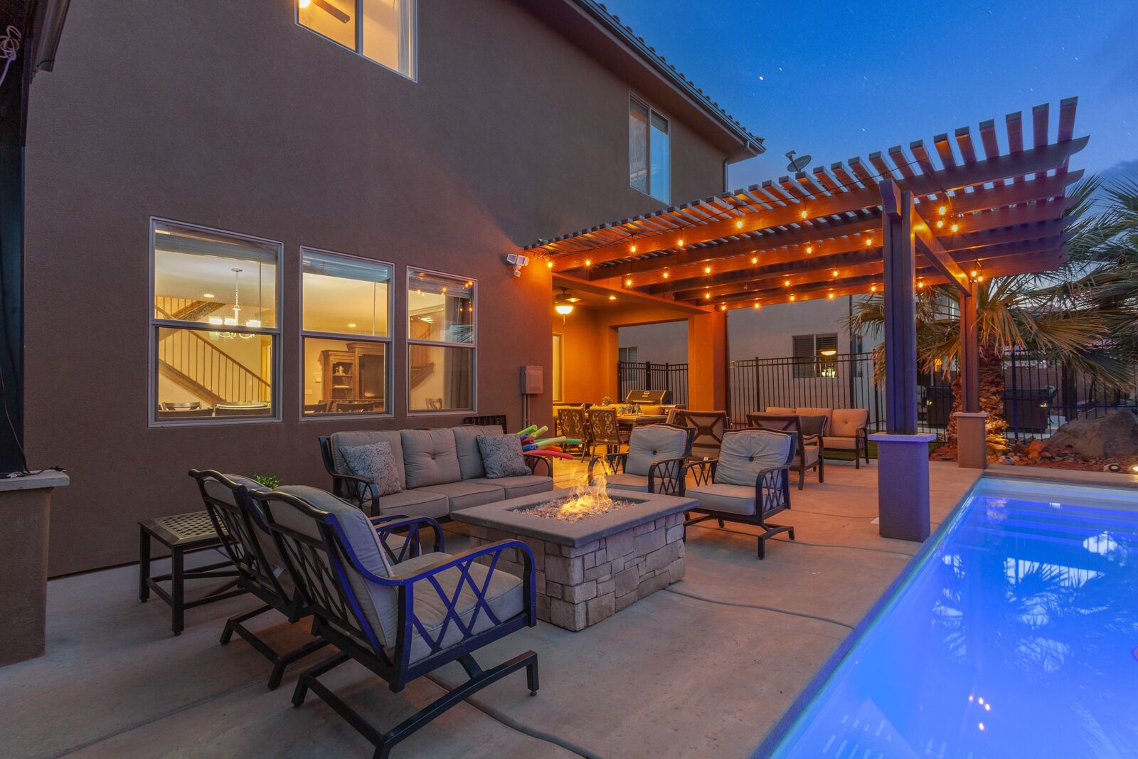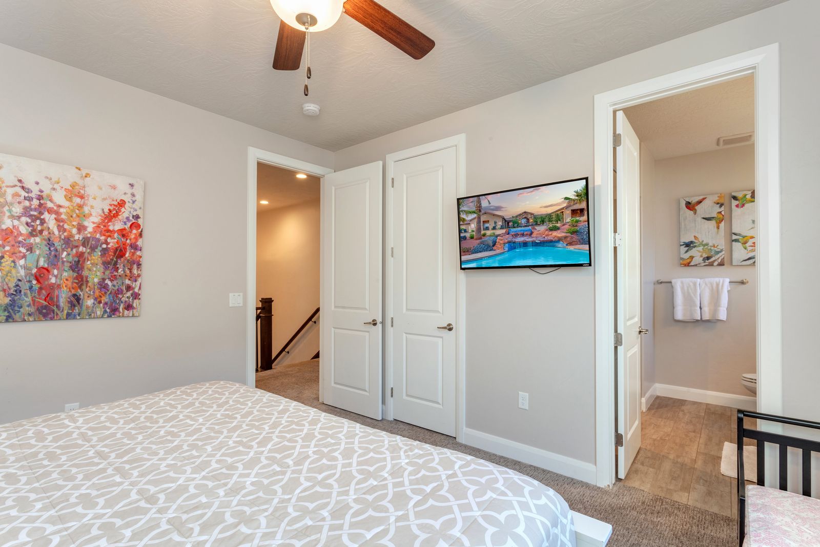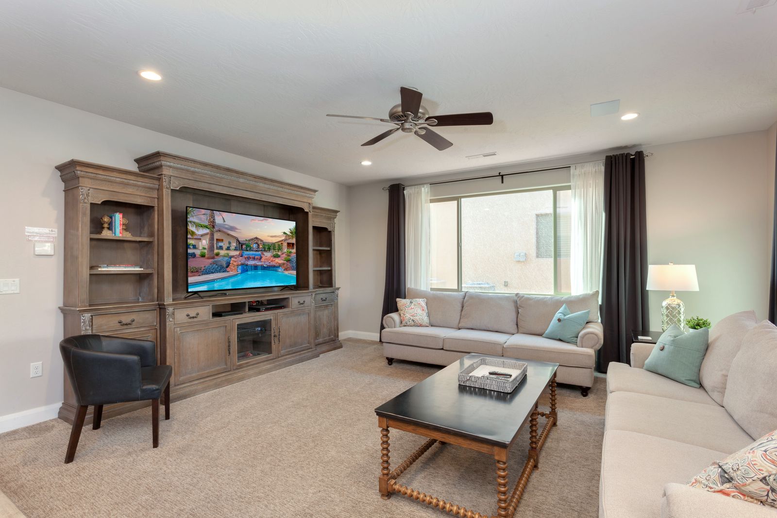 Sunset is a beautiful 7 bedroom / 7.5 bath home that comfortably sleeps 24 guests or up to 26 guests with the assistance of a queen air mattress. Spend your days exploring the nearby National and State Parks, practicing your putt on one of the many golf courses, biking through the desert mountains, or never leave home! With Foosball, Ping pong, cable, 3 Xbox 1’s, and a resort-style pool and water park; you do not need to leave Sunset to have the vacation of your dreams! The expansive, fully equipped kitchen, grill, and indoor and outdoor dining make hosting friends and family a breeze. Grab a cold drink and head up to the balcony to catch a spectacular sunset over the desert mountains. Spend your nights roasting marshmallows around the fire under the starry sky or soaking your tired muscles in your brand new private hot tub and pool with a light show! Host a movie night in one of the two living rooms, both with smart tv and cable, picking a movie everyone will love is easy. Grab some peace and quiet in the comfort of your own room, each with a Smart TV, making it easy to relax! No matter how you spend your vacation, it is bound to be filled with spectacular views and timeless memories made while staying at Sunset!