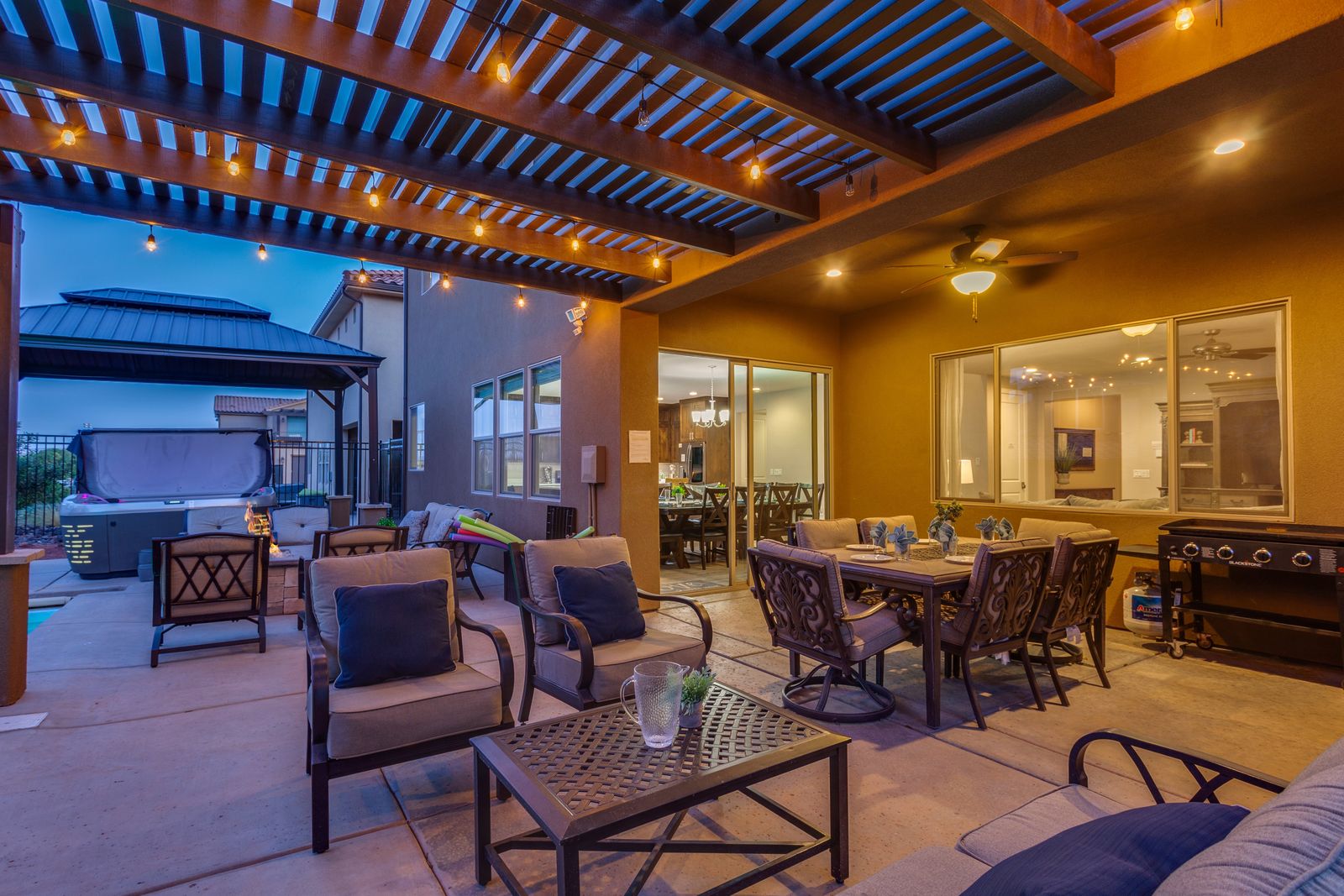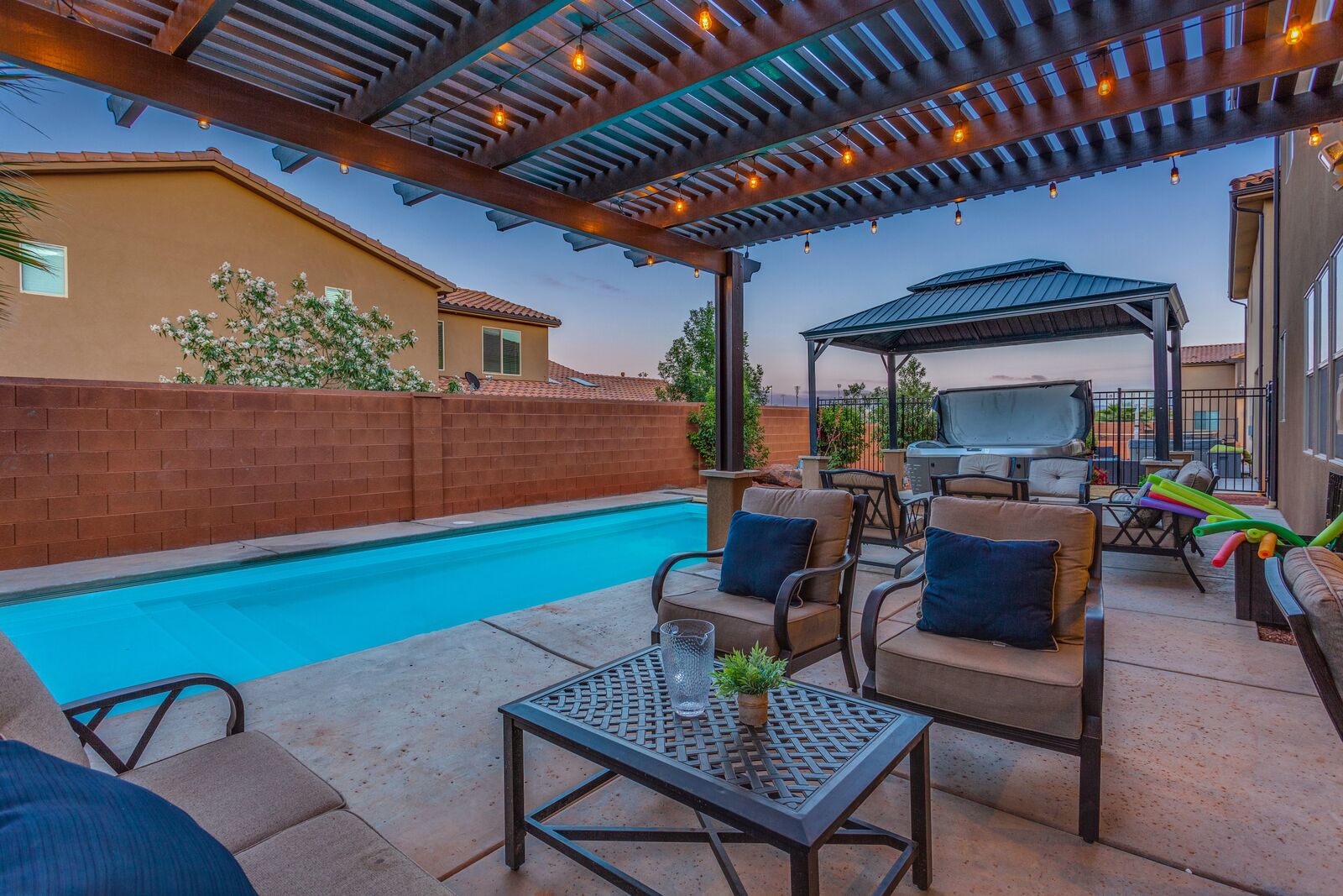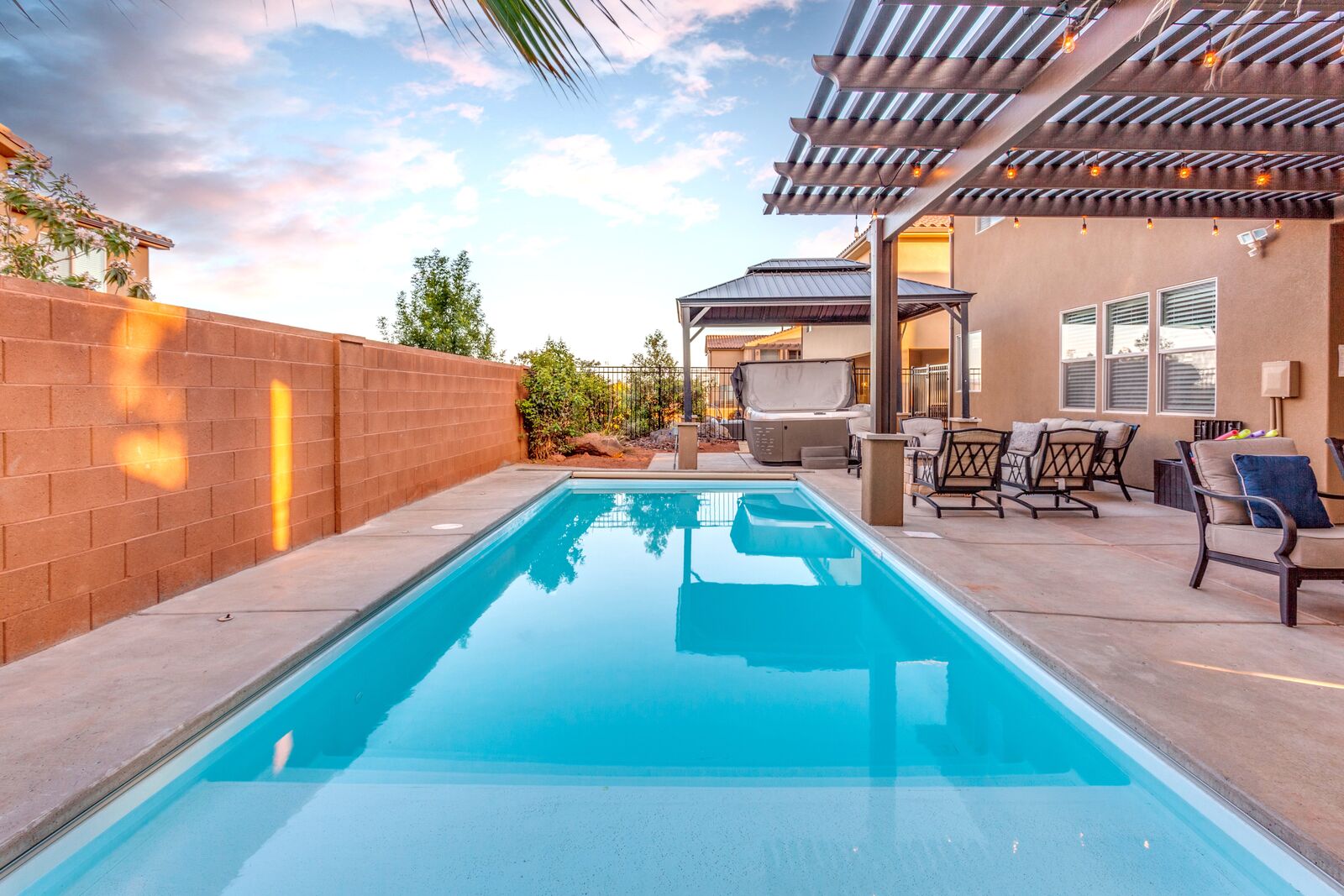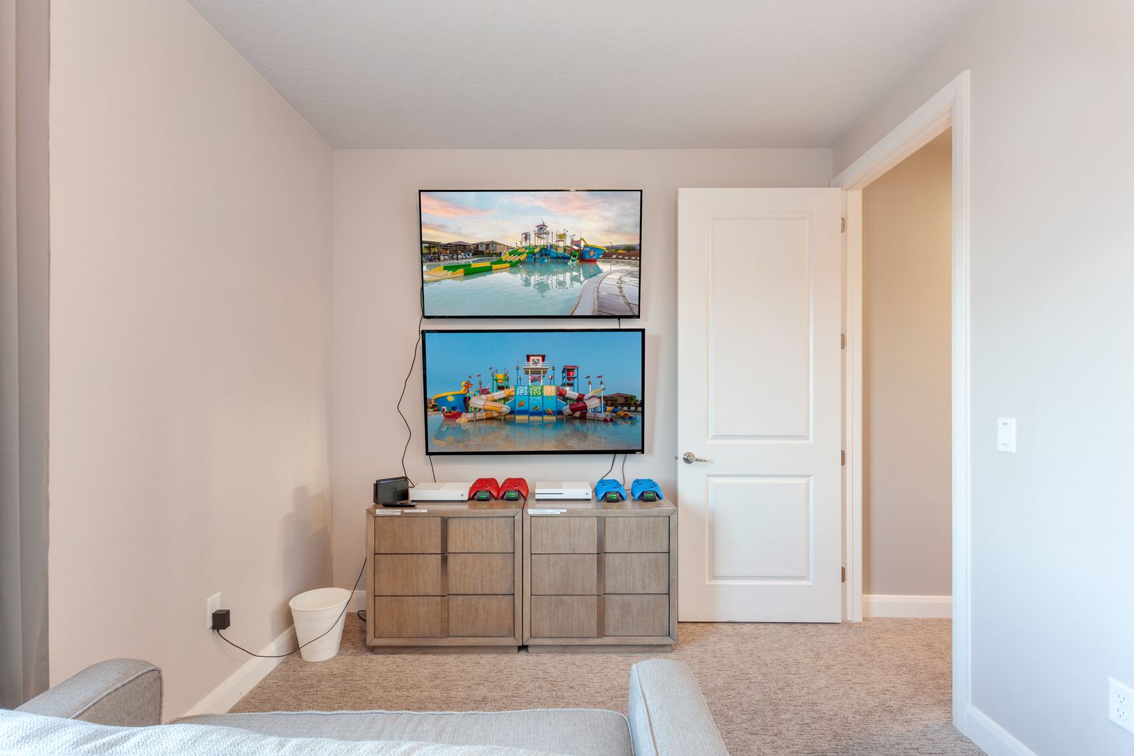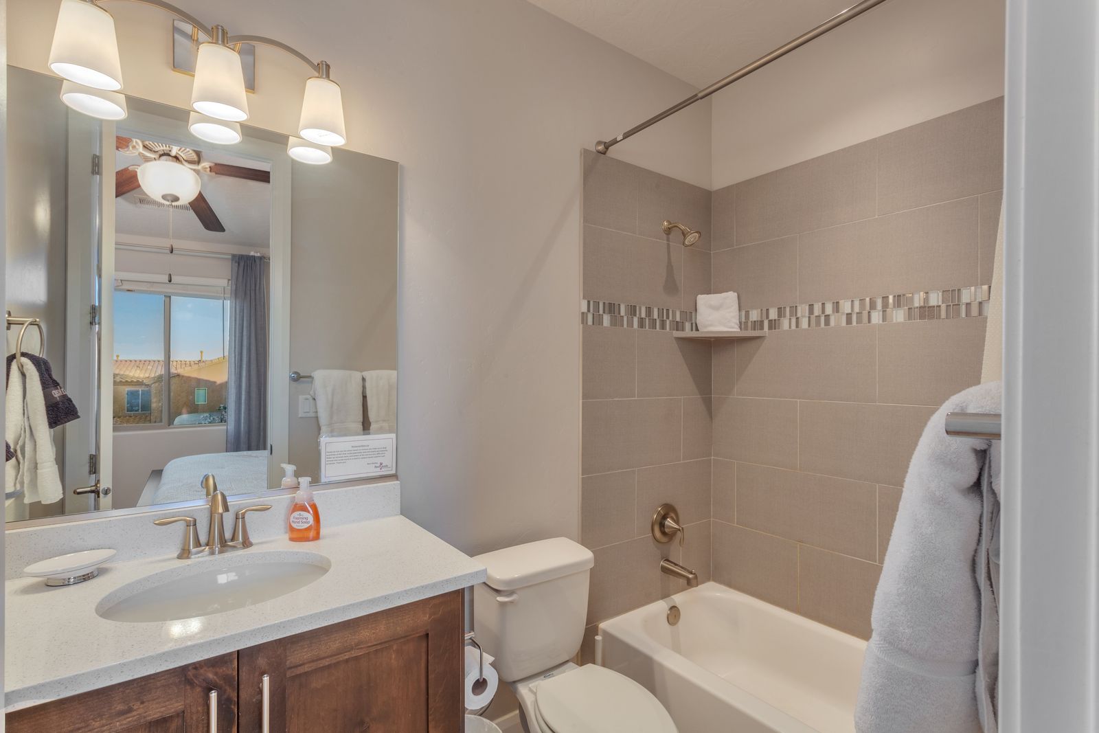 Sunset is a beautiful 7 bedroom / 7.5 bath home that comfortably sleeps 24 guests or up to 26 guests with the assistance of a queen air mattress. Spend your days exploring the nearby National and State Parks, practicing your putt on one of the many golf courses, biking through the desert mountains, or never leave home! With Foosball, Ping pong, cable, 3 Xbox 1’s, and a resort-style pool and water park; you do not need to leave Sunset to have the vacation of your dreams! The expansive, fully equipped kitchen, grill, and indoor and outdoor dining make hosting friends and family a breeze. Grab a cold drink and head up to the balcony to catch a spectacular sunset over the desert mountains. Spend your nights roasting marshmallows around the fire under the starry sky or soaking your tired muscles in your brand new private hot tub and pool with a light show! Host a movie night in one of the two living rooms, both with smart tv and cable, picking a movie everyone will love is easy. Grab some peace and quiet in the comfort of your own room, each with a Smart TV, making it easy to relax! No matter how you spend your vacation, it is bound to be filled with spectacular views and timeless memories made while staying at Sunset!