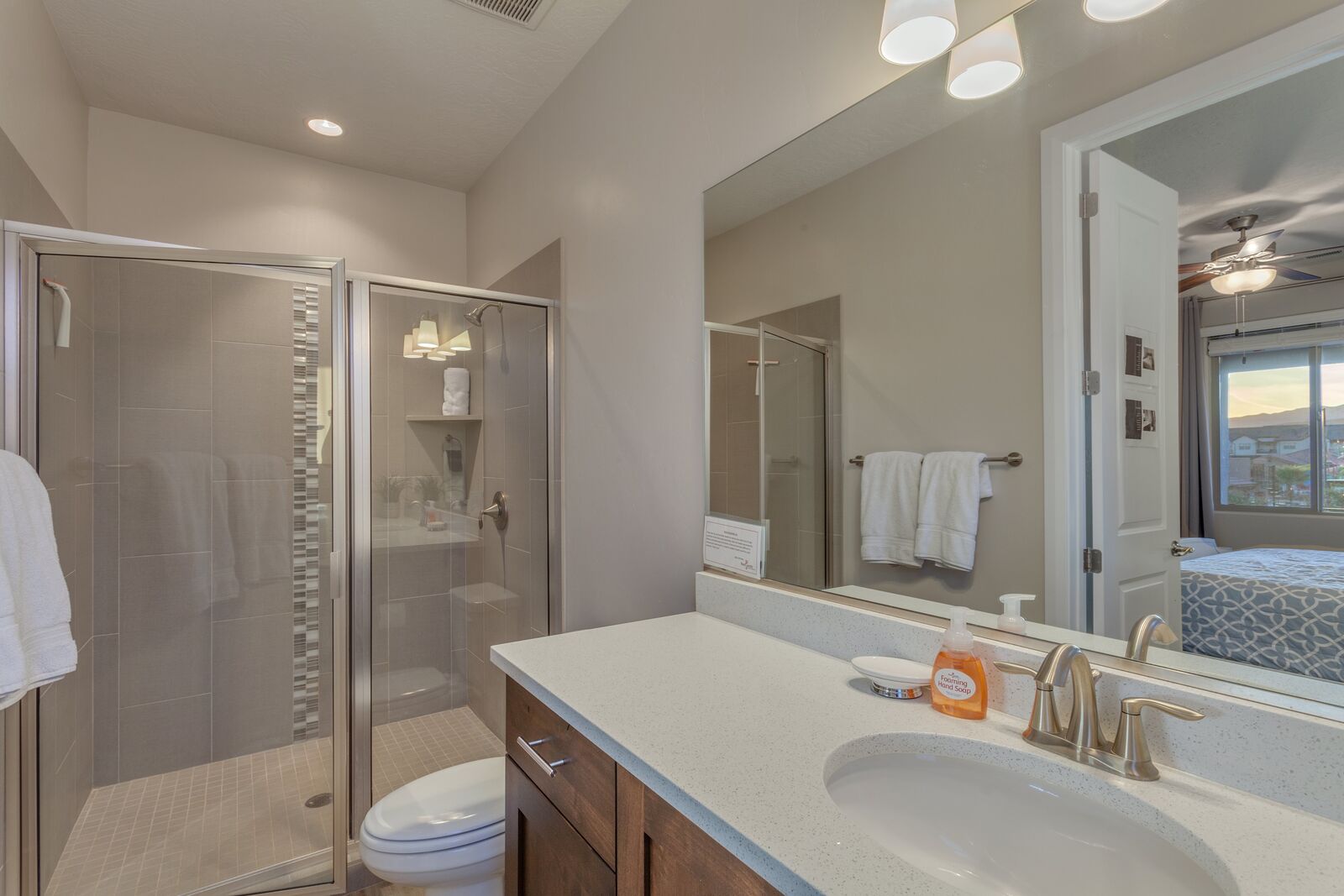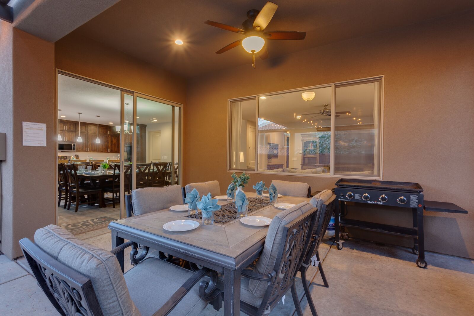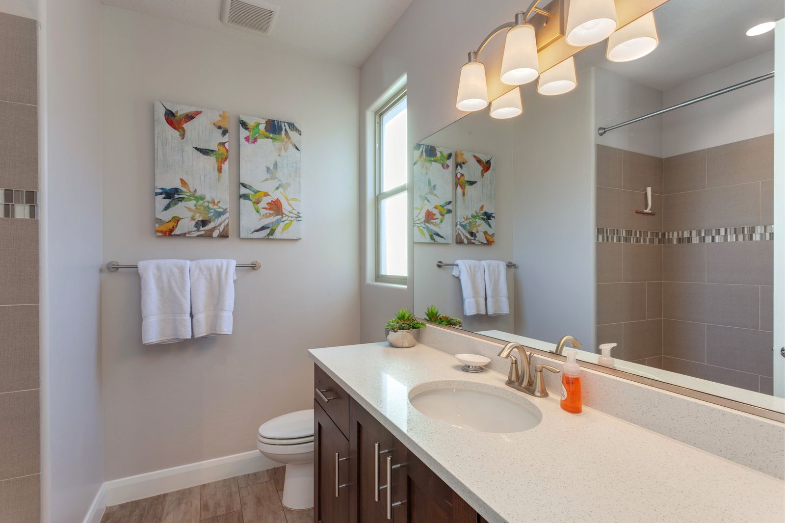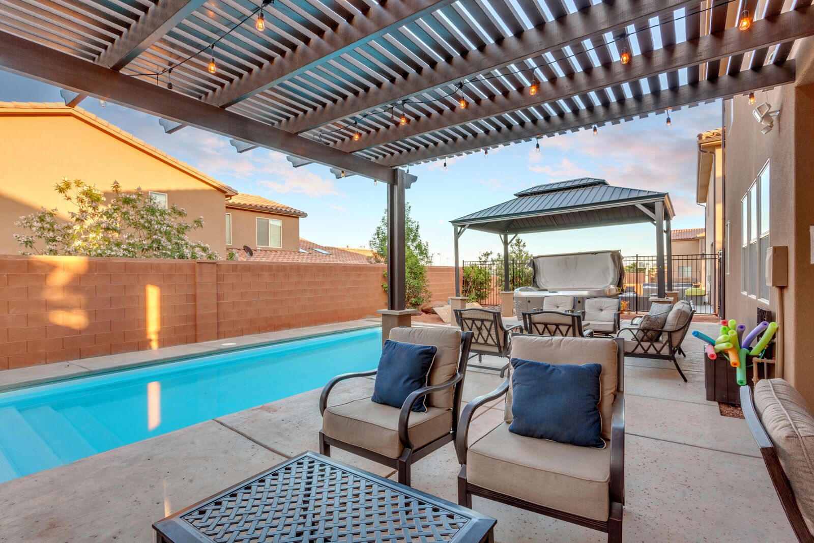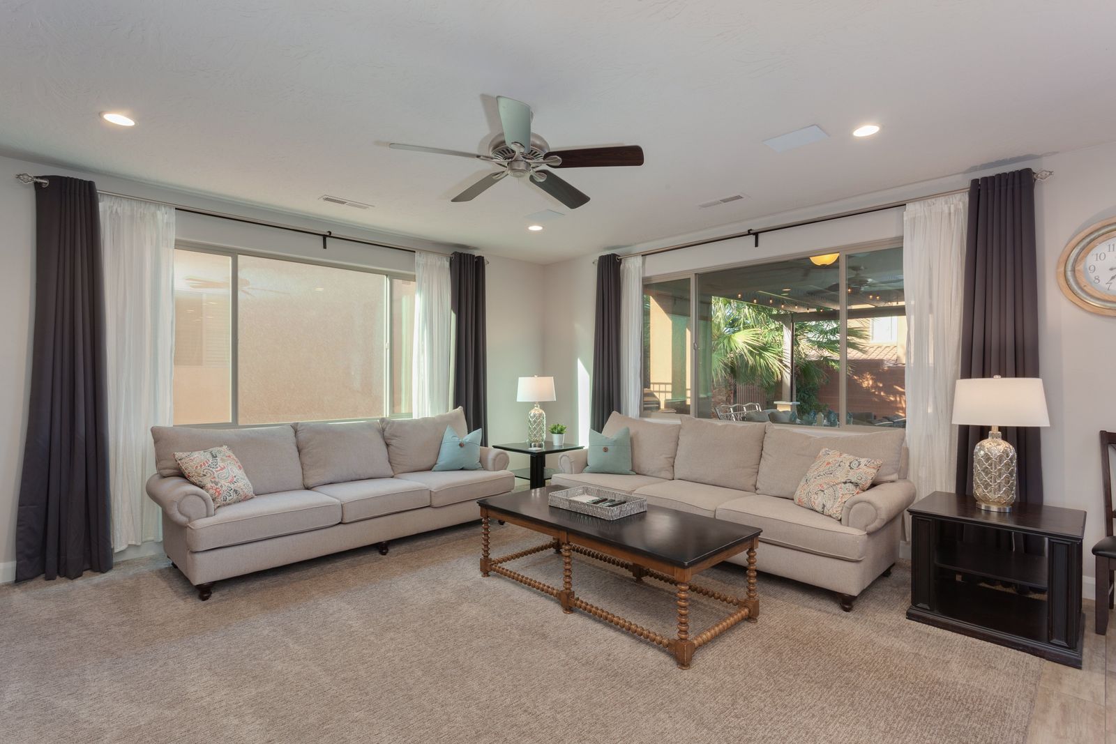 Sunset is a beautiful 7 bedroom / 7.5 bath home that comfortably sleeps 24 guests or up to 26 guests with the assistance of a queen air mattress. Spend your days exploring the nearby National and State Parks, practicing your putt on one of the many golf courses, biking through the desert mountains, or never leave home! With Foosball, Ping pong, cable, 3 Xbox 1’s, and a resort-style pool and water park; you do not need to leave Sunset to have the vacation of your dreams! The expansive, fully equipped kitchen, grill, and indoor and outdoor dining make hosting friends and family a breeze. Grab a cold drink and head up to the balcony to catch a spectacular sunset over the desert mountains. Spend your nights roasting marshmallows around the fire under the starry sky or soaking your tired muscles in your brand new private hot tub and pool with a light show! Host a movie night in one of the two living rooms, both with smart tv and cable, picking a movie everyone will love is easy. Grab some peace and quiet in the comfort of your own room, each with a Smart TV, making it easy to relax! No matter how you spend your vacation, it is bound to be filled with spectacular views and timeless memories made while staying at Sunset!