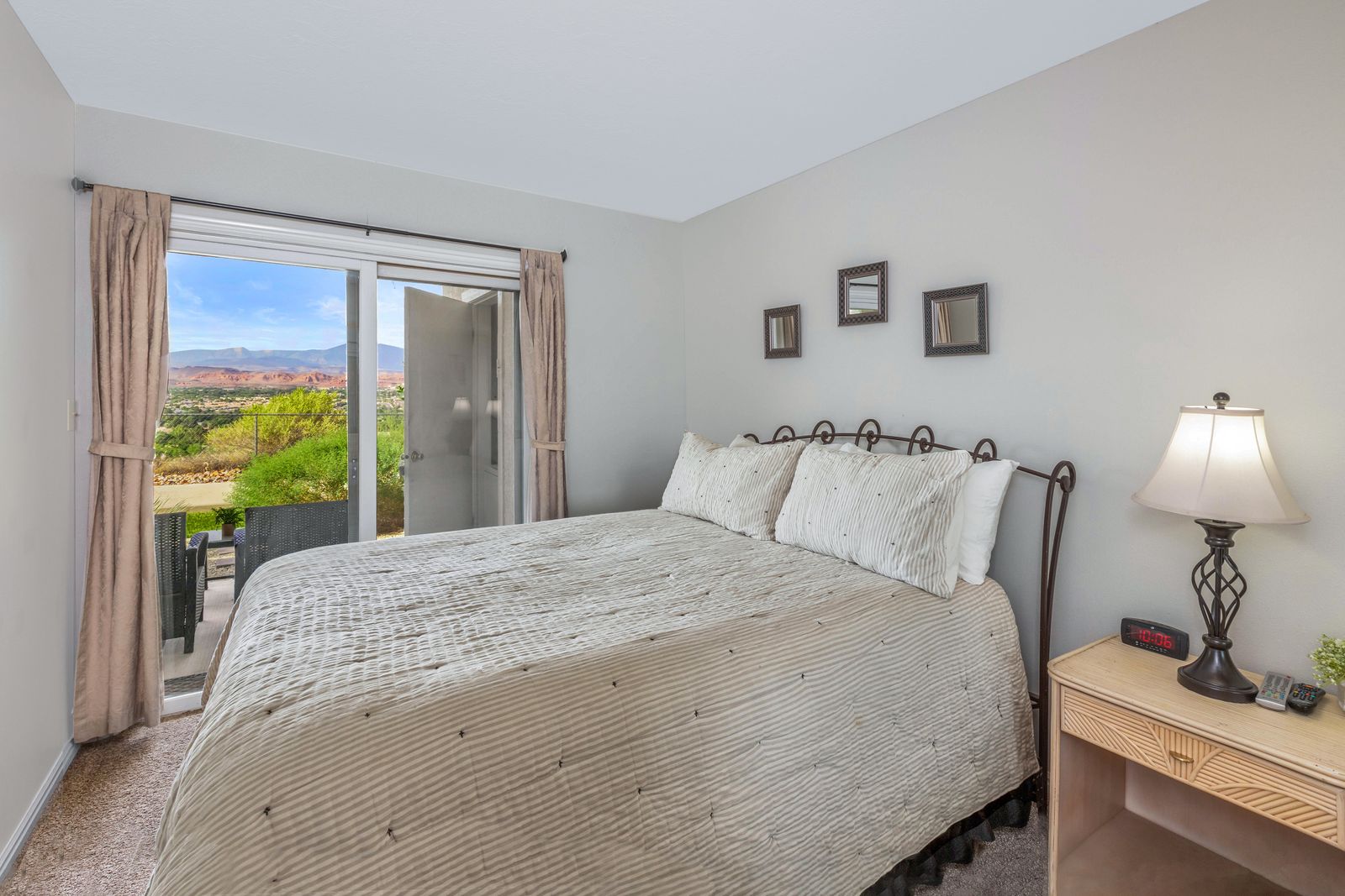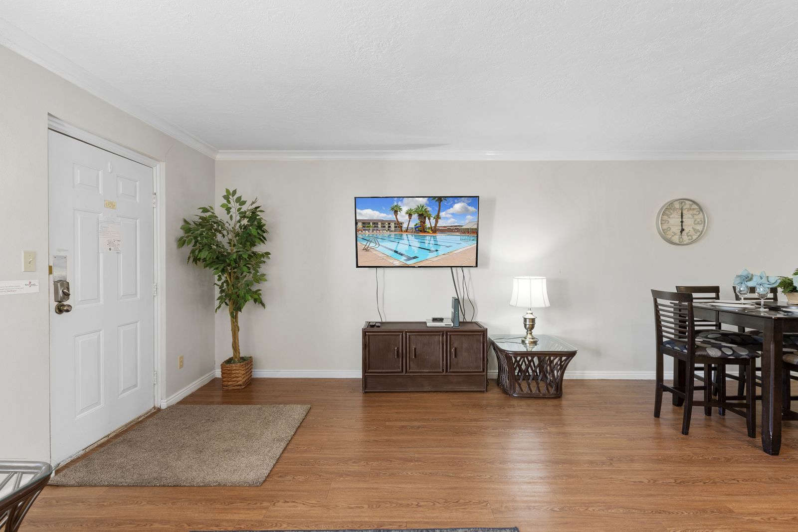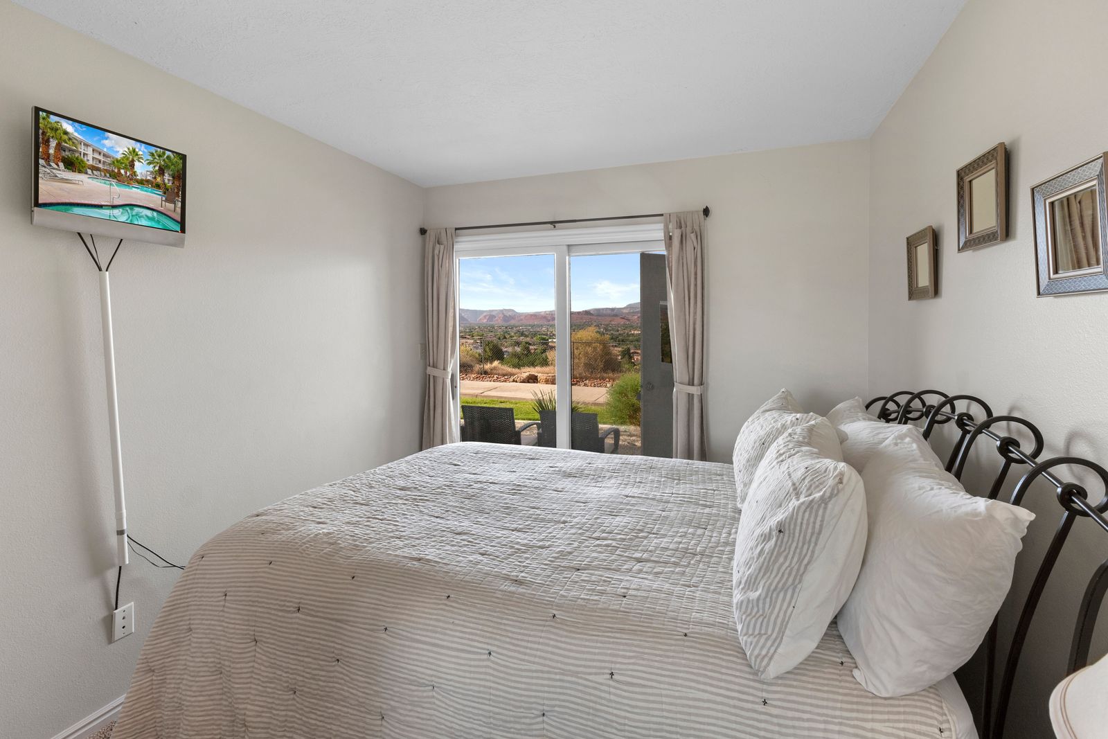 Sunrise Palms is a 2 bedroom / 1 bath condo that comfortably accommodates 4 guests; however, it can accommodate up to 6 guests with the assistance of a queen air mattress. Wake up early feeling refreshed from spending the night on brand new 5-star mattresses! Mornings will quickly become your favorite time of day, as you sip a hot cup of coffee and watch the desert sunrise up over the mountains on the balcony. After a quiet morning alone, head out on a quick adventure! Multiple National and State parks are a short drive away, or Downtown St. George is always a great place to shop and have lunch. Come back to Sunrise Palms and lounge poolside under the palms at one of the outdoor pools. The kids will love being able to swim, splash around in the splash pad, and play many outdoor games offered by Las Palmas; you might not get them to come back inside! Wrap up the day barbecuing on the back patio, enjoying each other’s company, and watching the sunset over the town. After a long day in the sun, make a bowl of popcorn and settle in for a good movie in the living room; with a Smart TV and DVD player, finding a movie everyone can agree on has never been easier. By the time you leave Sunrise Palms, you will feel rejuvenated and refreshed!