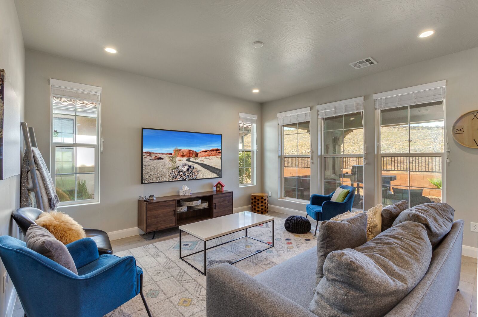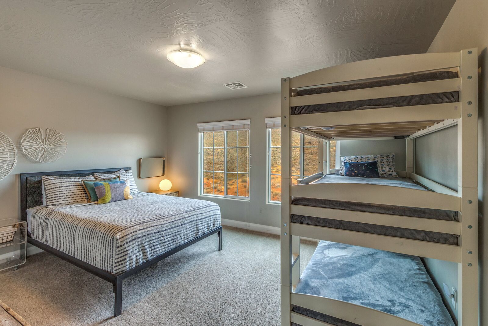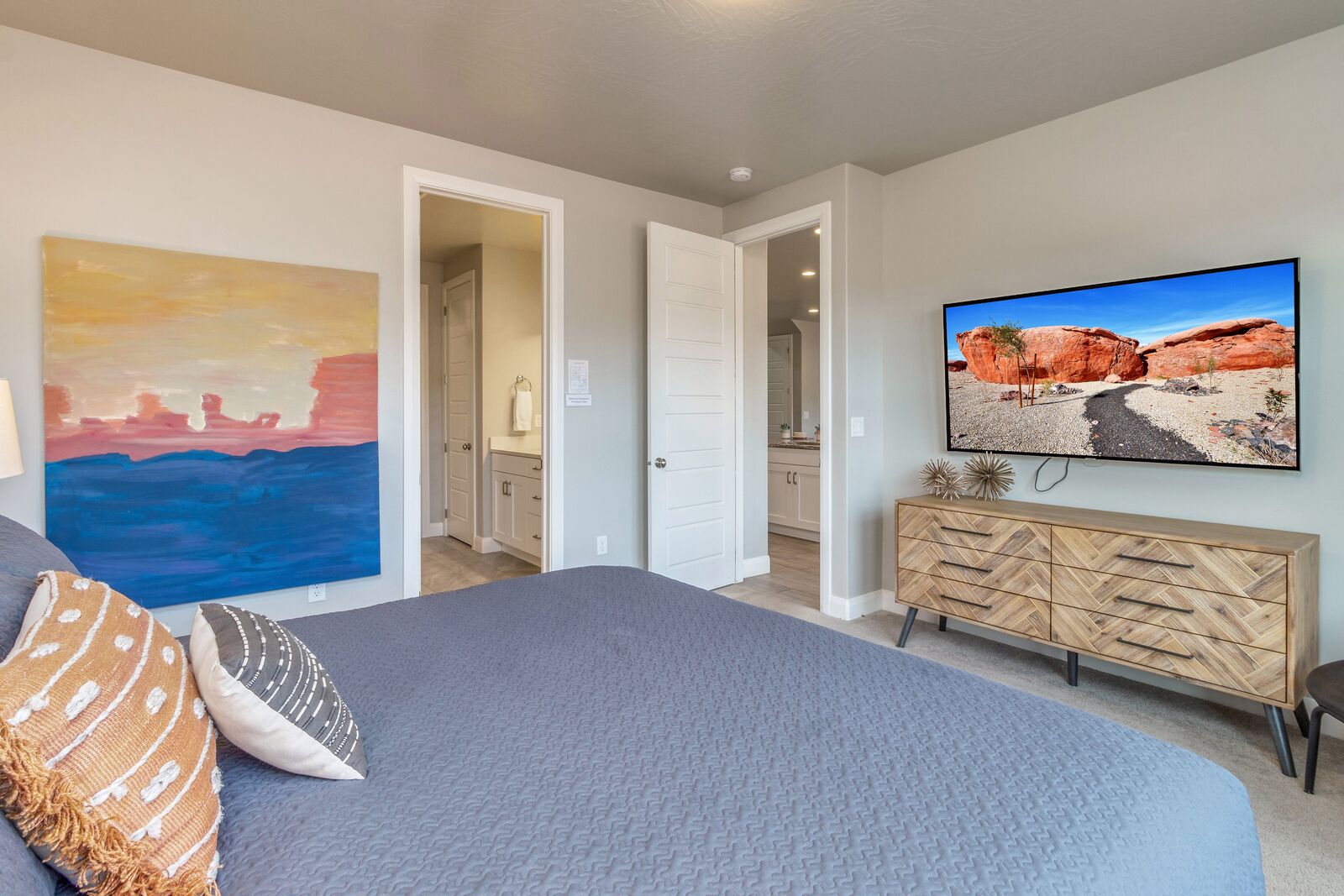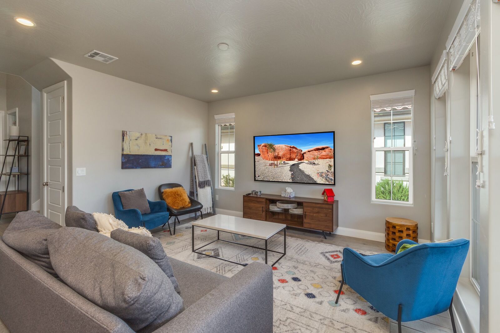 This newly built 4 bedroom / 4 bath townhome, can comfortably sleep up to 11 guests comfortably or 13 with additional bedding. Situated right off the I-15, this home is in the perfect location for day trips to one of the many National or State parks. Spend your day exploring the nearby hills or lounging by the pool! Back at home, challenge each other to a ping pong tournament or to games on the Xbox 1. Enjoy a relaxing evening on your back porch barbequing, enjoying each other's company, while the kids play in the playroom under the stairs. With a porta-crib in every room, this home is perfect for families! Host a family movie night on the Smart TV upstairs, with a DVD player and movies provided. Whether you adventure through the mountains, lounge by the pool, or stay home; This is the place for you!