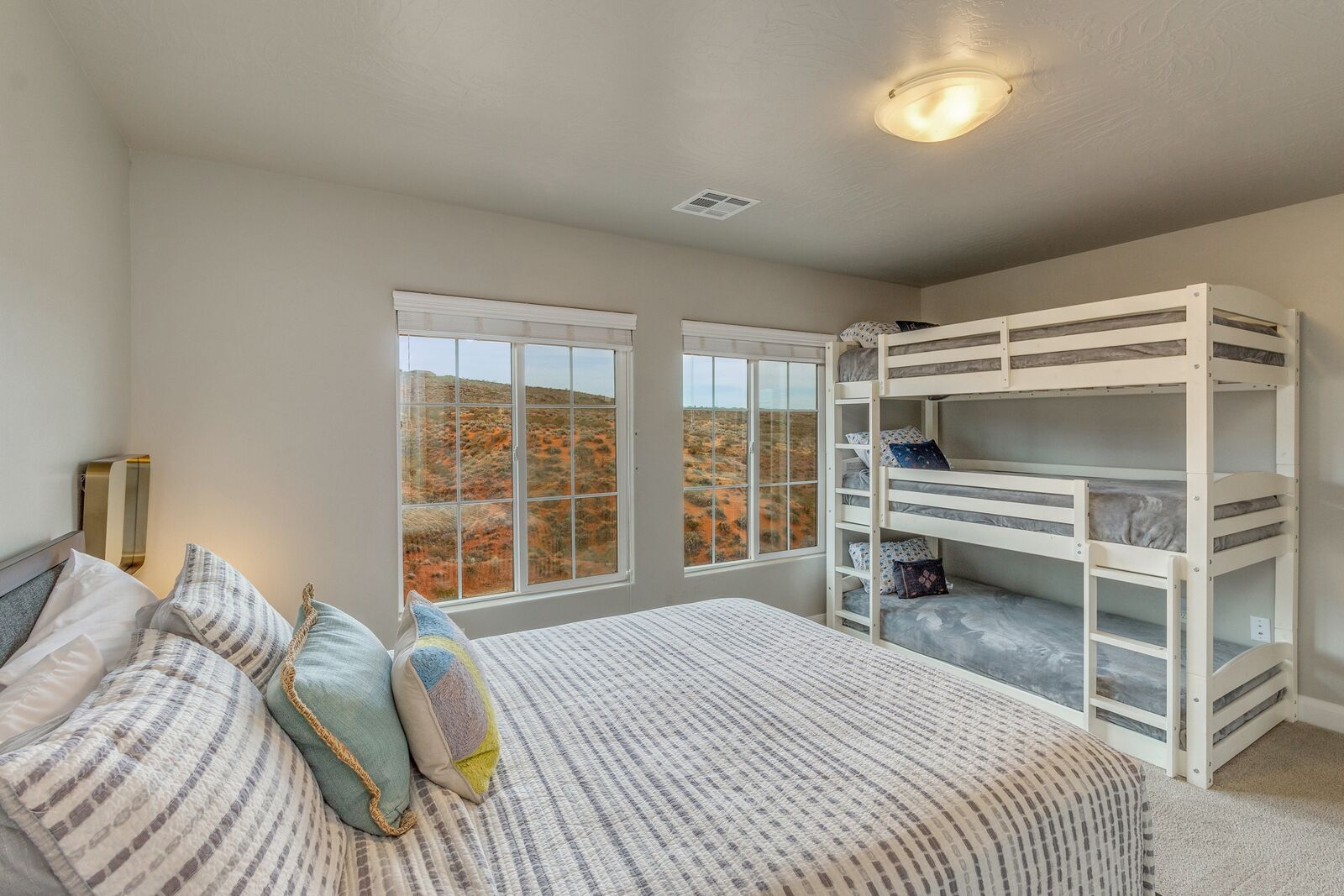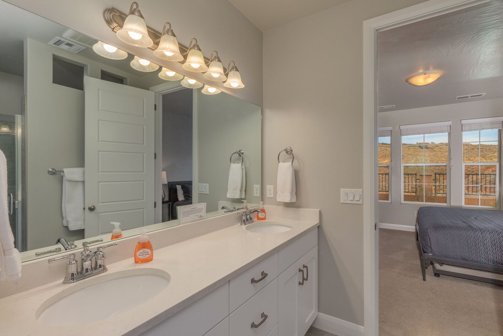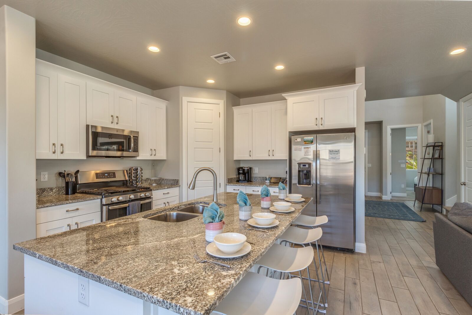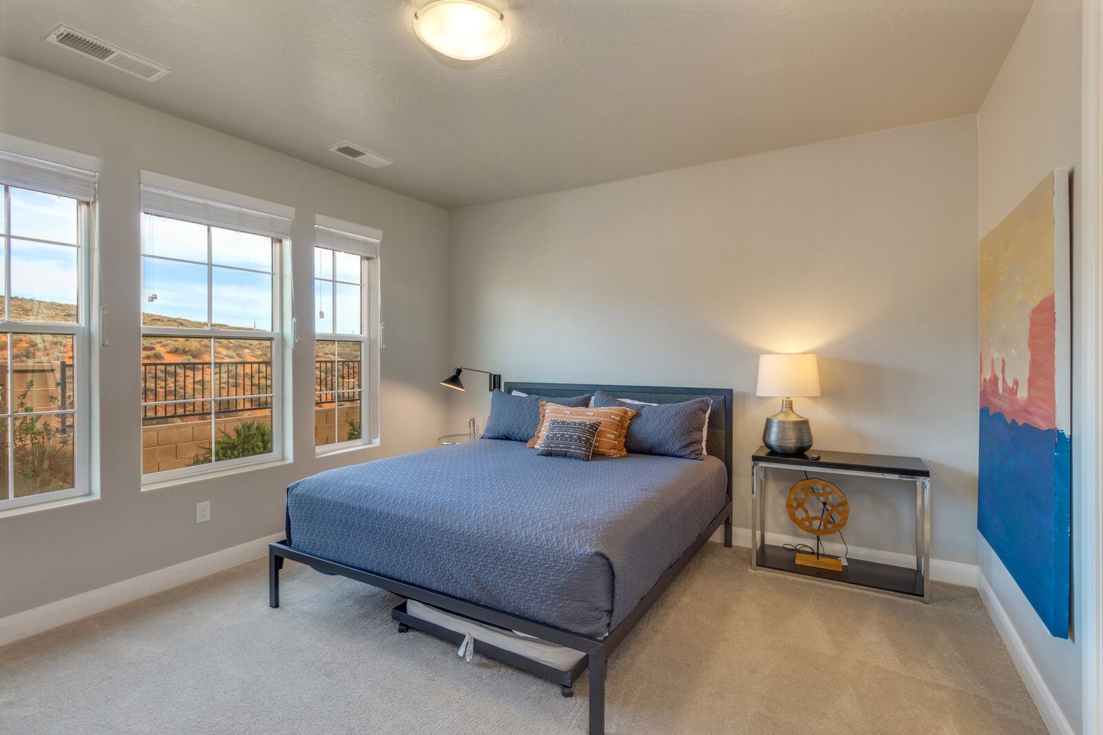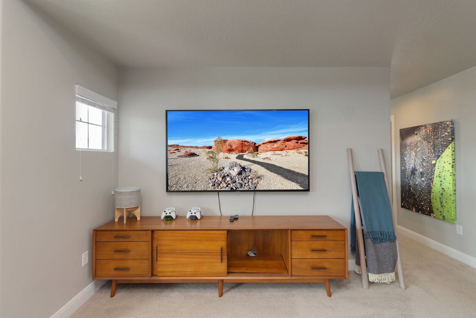 This newly built 4 bedroom / 4 bath townhome, can comfortably sleep up to 11 guests comfortably or 13 with additional bedding. Situated right off the I-15, this home is in the perfect location for day trips to one of the many National or State parks. Spend your day exploring the nearby hills or lounging by the pool! Back at home, challenge each other to a ping pong tournament or to games on the Xbox 1. Enjoy a relaxing evening on your back porch barbequing, enjoying each other's company, while the kids play in the playroom under the stairs. With a porta-crib in every room, this home is perfect for families! Host a family movie night on the Smart TV upstairs, with a DVD player and movies provided. Whether you adventure through the mountains, lounge by the pool, or stay home; This is the place for you!