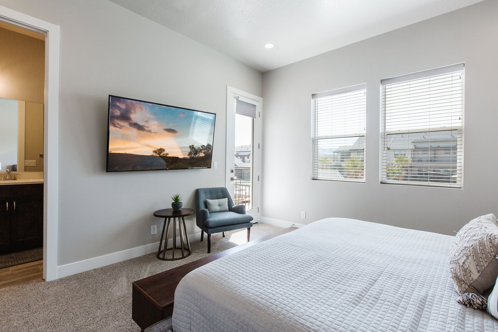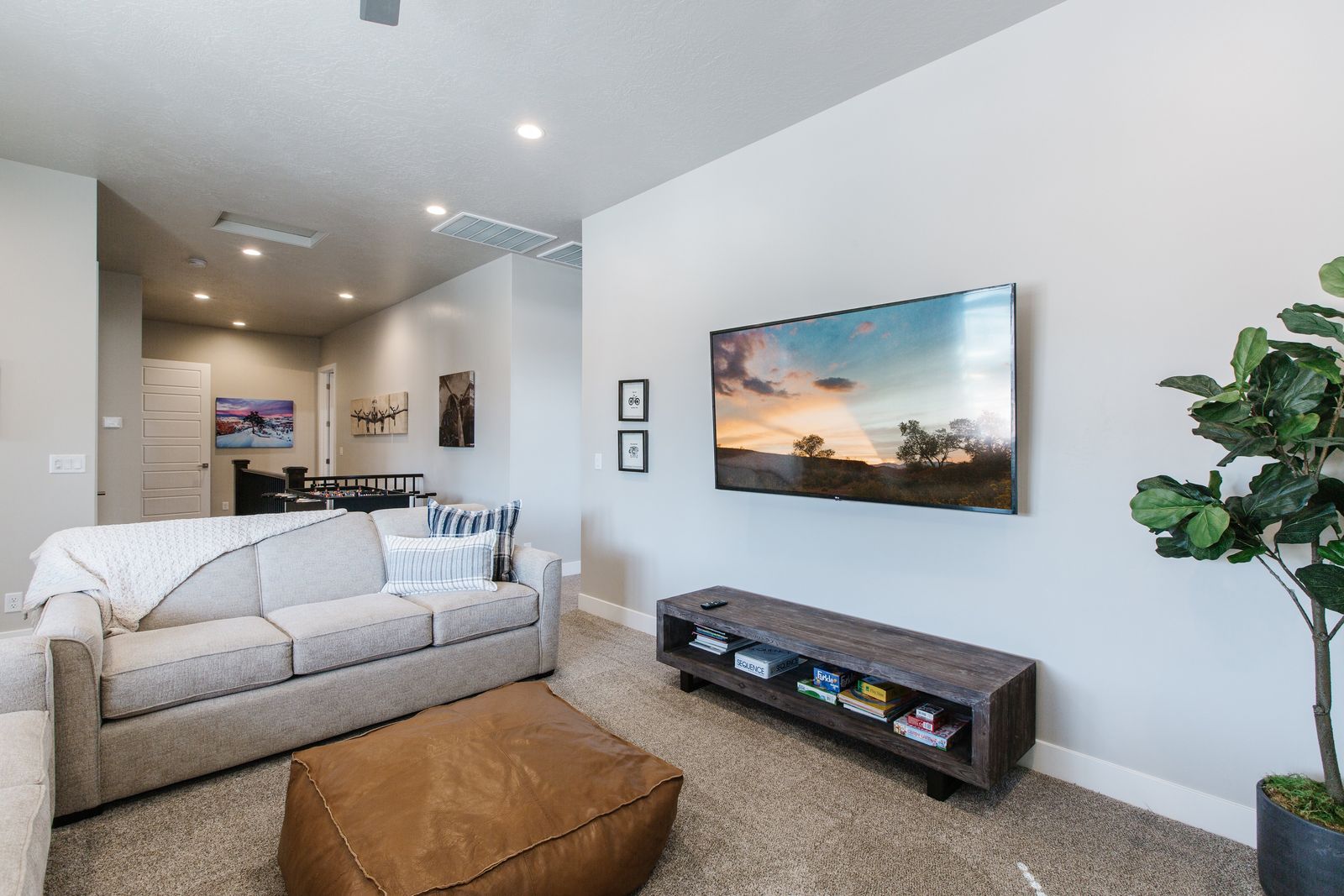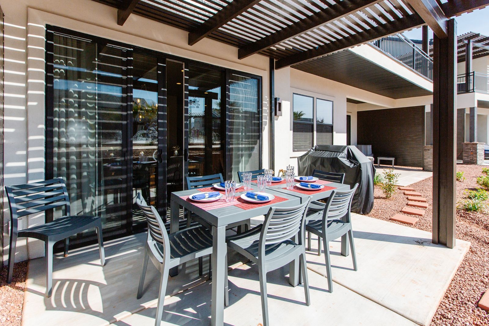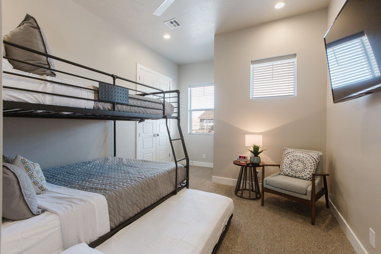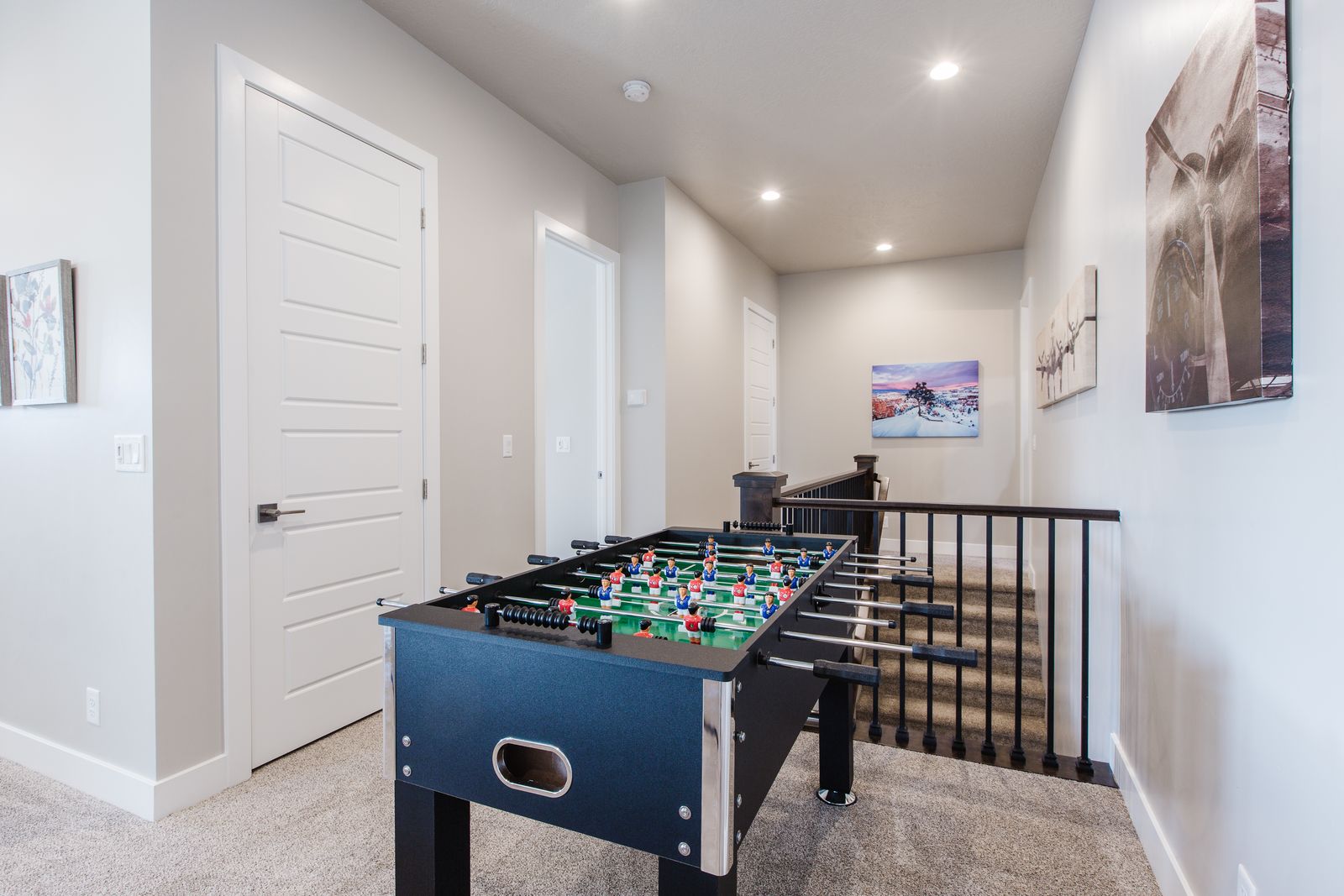 This beautiful 5 bedroom / 5 bath townhome spares nothing when it comes to comfort and entertainment. Park Place can comfortably sleep 16 guests, additional sleeping arrangements are available for up to 20 guests. Sip on a hot cup of coffee and watch the sunrise from your balcony with beautiful mountain views. Spend your days exploring the surrounding area; hike through Snow Canyon, bike along with one of the many bike trails, or go fishing out at Gunlock Reservoir. If exploration is not your forte, do not worry! Spend your day lounging next to the Resort-style pool, cool off in the lazy river, or challenge someone to a pickleball tournament. While the hot desert sunsets, barbeque dinner on the back porch with a cold drink in hand. Host a game night with the board games, and PS4 or have a foosball or ping pong tournament! End the night laughing and roasting marshmallows under the desert sky, lit up with stars. No activity is out of reach at Park Place!