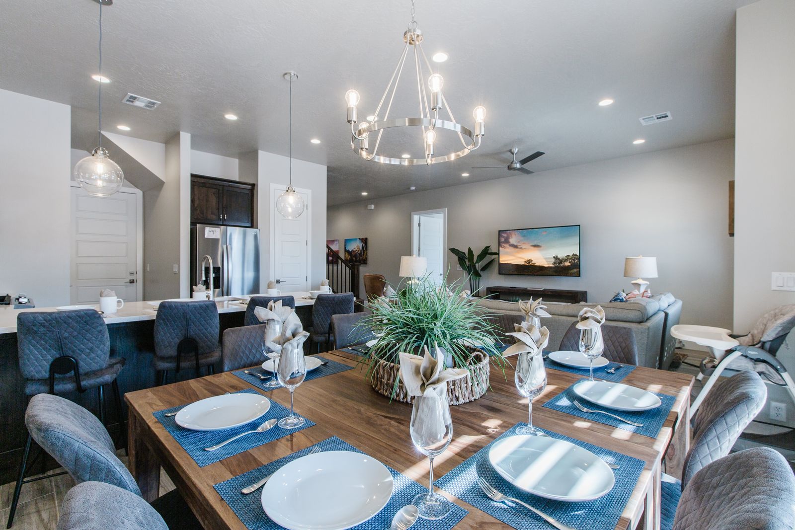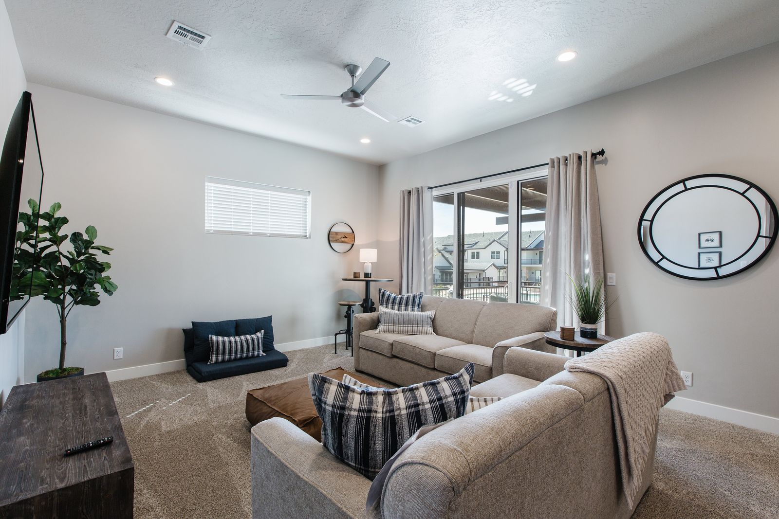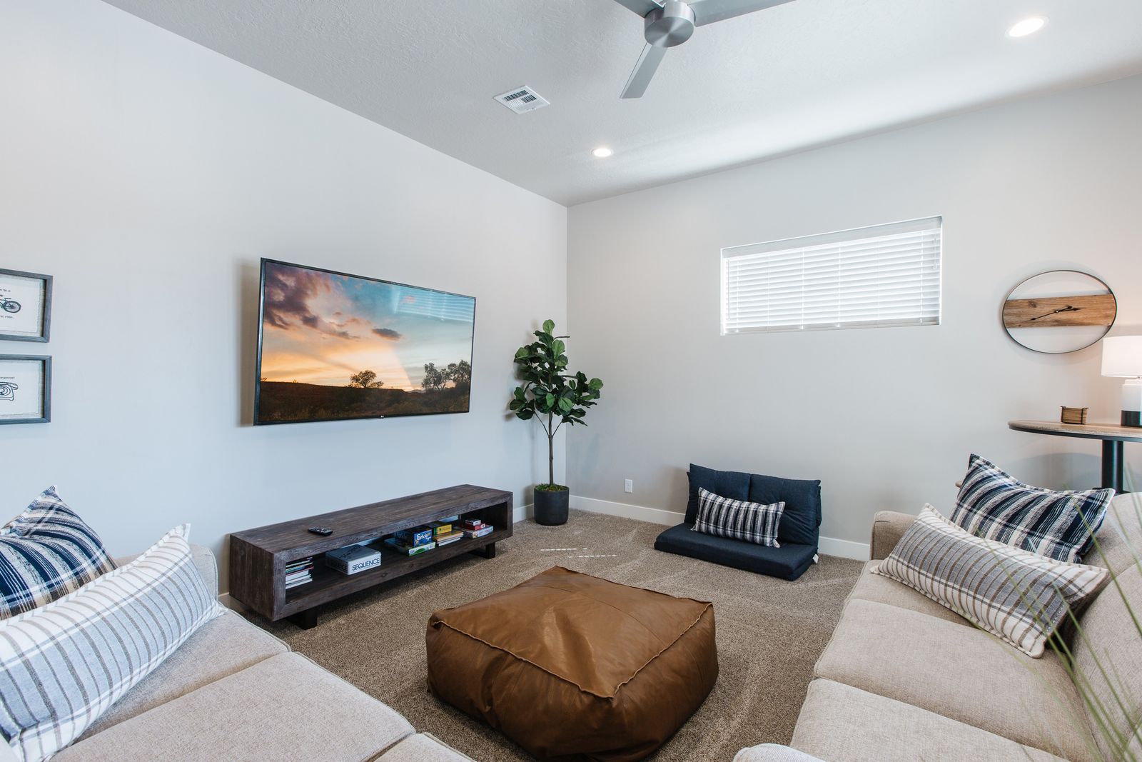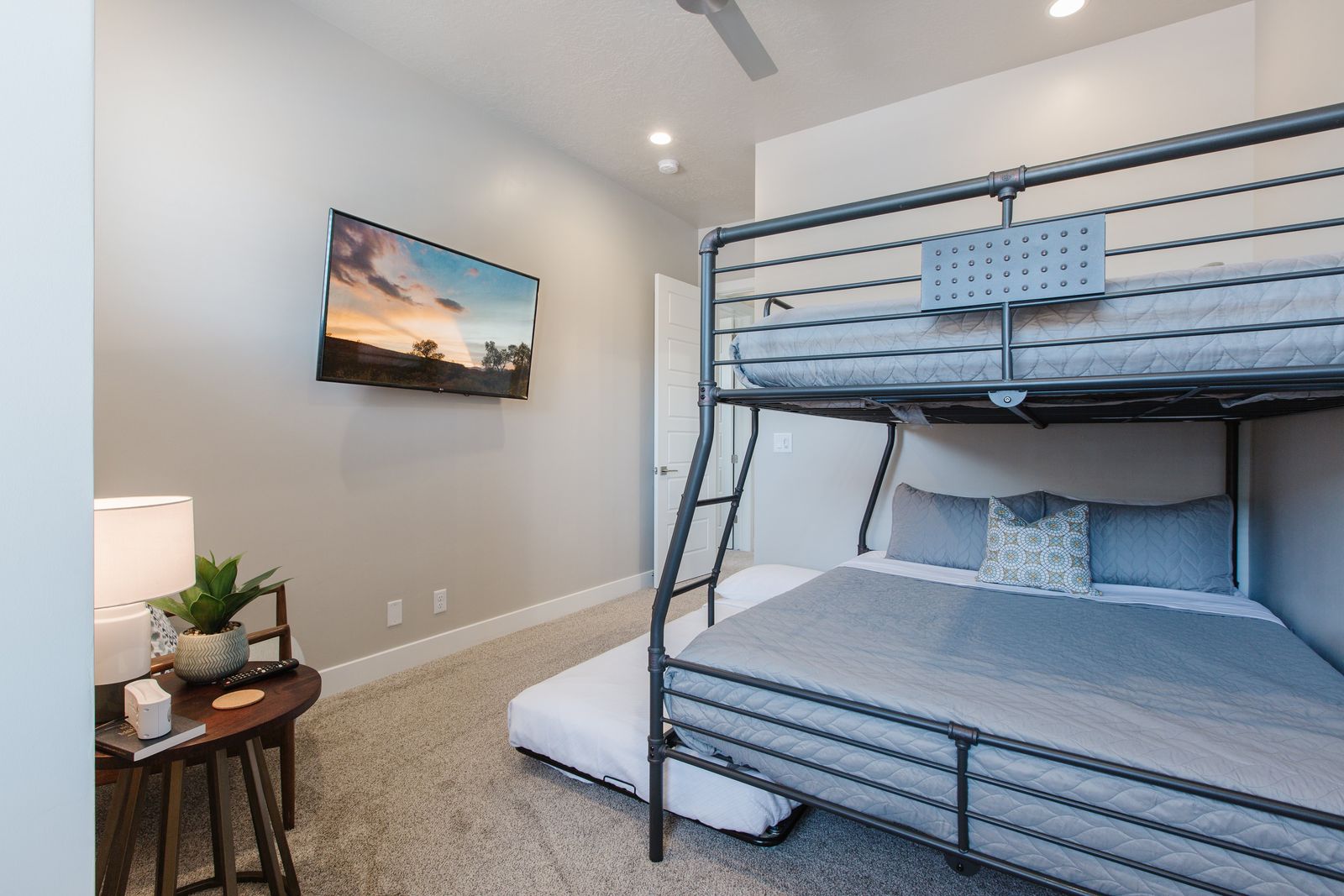 This beautiful 5 bedroom / 5 bath townhome spares nothing when it comes to comfort and entertainment. Park Place can comfortably sleep 16 guests, additional sleeping arrangements are available for up to 20 guests. Sip on a hot cup of coffee and watch the sunrise from your balcony with beautiful mountain views. Spend your days exploring the surrounding area; hike through Snow Canyon, bike along with one of the many bike trails, or go fishing out at Gunlock Reservoir. If exploration is not your forte, do not worry! Spend your day lounging next to the Resort-style pool, cool off in the lazy river, or challenge someone to a pickleball tournament. While the hot desert sunsets, barbeque dinner on the back porch with a cold drink in hand. Host a game night with the board games, and PS4 or have a foosball or ping pong tournament! End the night laughing and roasting marshmallows under the desert sky, lit up with stars. No activity is out of reach at Park Place!