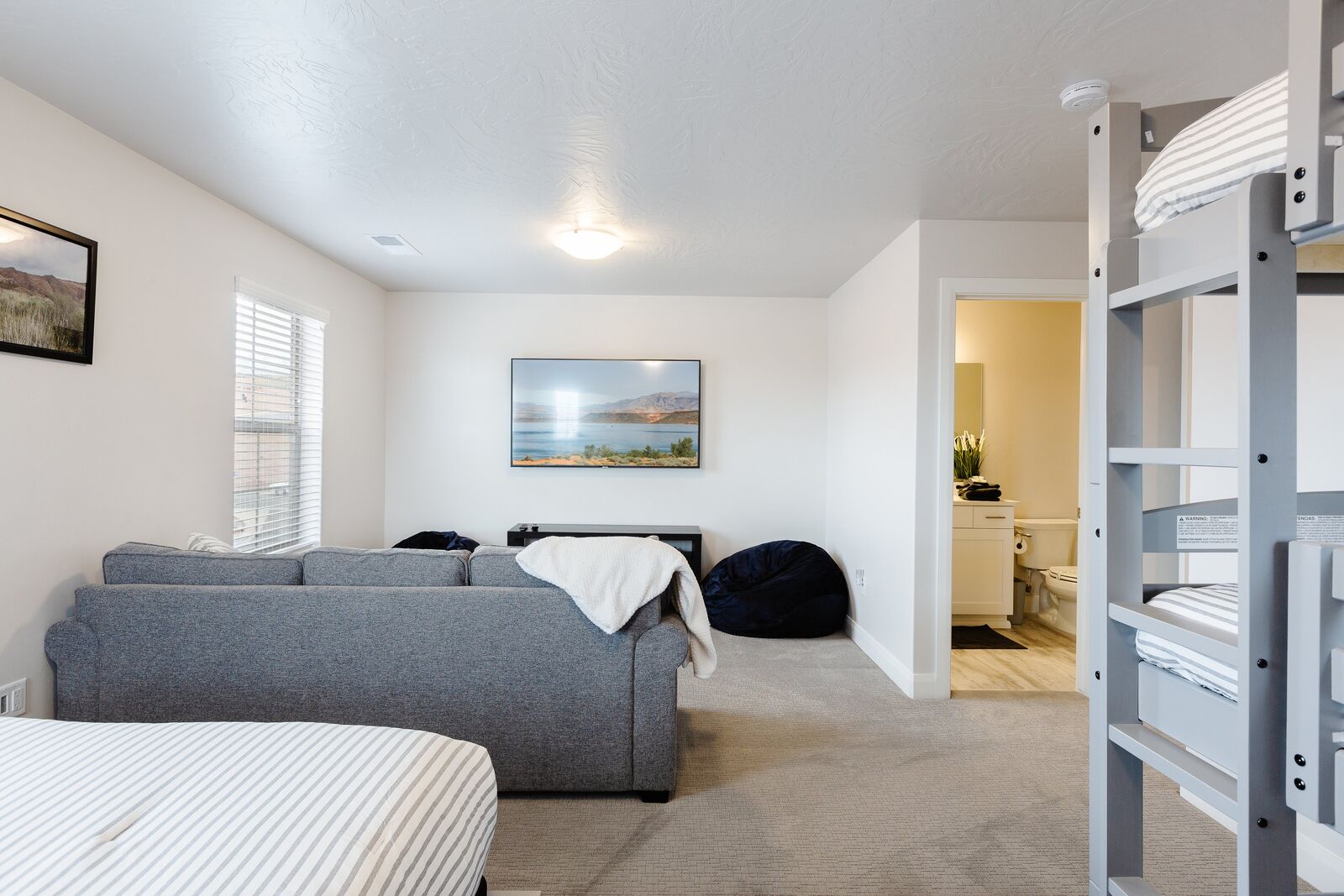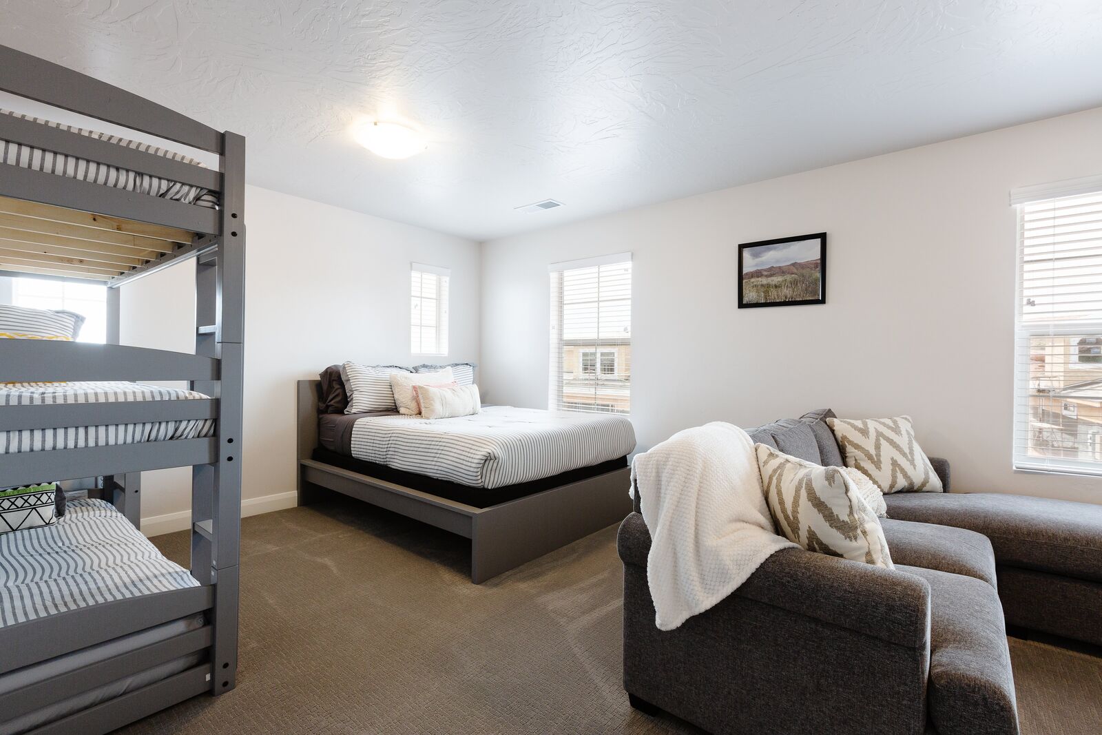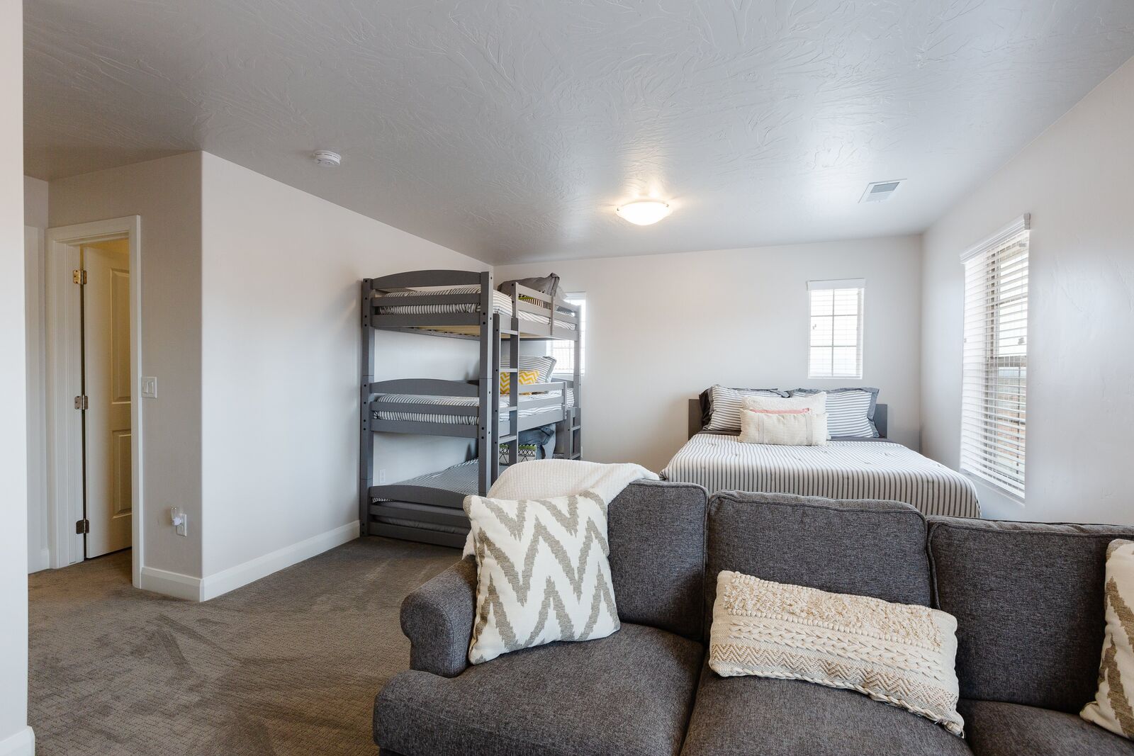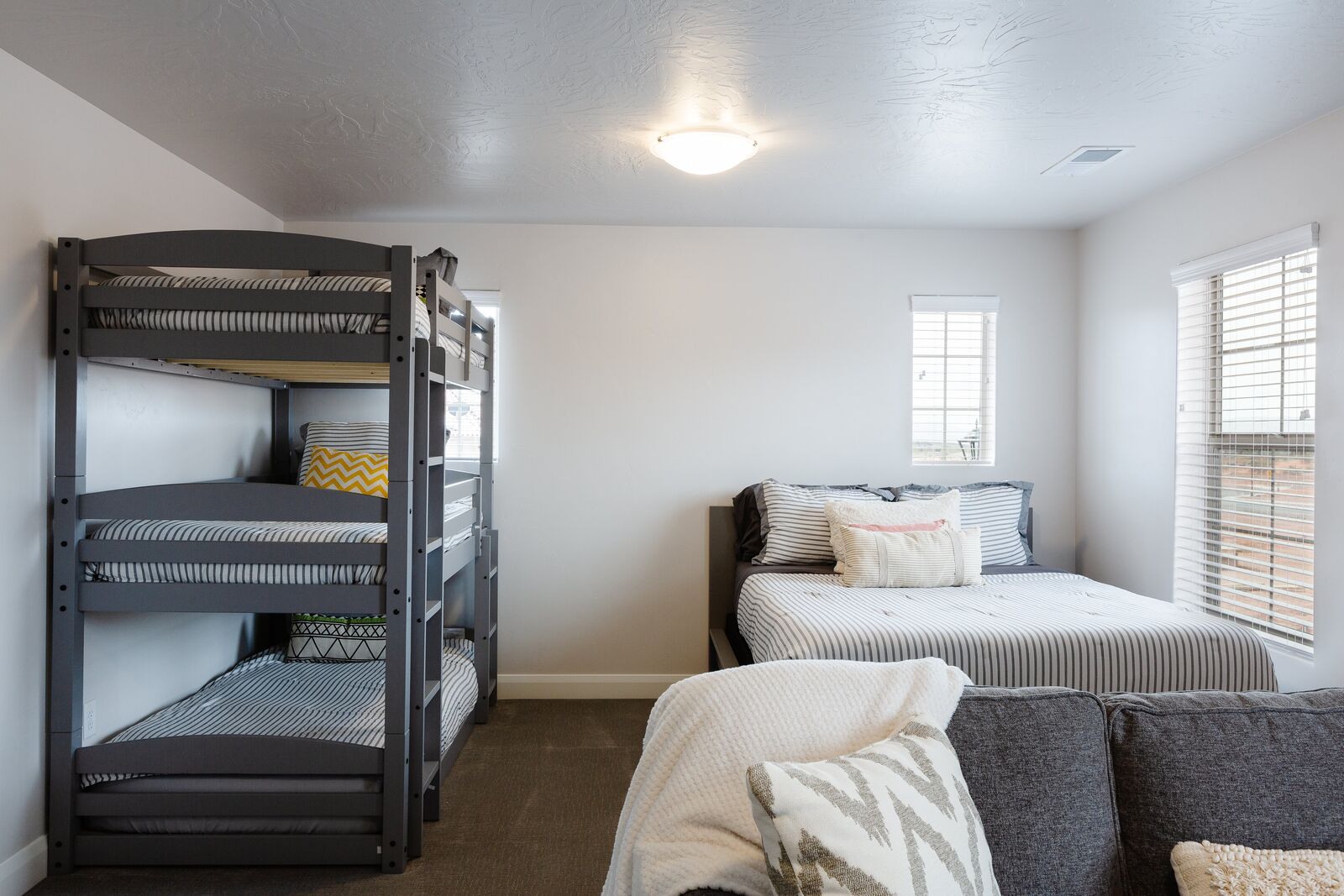 Twin trio bunk bed, full bed, & queen sofa sleeper – ensuite