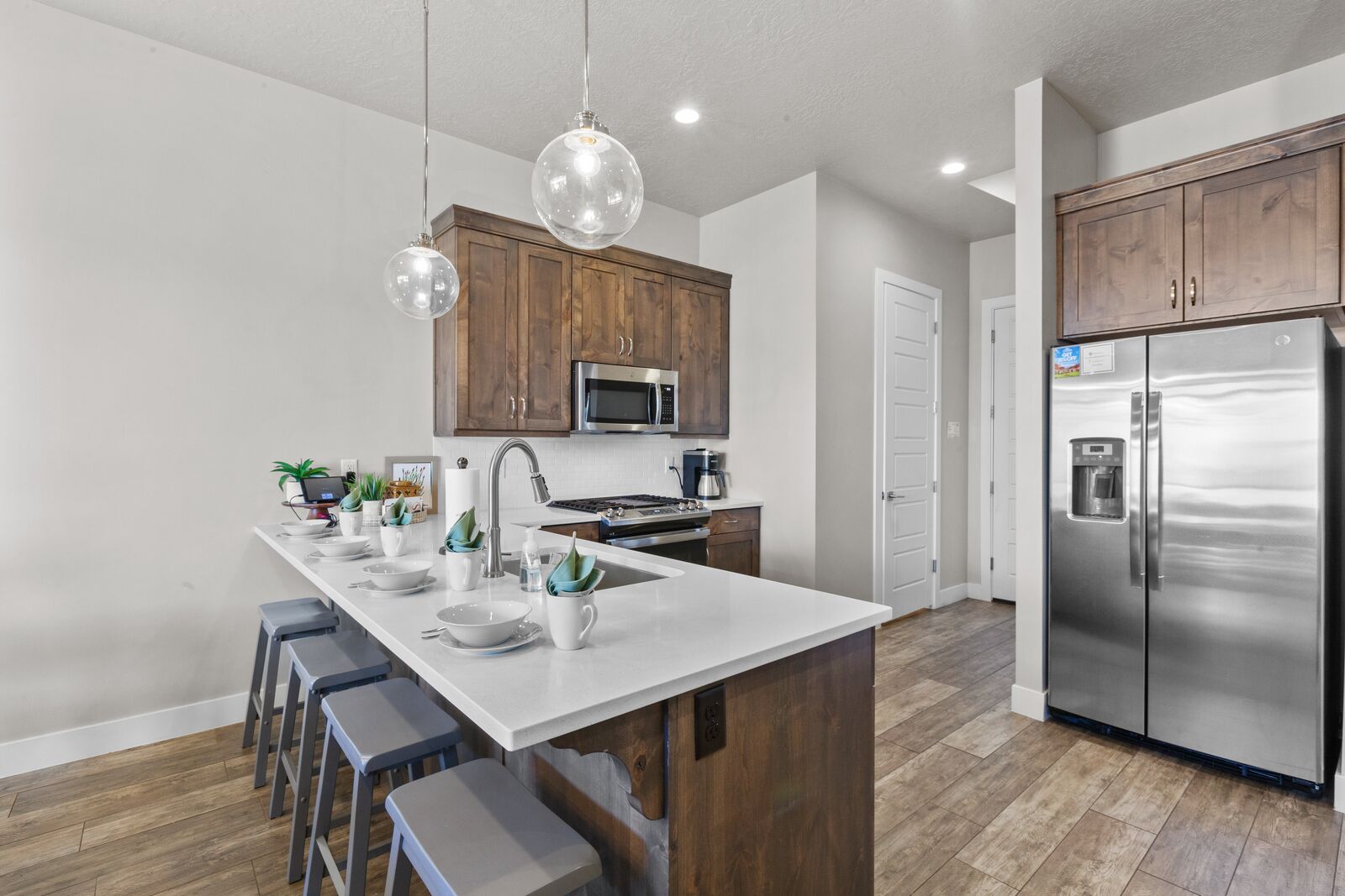 This elegant 3-bedroom 3.5-bathroom home features a modern kitchen with plenty of cooking tools for your use! Upstairs in the loft is a vint game system with a TV and is the perfect spot for kids to have a movie night or challenge each other to games! With provided board games, bikes, and scooters, there will never be a boring moment on your vacation. Spend your days exploring beautiful southern Utah and enjoying the sunshine as you play pickleball, hike through beautiful Snow Canyon, or wade through the watery trail of Kanarraville Falls. As the sun sets, come home to your Private Escape after a day full of adventure and relax in your private hot tub under the stars. Cozy up in front of one of the 4 TVs for a movie night! No matter what kind of recreation you enjoy, Private Escape at Ocotillo Springs is sure to have something for everyone!
