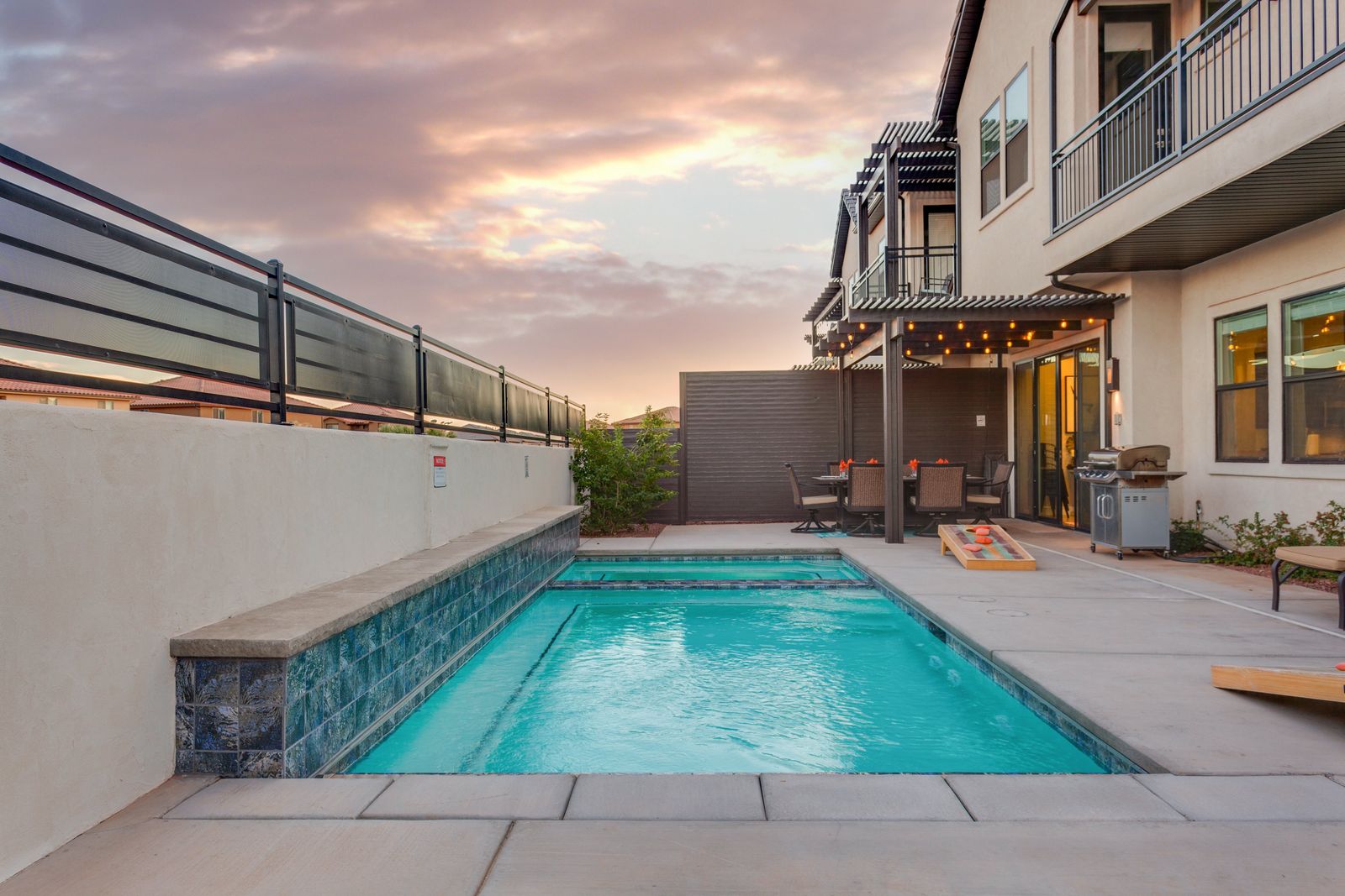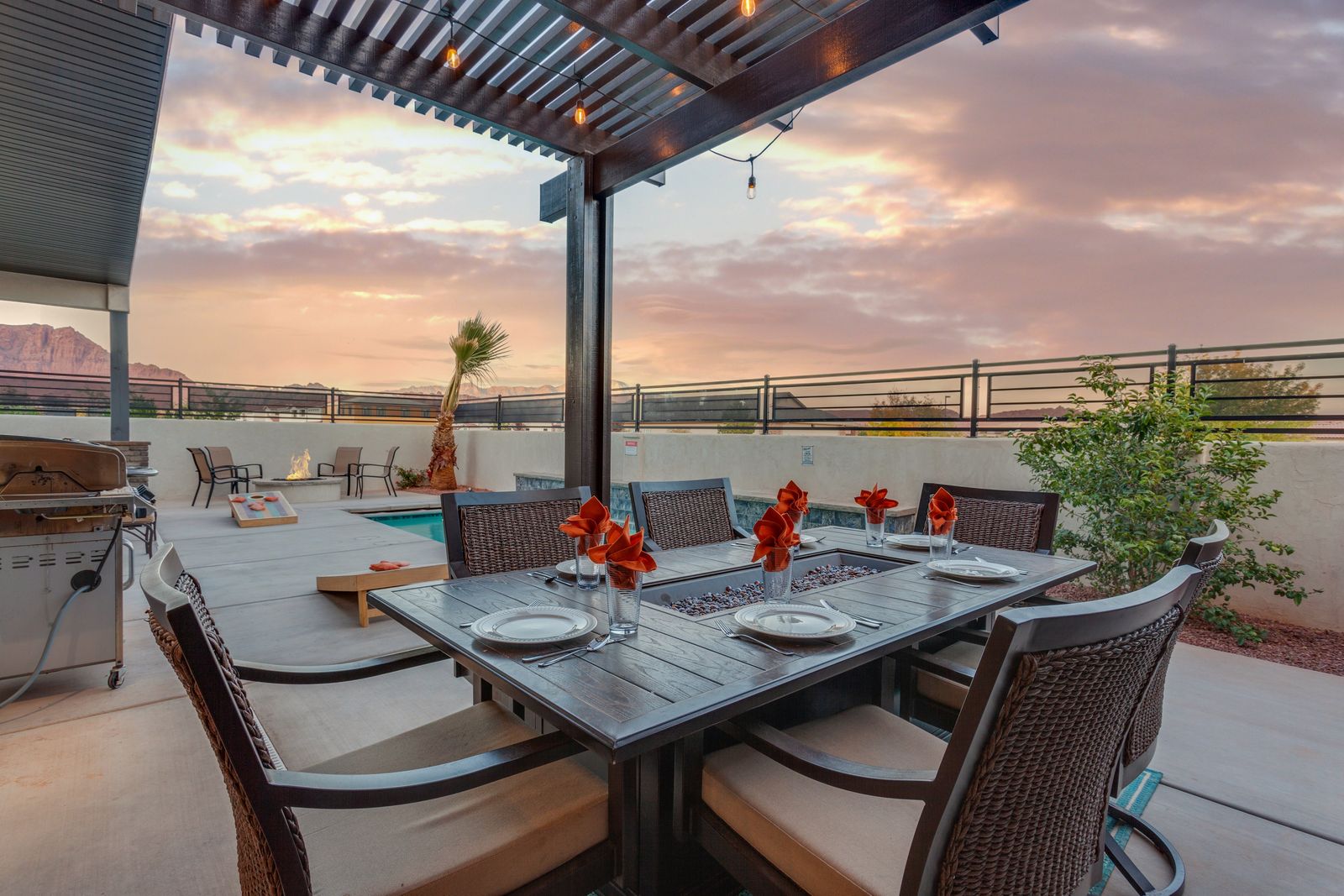 Spend your next southern Utah vacation at The Lookout in Ocotillo Springs, the perfect place to enjoy the desert sun! This beautiful home features a private pool and spa, as well as two play stations and large TVs in each room, as well as two in the loft and one in the living room! Enjoy the sunshine and desert breeze on your private patio with a refreshing dip in the pool or a delicious lunch on the balcony. As the sun sets, cook some delicious food on the grill and enjoy time with your favorite people! You can relax in front of a fire either from the upstairs balcony under shining string lights, or by the pool at one of two fire pits on the ground floor. Gaze up at the stars from the comfort of the hot tub and then cozy up on the couch in front of one of the TVs for a movie night.