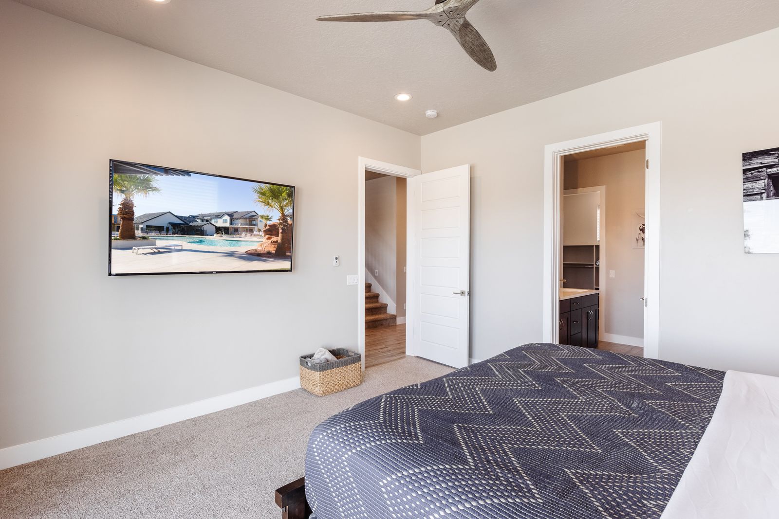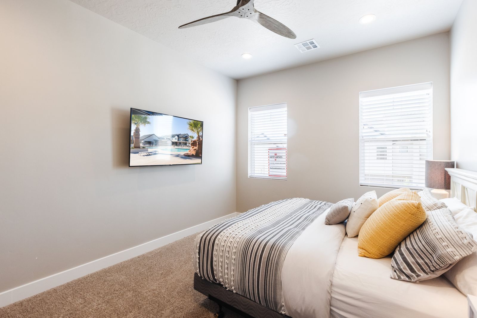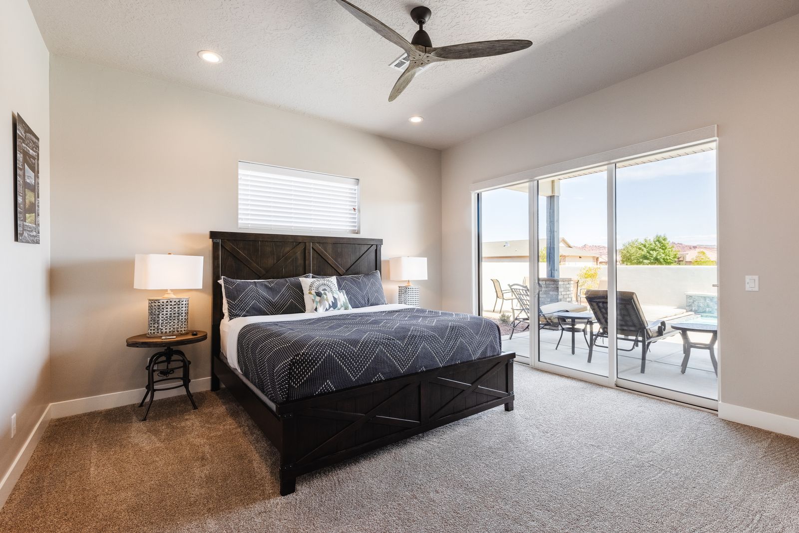 This elegant 5 Bedroom / 5.5 Bathroom home can comfortably sleep 16 people, or with the use of a pull-out couch bed and roll-away twin beds, fit as many as 20 people to have all of your favorite people with you for your southern Utah vacation! The master bedroom is downstairs, with patio access as well as a large ensuite bathroom and master walk-in closet. Enjoy a soak in the large tub, or a refreshing shower after a day of exploring the local scenery! Upstairs there are 2 more King suites, as well as a queen suite and a bunk room for the kids! The bunk room features two 3-tier twin bunk beds, as well as a twin daybed with a trundle, so you can fit as many as 8 people comfortably in one room! Spend your day exploring southern Utah at local destinations like Sand Hollow, Tuacahn Center for the Arts, and Snow Canyon all within a short trip from your new favorite vacation destination, The Lookout in Ocotillo Springs!