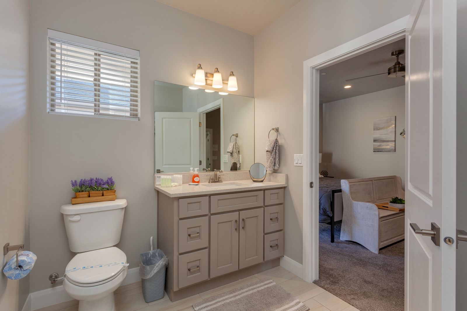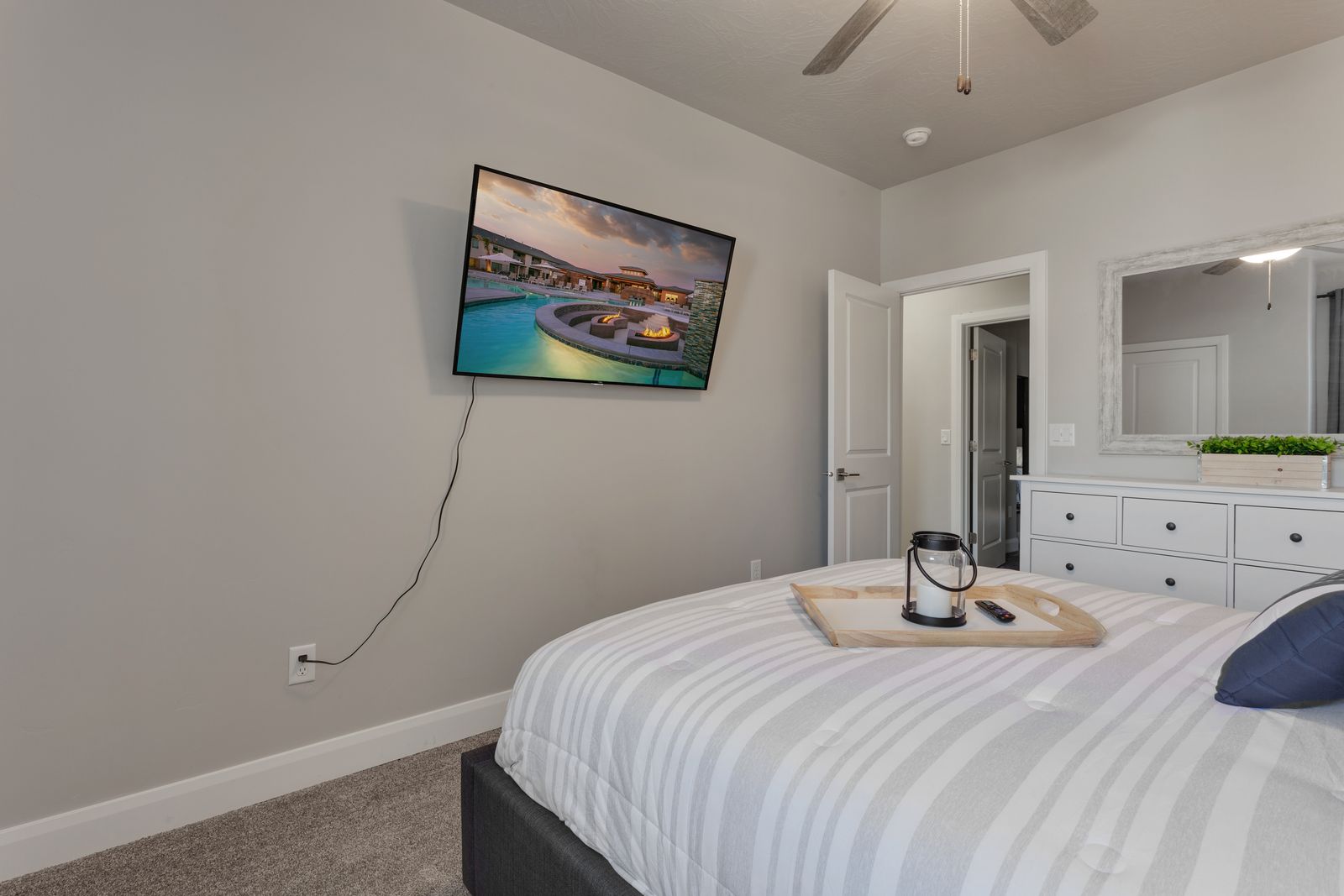 Bedroom 2: Queen bed with a 55" smart TV and shared bathroom