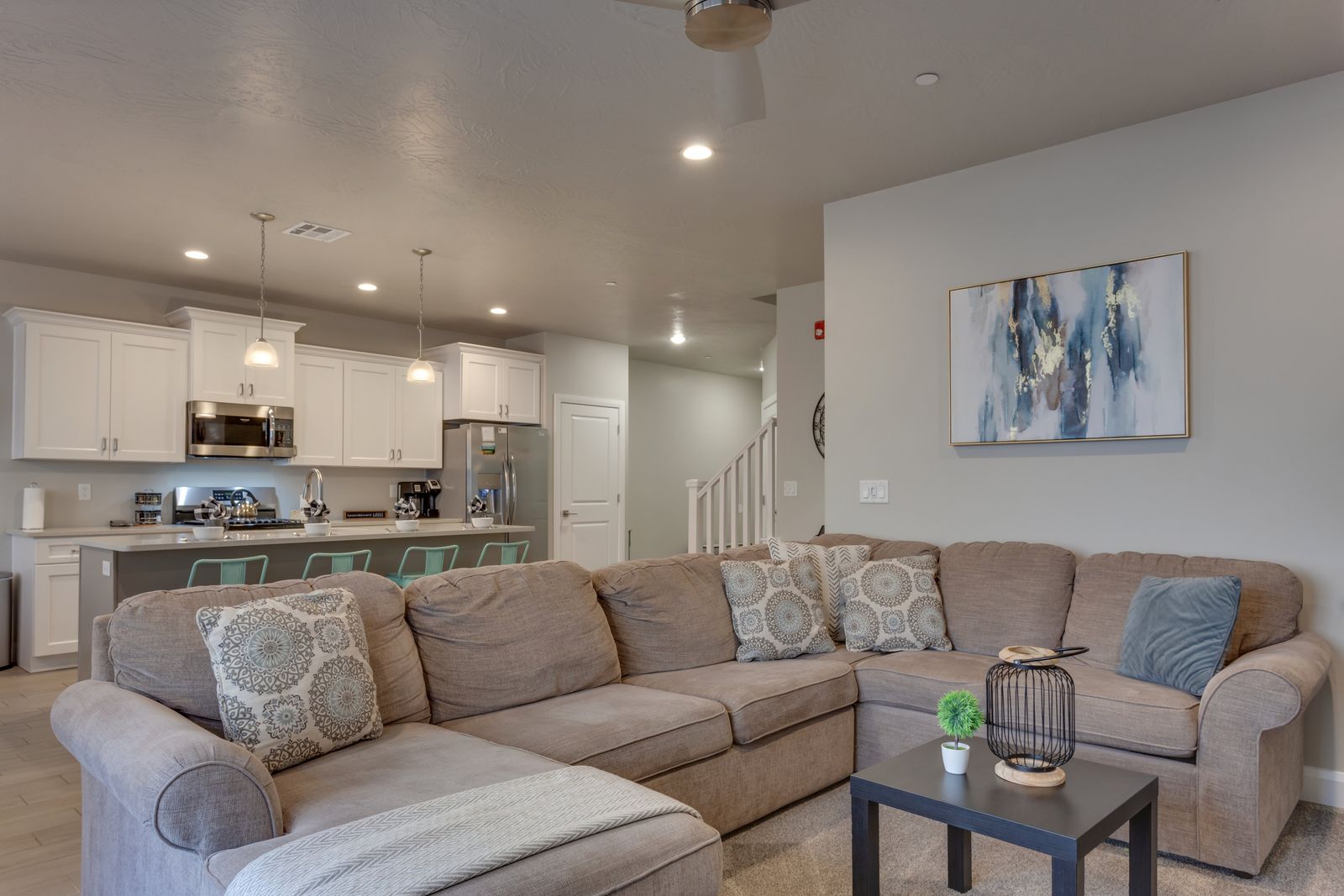 Dune Your Thing at Zion Village features 3 bedrooms and 3 bathrooms and can comfortably sleep, 16 people. Upstairs there is a bunk room with a 55” smart TV and 2 triple queen/full/twin bunk beds. Down the hall, there is a king master suite with an ensuite bathroom and a 65” smart TV. Lastly, there is a queen bedroom with a 55” smart TV and a shared bathroom. The home also features a pack-away crib in the bunk room closet. Cozy up in front of the 75” TV in the living room and watch a movie or watch the sunset on the misted balcony or porch. Dune Your Thing at Zion Village will be your new favorite vacation spot for years to come!