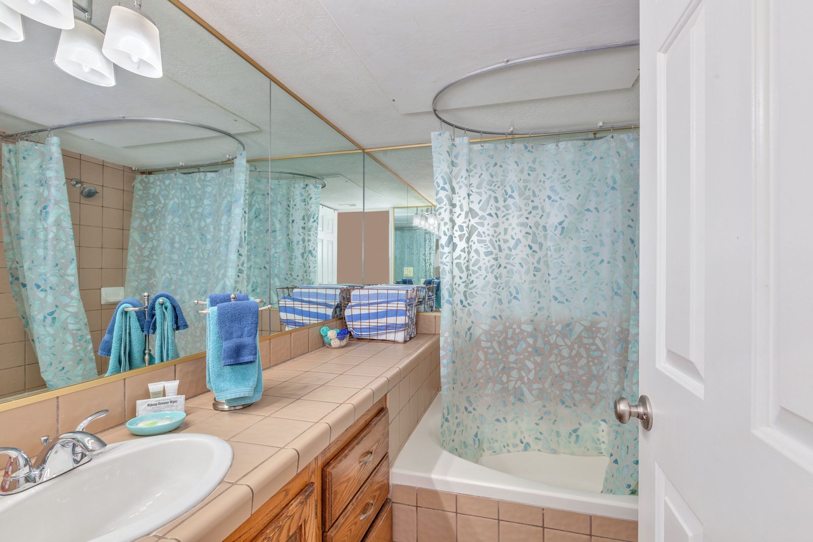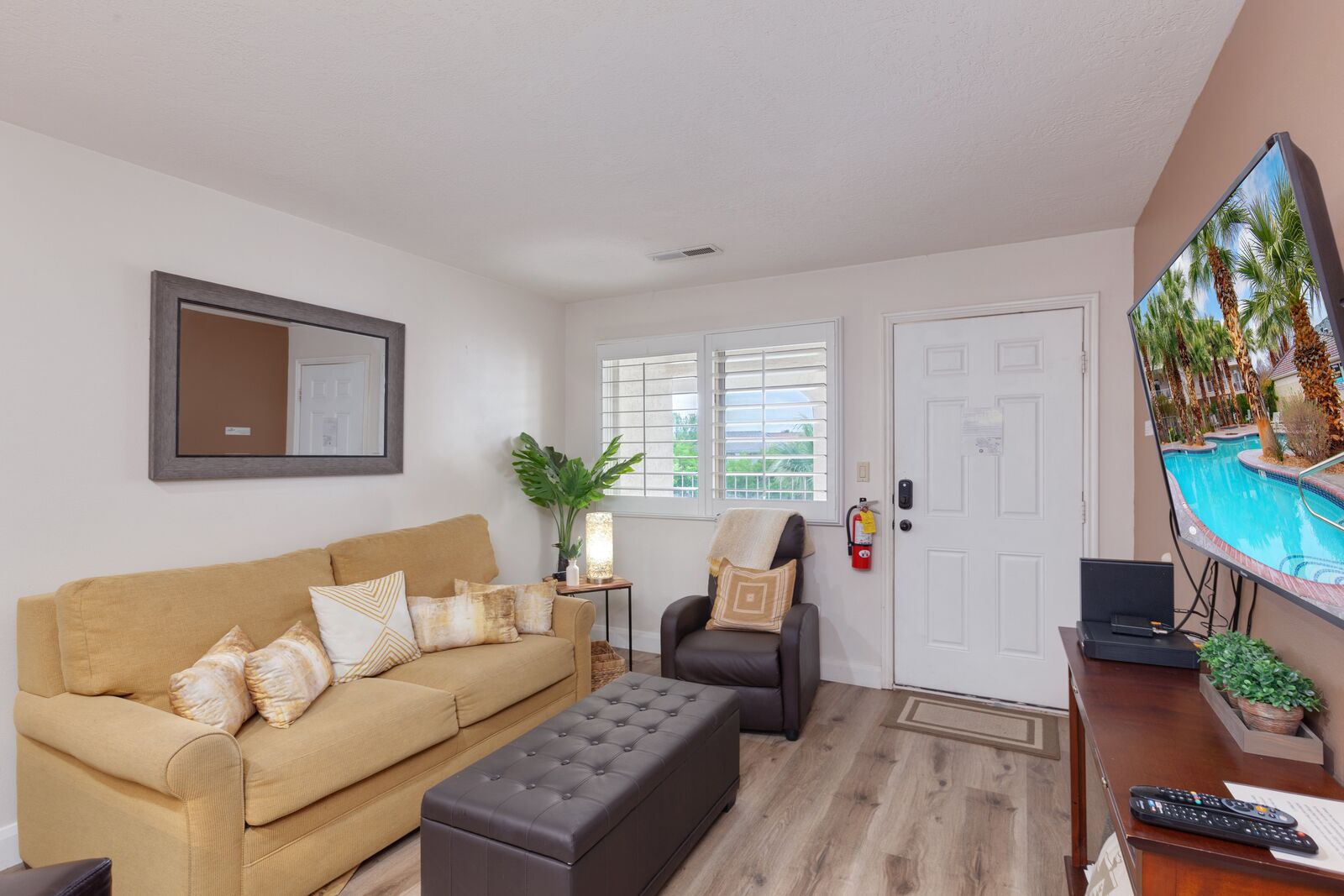 This 1 bedroom 1 bathroom home is the perfect place for a couple or small family! The bedroom features a King bed and balcony access and a 55" TV, while the living room hosts a pull-out sofa-bed and TV. Enjoy access to the bathroom easily from both the living room and bedroom, as well as the stocked kitchen! With plenty of counter space and a cooking area, making food in this home is sure to be a breeze.