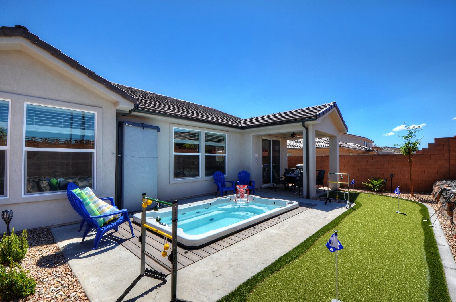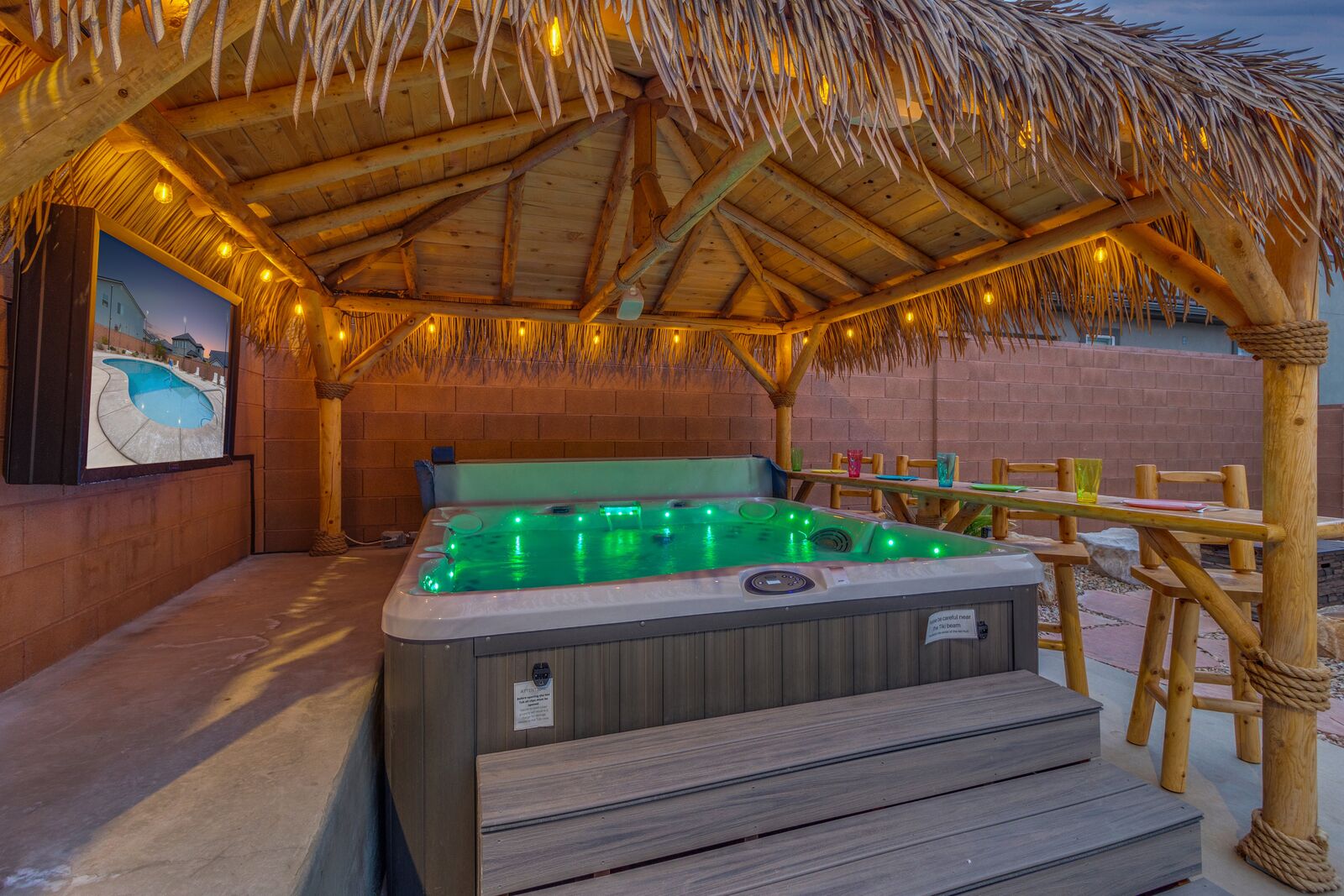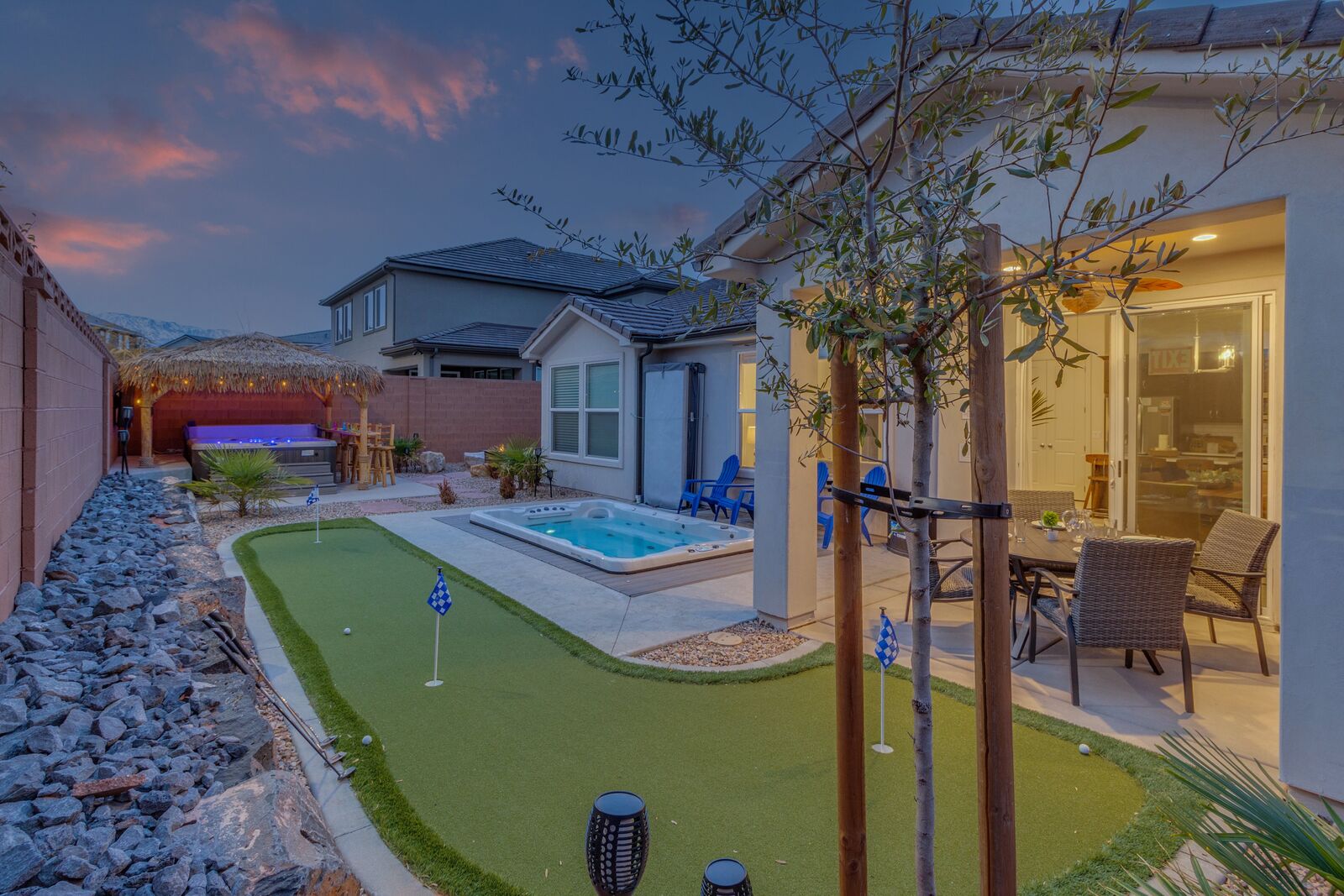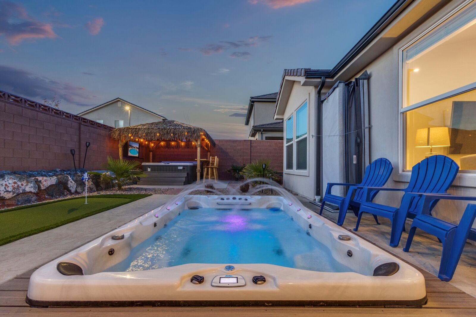 Enjoy a relaxing tropical getaway when you stay at Tiki Oasis at Ladera. This gorgeous home hosts both a private swim spa and a private hot tub for your use! Step into a refreshing oasis as you enter the backyard, complete with tiki torches, hanging lights, and bar seating that makes any event a celebration! Cook some delicious food on the grill or in the spacious kitchen, and watch the sunset as you dine in your own tropical paradise. The interior of the home is expertly designed and offers a modern, comfortable feel. Spend your days exploring all that Southern Utah has to offer, from hiking in Zion National Park to catching a Broadway show Tuacahn Center for the Arts, and come home to relax in the comfort of the hot tub or temperature-controlled swim spa. Perfect for families, with a ping pong table, and outdoor games, Tiki Oasis at Ladera is sure to be a favorite vacation destination for years to come!