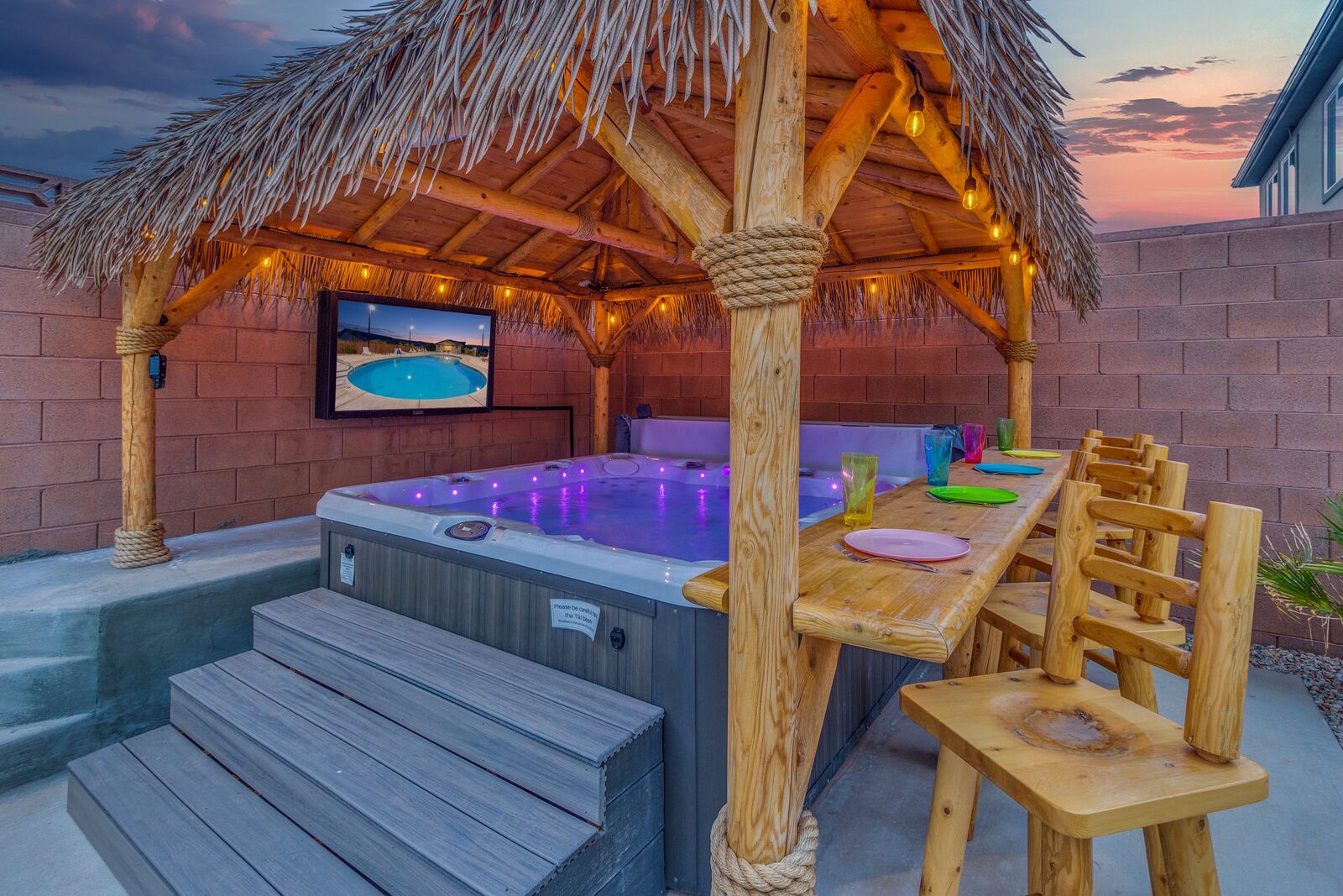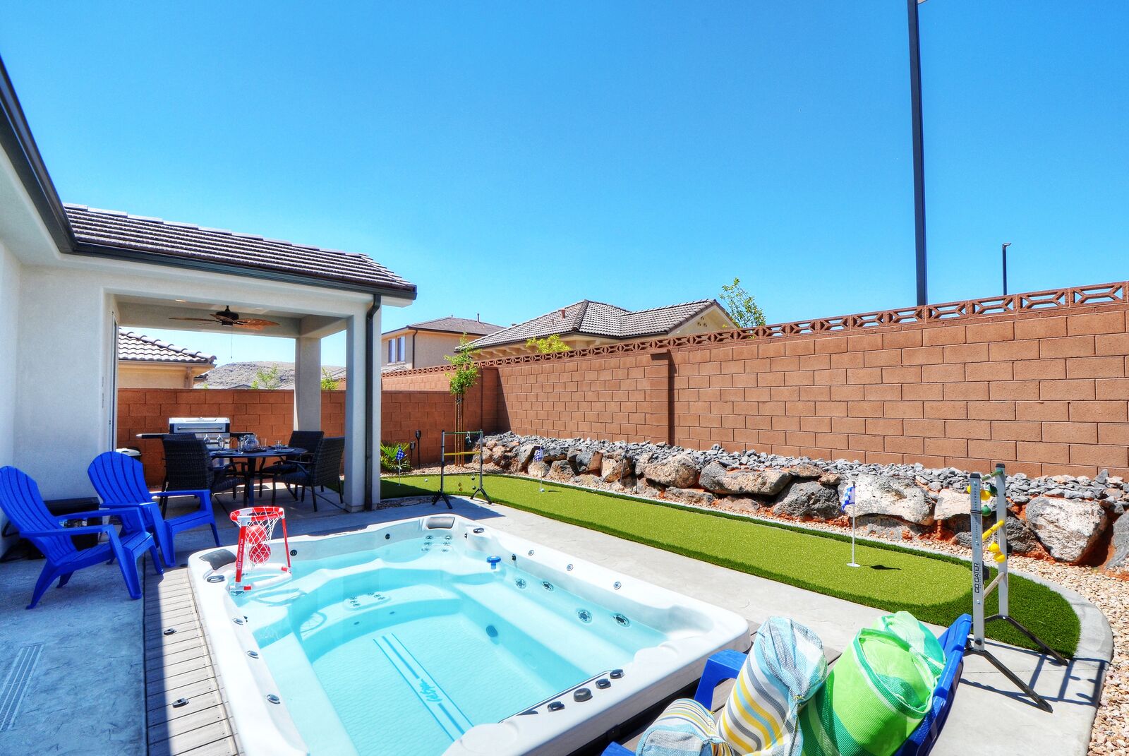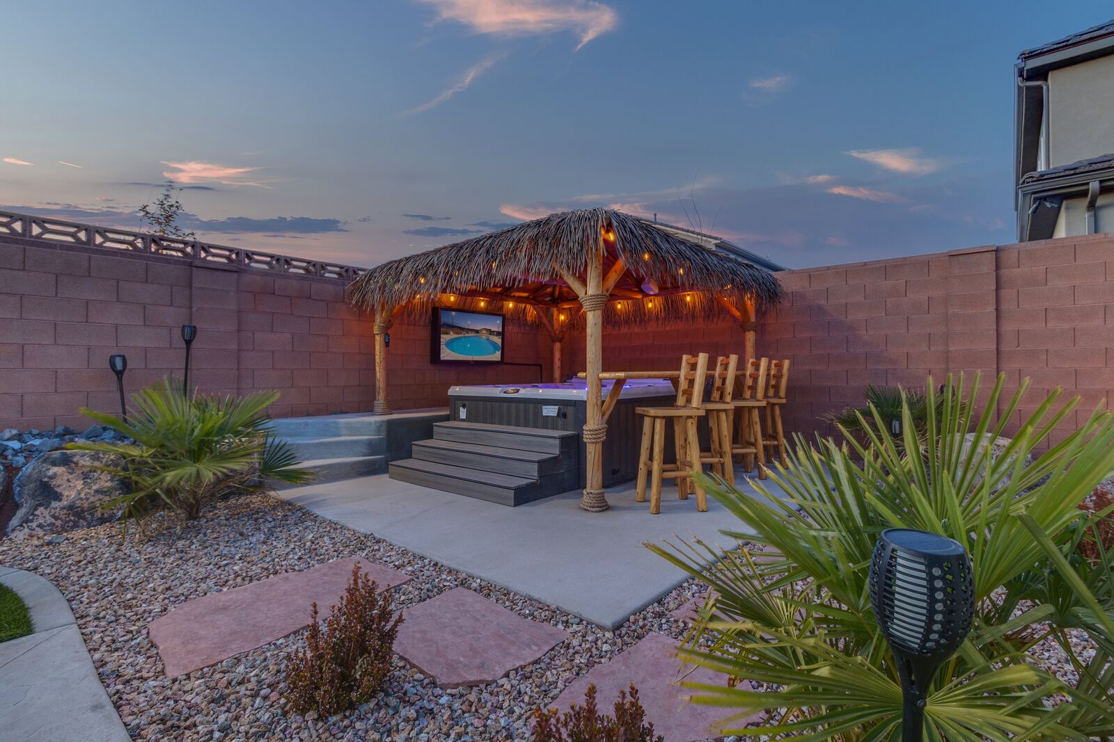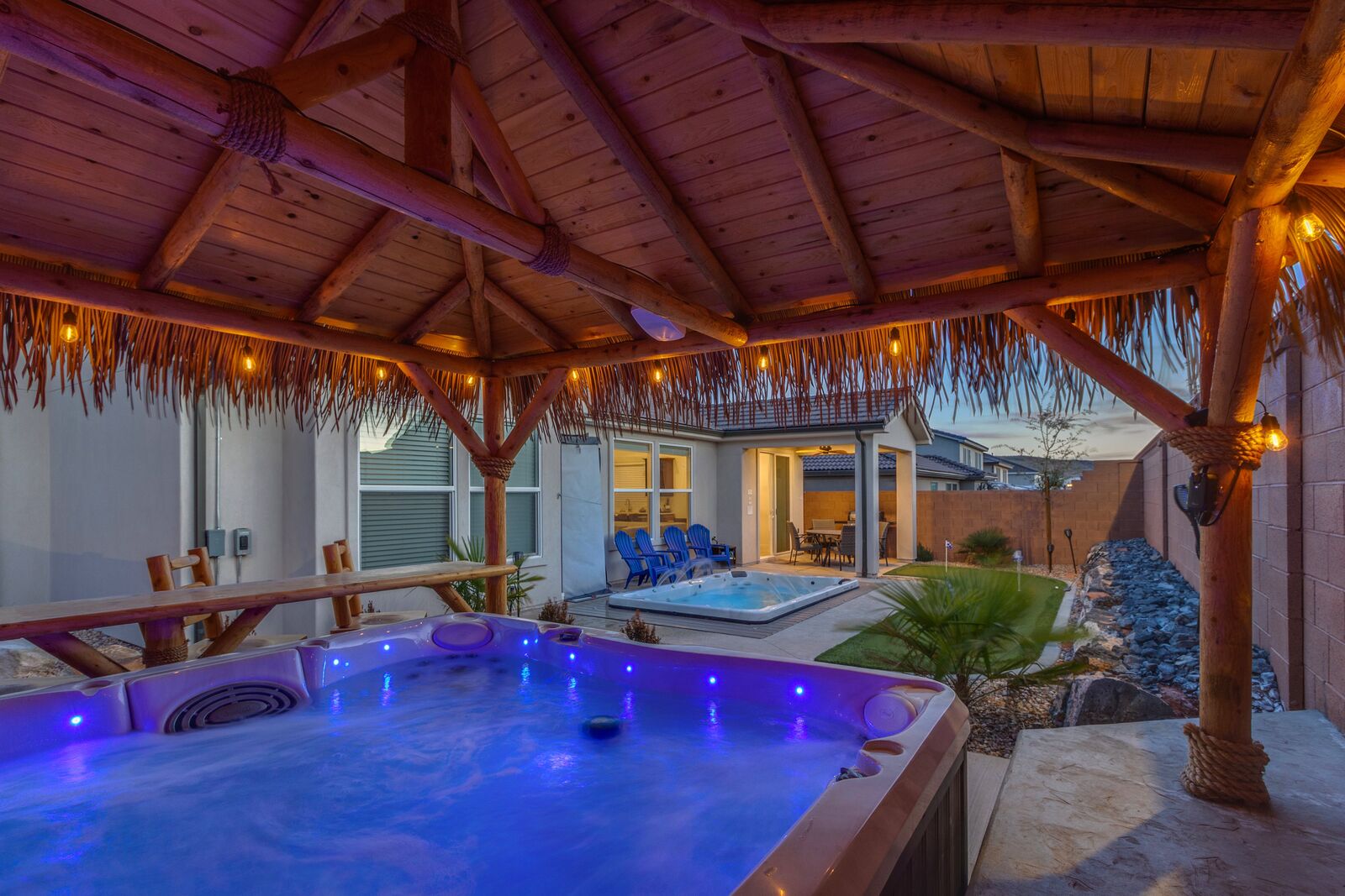 Enjoy a relaxing tropical getaway when you stay at Tiki Oasis at Ladera. This gorgeous home hosts both a private swim spa and a private hot tub for your use! Step into a refreshing oasis as you enter the backyard, complete with tiki torches, hanging lights, and bar seating that makes any event a celebration! Cook some delicious food on the grill or in the spacious kitchen, and watch the sunset as you dine in your own tropical paradise. The interior of the home is expertly designed and offers a modern, comfortable feel. Spend your days exploring all that Southern Utah has to offer, from hiking in Zion National Park to catching a Broadway show Tuacahn Center for the Arts, and come home to relax in the comfort of the hot tub or temperature-controlled swim spa. Perfect for families, with a ping pong table, and outdoor games, Tiki Oasis at Ladera is sure to be a favorite vacation destination for years to come!