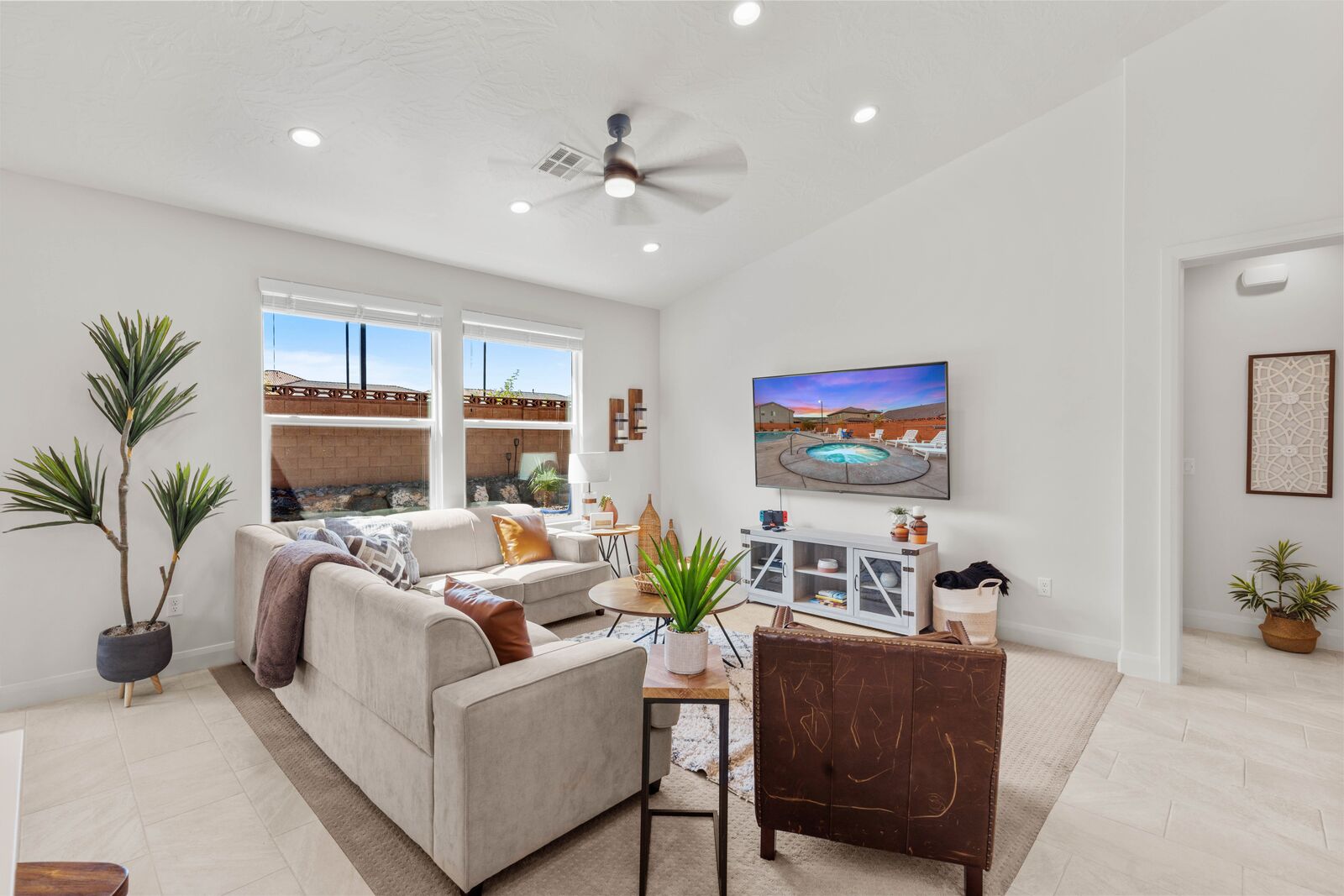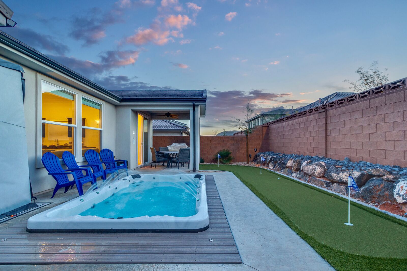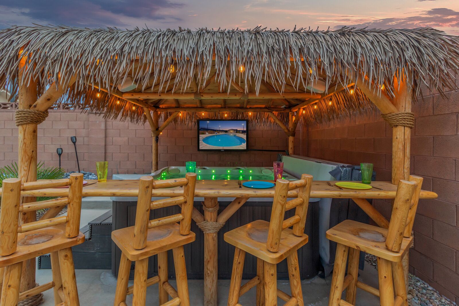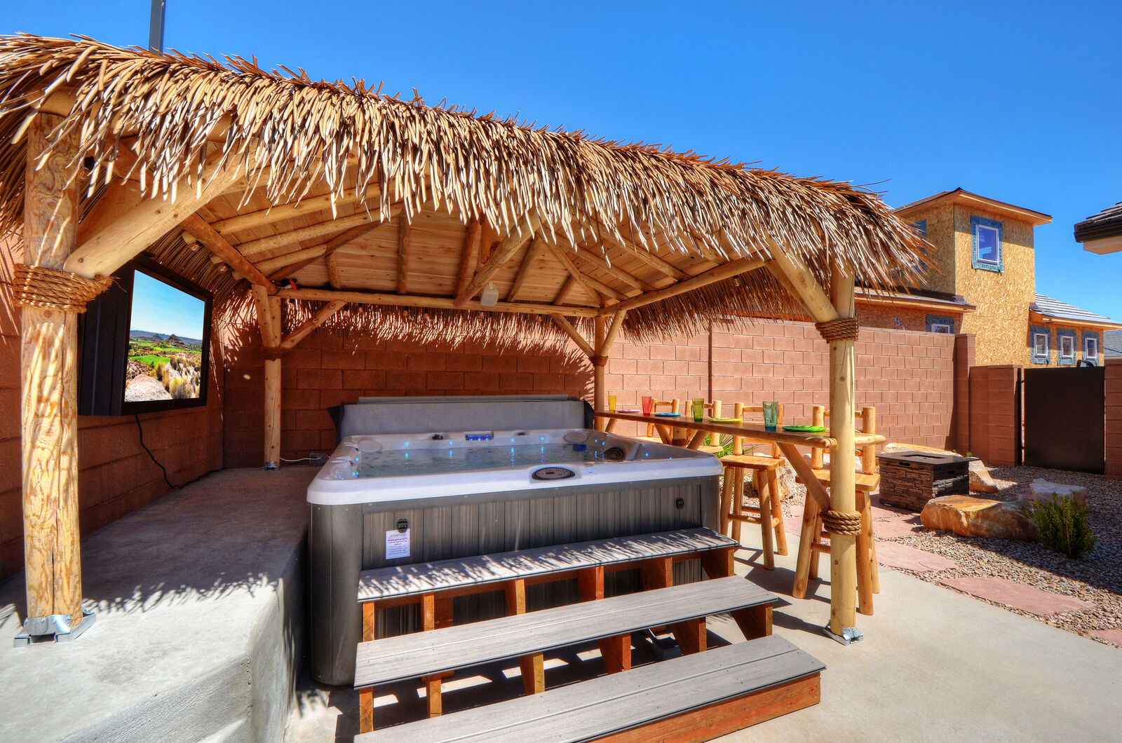 Enjoy a relaxing tropical getaway when you stay at Tiki Oasis at Ladera. This gorgeous home hosts both a private swim spa and a private hot tub for your use! Step into a refreshing oasis as you enter the backyard, complete with tiki torches, hanging lights, and bar seating that makes any event a celebration! Cook some delicious food on the grill or in the spacious kitchen, and watch the sunset as you dine in your own tropical paradise. The interior of the home is expertly designed and offers a modern, comfortable feel. Spend your days exploring all that Southern Utah has to offer, from hiking in Zion National Park to catching a Broadway show Tuacahn Center for the Arts, and come home to relax in the comfort of the hot tub or temperature-controlled swim spa. Perfect for families, with a ping pong table, and outdoor games, Tiki Oasis at Ladera is sure to be a favorite vacation destination for years to come!