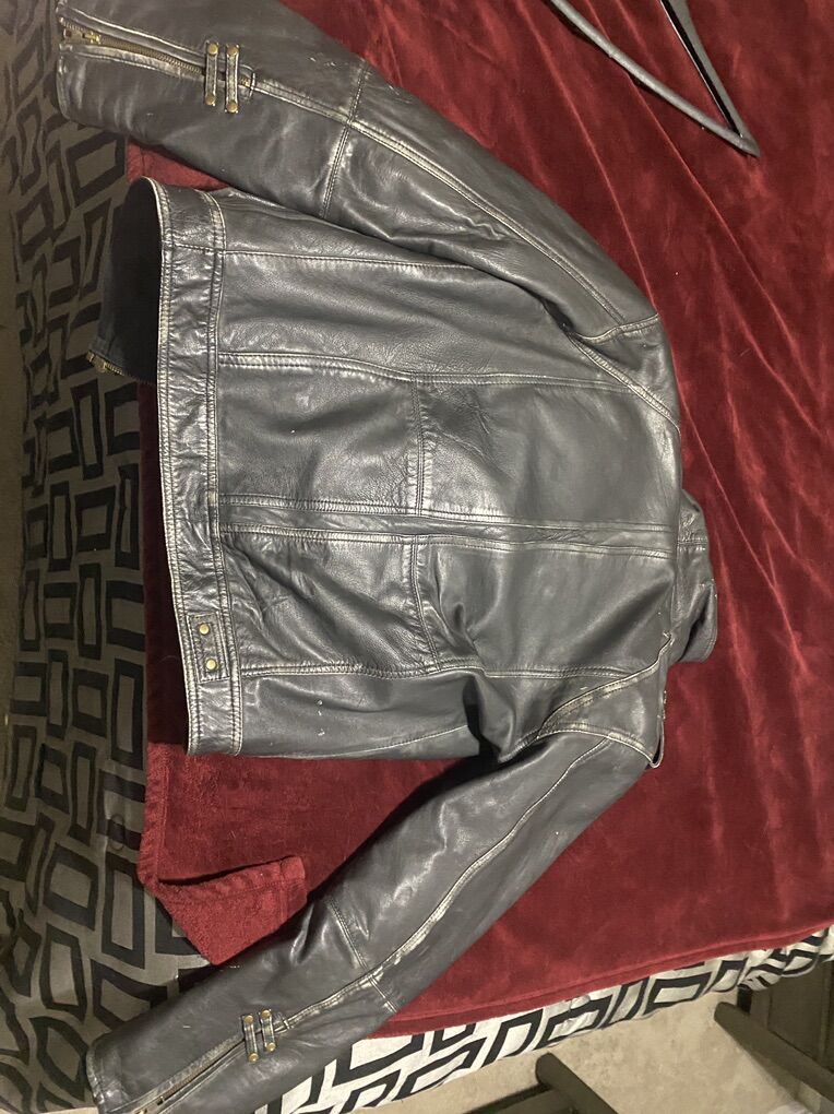 Motorcycle jacket from Custom Built, size S. Fit me great while I was under 180 pounds. 190 and above not so much. Leather jacket with armor in back, shoulders, and elbows. Wore this in 40-60 degree weather when it was colder. Plenty warm. Does have a rip above right zipper pocket which you can see in the picture. Has a patch on it. Othe than ghat it's in good condition.
