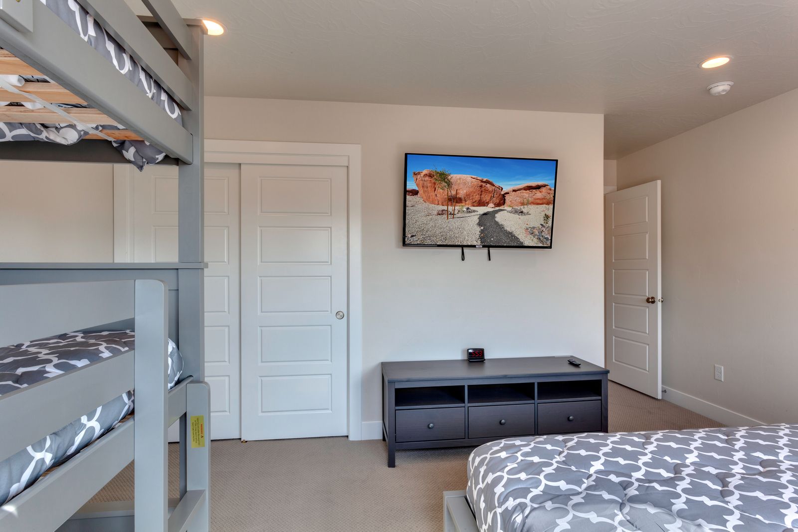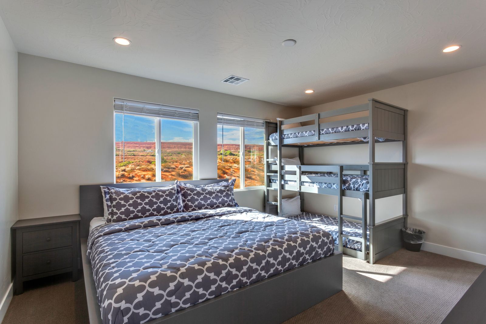 This beautiful 5 Bedroom / 5 Bathroom home can comfortably sleep 15 people for the ultimate desert getaway! The master bedroom is downstairs and features a King bed, a Smart TV, and a spacious ensuite bathroom. The ensuite bathroom also has a double-headed shower and two-sink vanity, leaving plenty of room to get ready for the day. Just off the entry, the second bedroom hosts a queen bed with direct access to a hall bathroom. Heading upstairs, you'll find 1 bedroom with a King bed and a triple tier twin bunk bed, and another bedroom with a King bed and a double tier twin bunk bed with Smart TVs. Just past the loft, there is a King bedroom with an ensuite bathroom. Paseos 1121 is sure to be a favorite vacation destination for years to come!