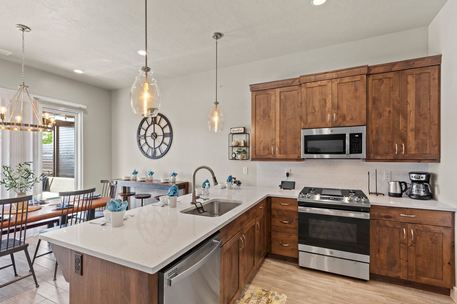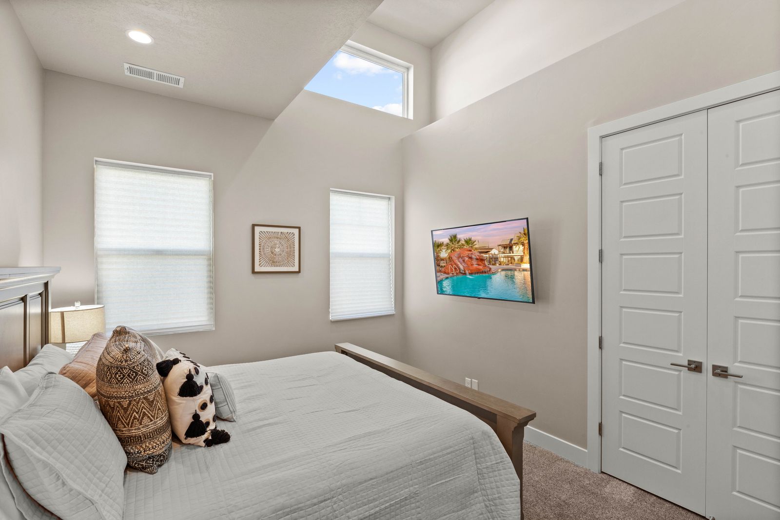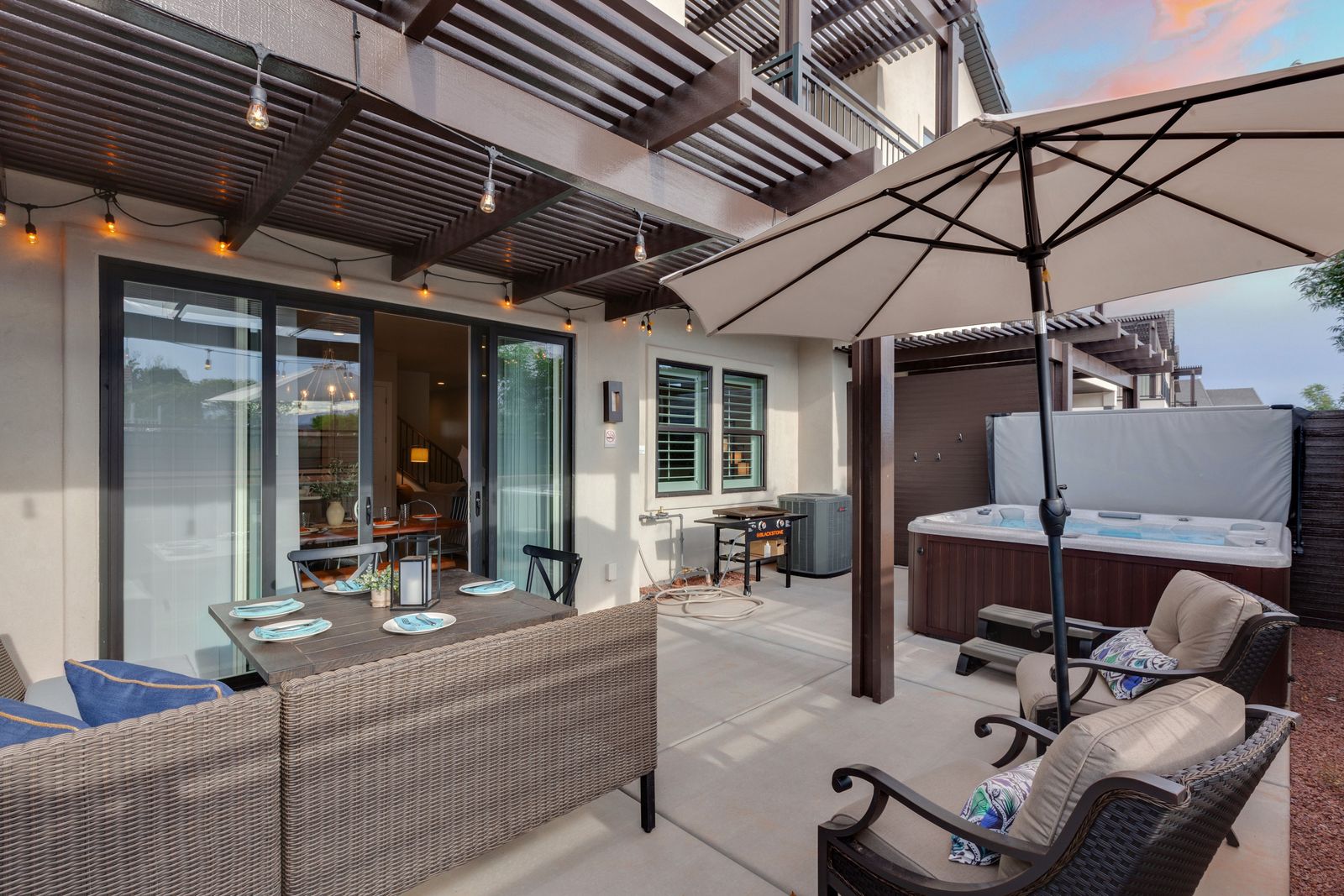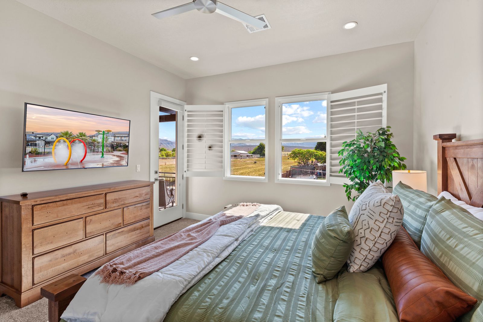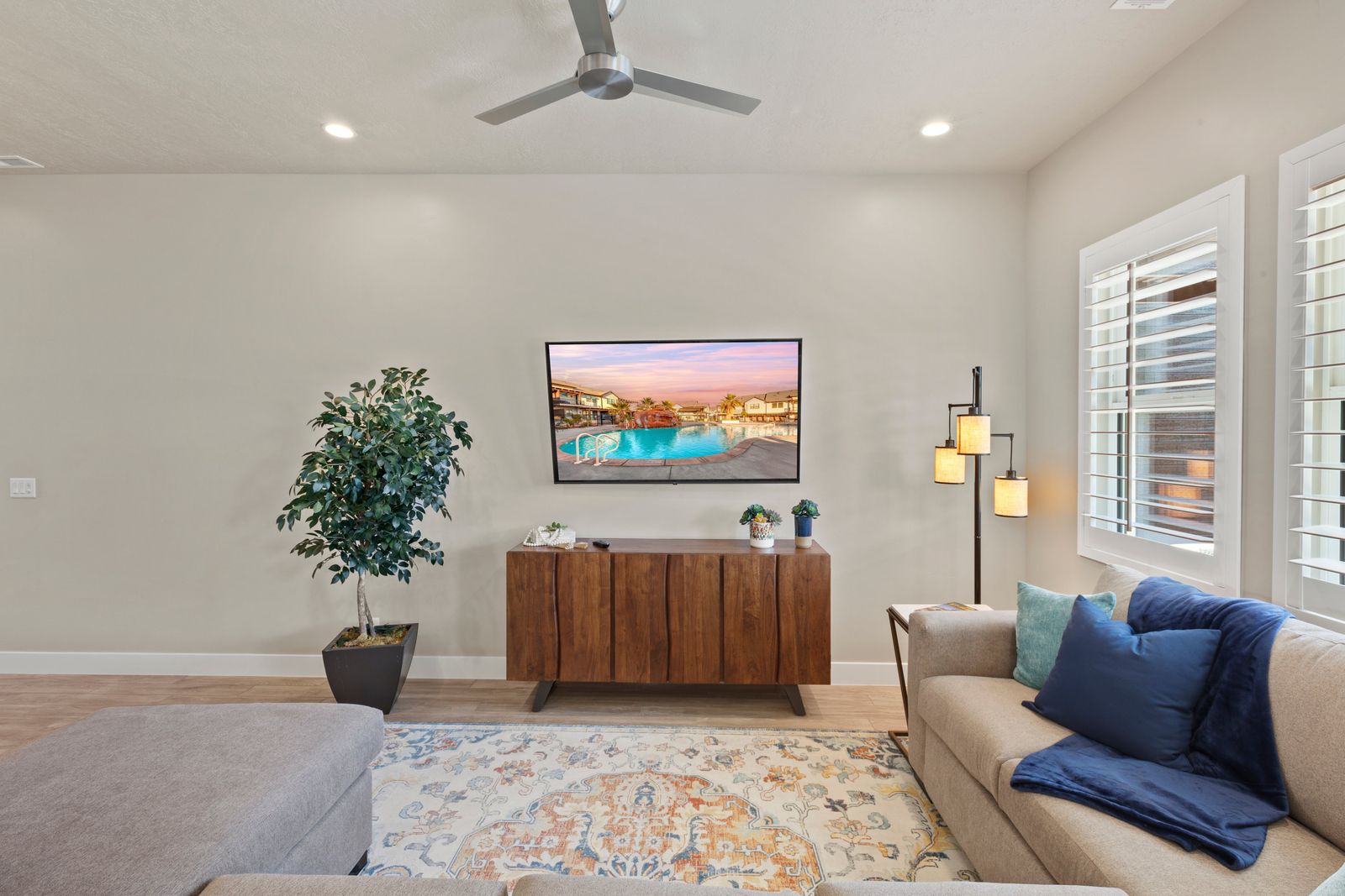 The Ocotillo Springs community amenities are focused around a luxurious clubhouse and a refreshing tropical pool with a red rock waterslide and splash pad. In addition to the huge pool, and hot tub, Ocotillo Springs offers exciting outdoor recreation for all ages including pickleball, fire pit, BBQ grill, poolside cabanas, and more. This is a brand new, beautiful 3 bedroom, 3 1/2 bath home that sleeps 11 comfortably. After a full day of outdoor activities, come relax and catch your breath. The inviting patio offers outdoor seating, a private hot tub and a new Blackstone Griddle. Grill your favorite foods while enjoying views of Red Mountain, a horse farm and the beautiful sunsets that make the sky appear to be on fire.