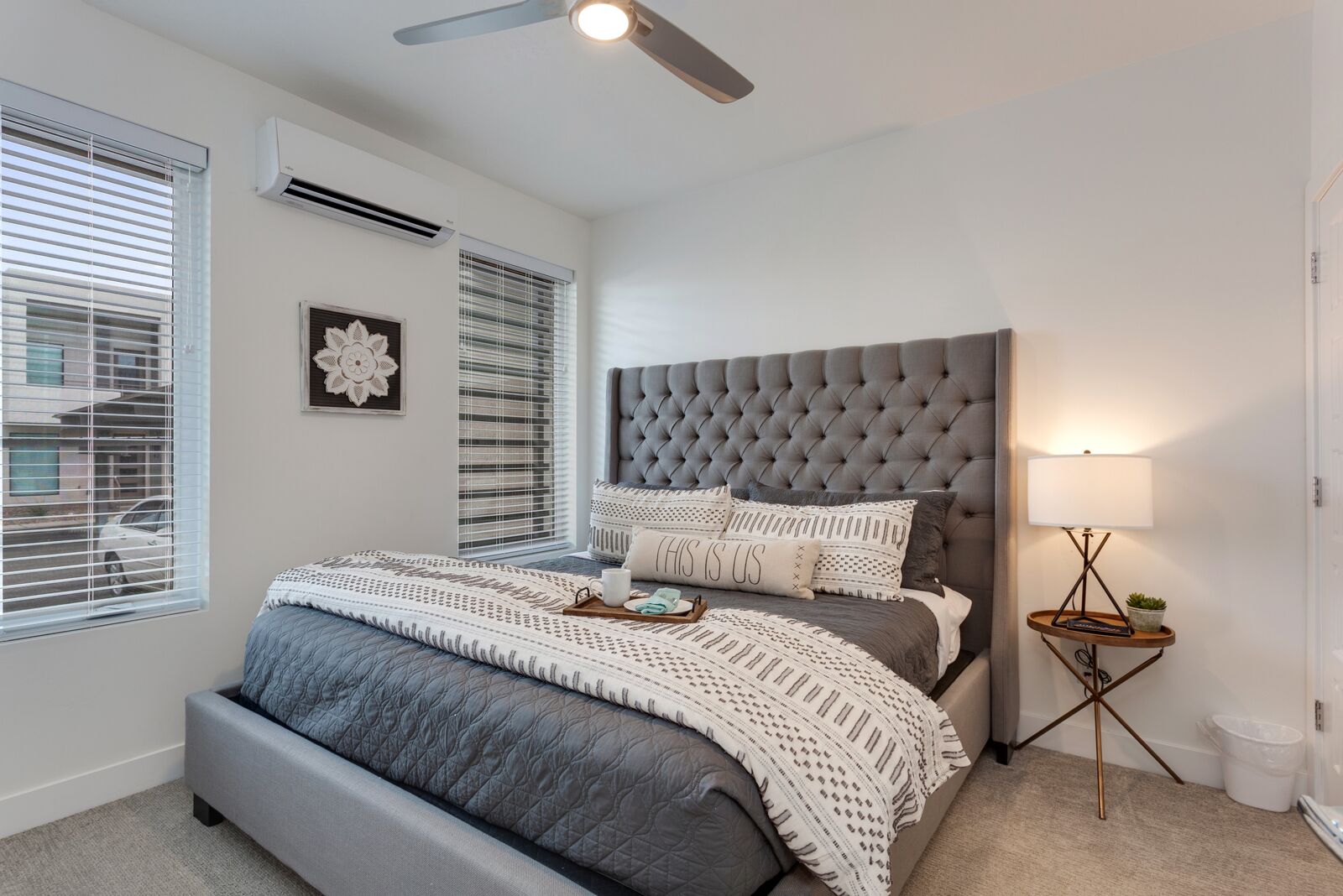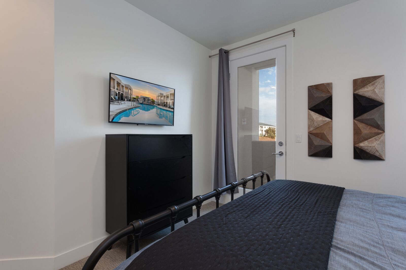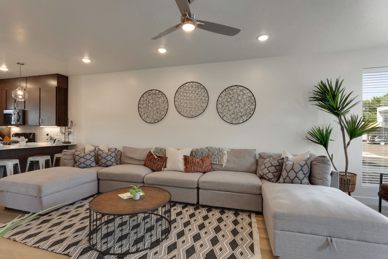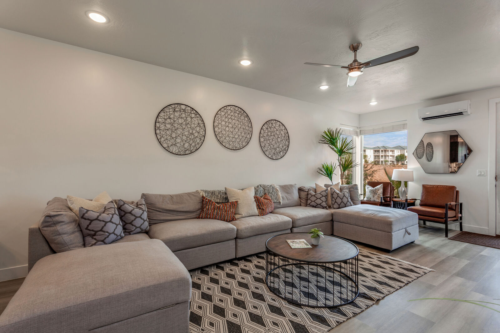This Contemporary 4 bedroom, 3.5 bathroom home can sleep 14 people comfortably, and 16 with the use of the Queen pullout sofa. With 1935 sq. feet, you will never feel cramped in this spacious townhome. This luxury villa is furnished with all the upgrades you could ask for including granite countertops and stainless steel appliances. There are so many amenities included, you will never run out of things to do! This home has a spacious floor plan, with quiet and private bedrooms. Each room is equipped with ceiling fans for those warm Southern Utah nights. Downstairs you will find one of the two master suites with an ensuite bathroom and glass walk-in shower. Just upstairs is the second master suite, also with an attached bathroom and access to a shared balcony with bedroom four. Additionally, upstairs there is a bunk room with a queen pullout sofa for the kids to enjoy. This room shares a full hall bathroom with the fourth king bedroom. This home is beautifully decorated with comfortable furniture throughout the entire home. You will never want to leave The Lofts Resort!