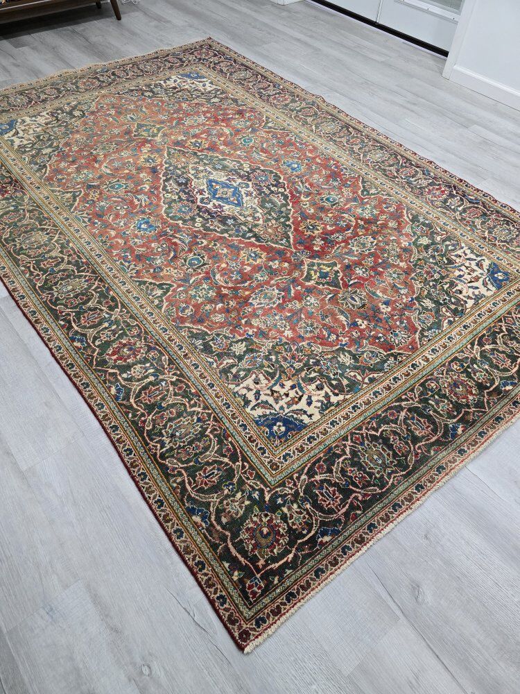 ZelleThis beautifully preserved Persian Kashan features a classic medallion-and-corner design framed by an elegant border. Its rich brick/rustic-red field is densely decorated with floral motifs in shades of teal, sapphire blue, ivory, and touches of gold. The central medallion in ivory, blue, and emerald anchors the composition. Subtle abrash enhances this rug's character and authenticity giving it a warm, time-softened glow. With its detailing, harmonious palette, and great craftsmanship, this Kashan brings sophistication into any space.