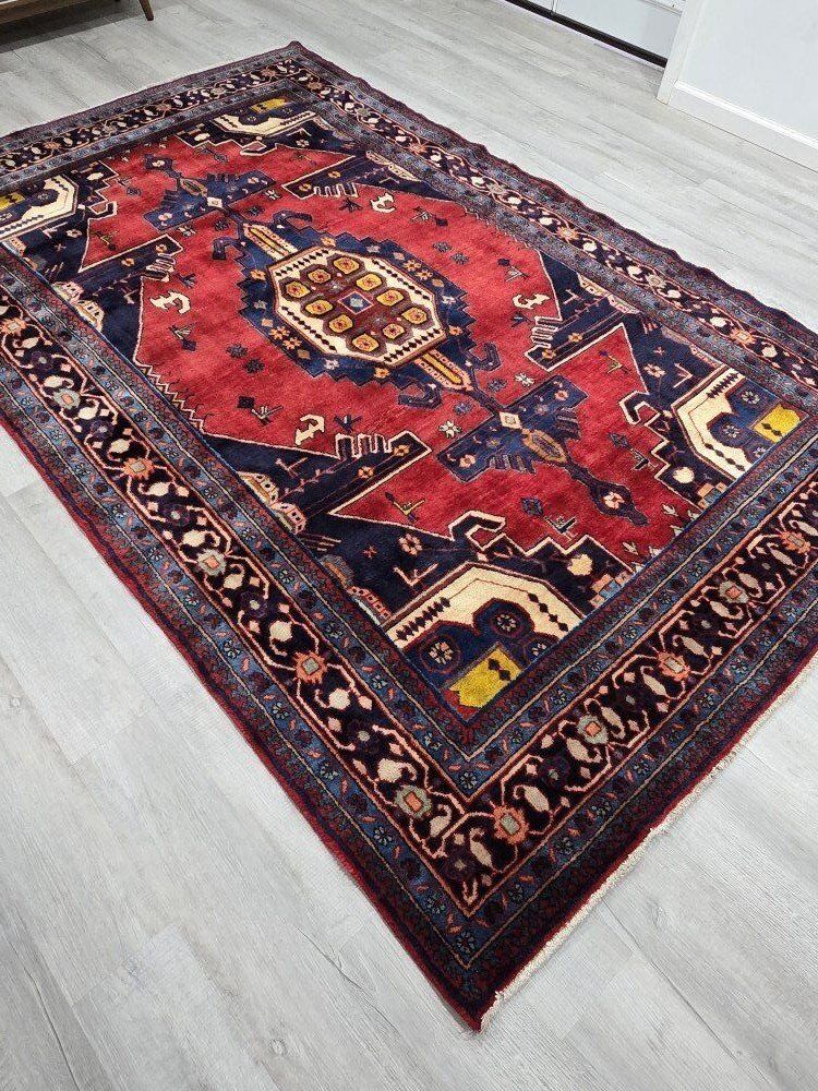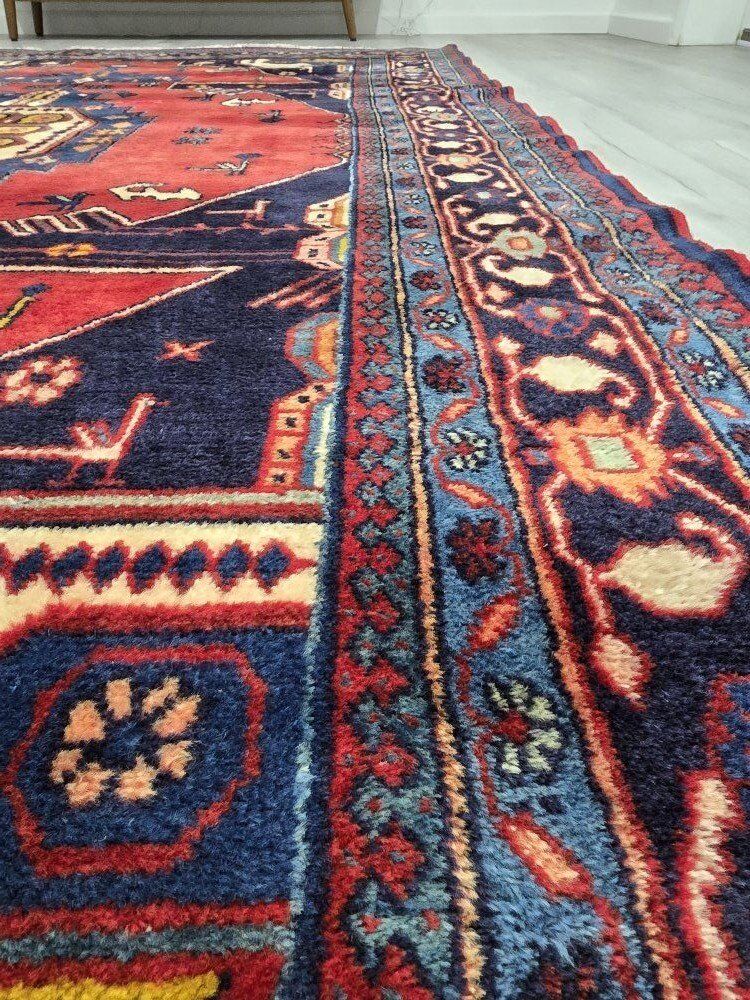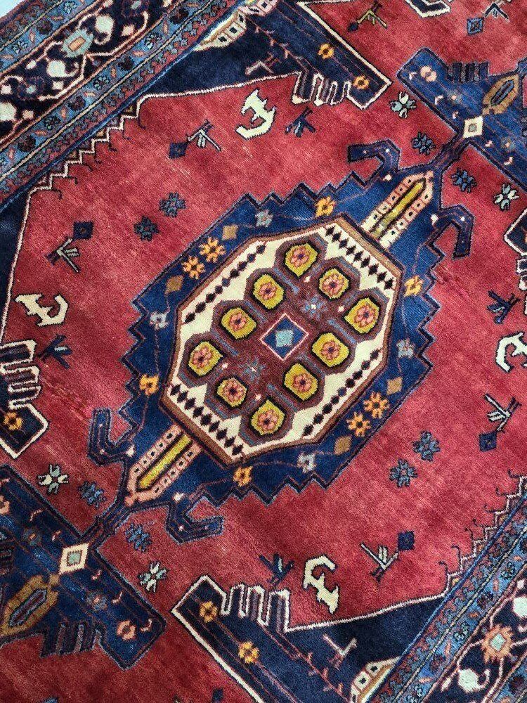 ZelleThis rug features a bold, saturated red field contrasted by deep indigo-blue geometry and crisp ivory accents. At the center sits a dramatic medallion, richly layered with jewel-toned details in golden yellow, turquoise, soft coral. and sky blue. Tribal motifs radiate outward across the field, giving the rug a powerful, architectural presence while still feeling balanced. The wide navy border is packed with repeating floral and vine forms. Overall, a rug that's bold, graphic, and timeless.