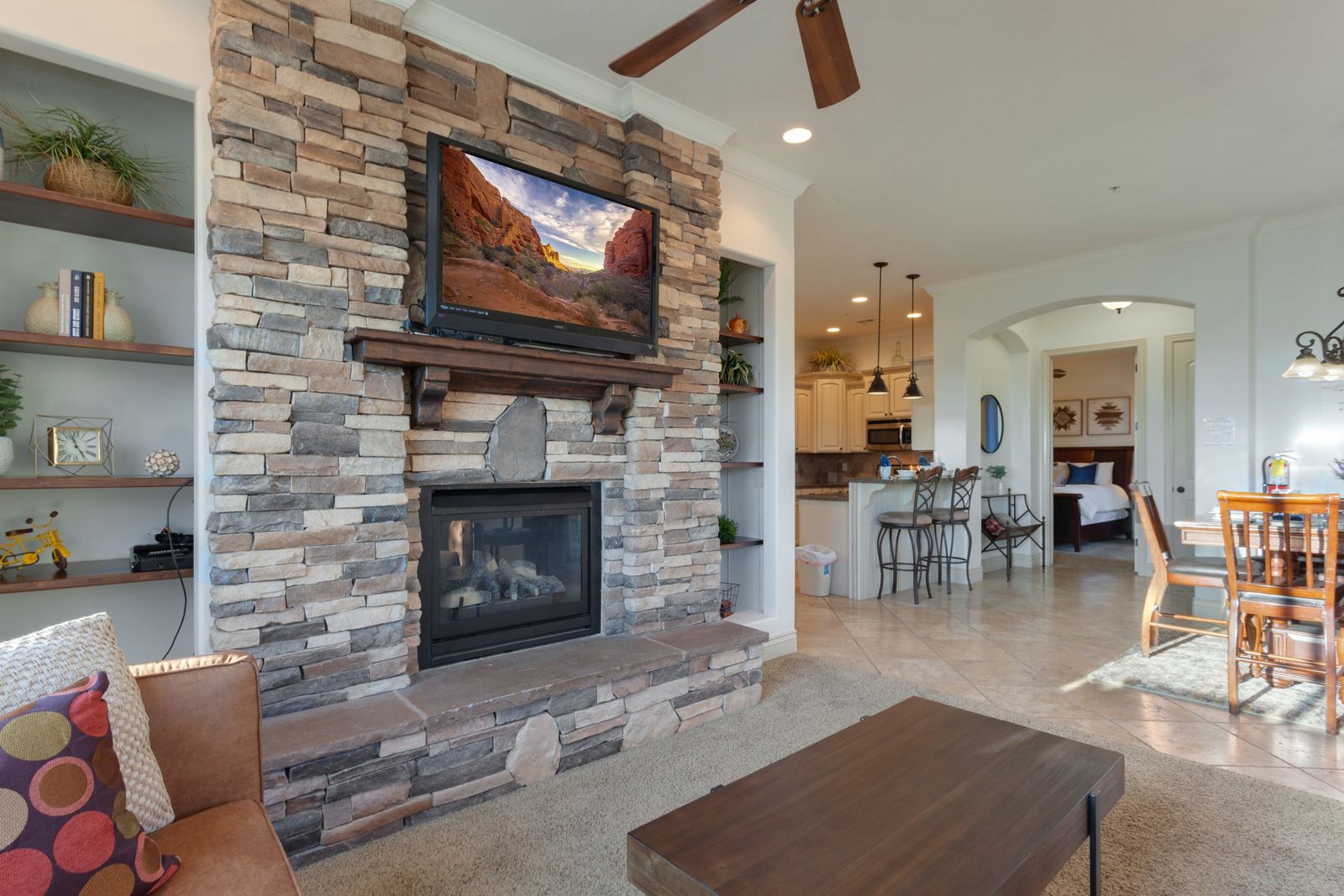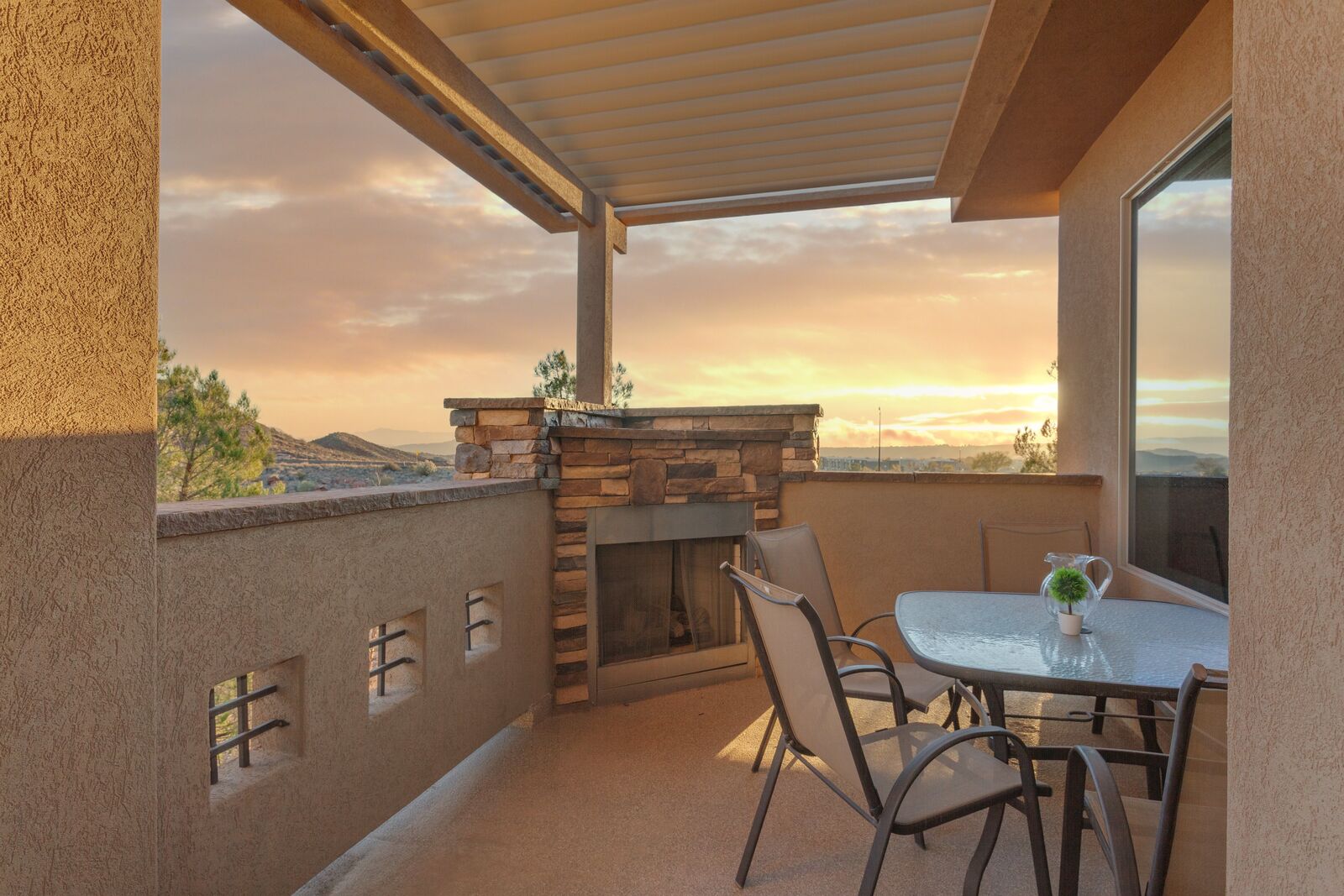 This elegant 3 bedroom/2 bathroom condo can comfortably accommodate 8 people, with sleeping arrangements for 10. This condo is an end-unit, giving you the privacy and peace, and quiet you need. It has a spacious, covered patio with an outdoor fireplace, perfect for a relaxing night in Southern Utah. Right off the entryway is the master bedroom, equipped with a soaker tub, double vanity, and private access to the front balcony. Outside the master bedroom is the dining room and living room, with a sliding glass door to the patio. With this open-style floor plan, you can always stay close to your loved ones. Down the hall from the kitchen are two additional bedrooms and a shared bathroom. Watch a movie with your family on one of the 3 smart TV's located in this house, or play a game on the Mini-PC Game Console. During your stay at Coral Cove, you can enjoy Indoor/Outdoor pools and hot tubs, tennis and basketball courts, as well as a fitness center. Take a walk on some of the trails located right behind the condo, or play a game of golf across the street at one of the many golf courses in the area. With so many things to do and explore, Coral Cove at Coral Springs is sure to be a favorite vacation destination for years to come!