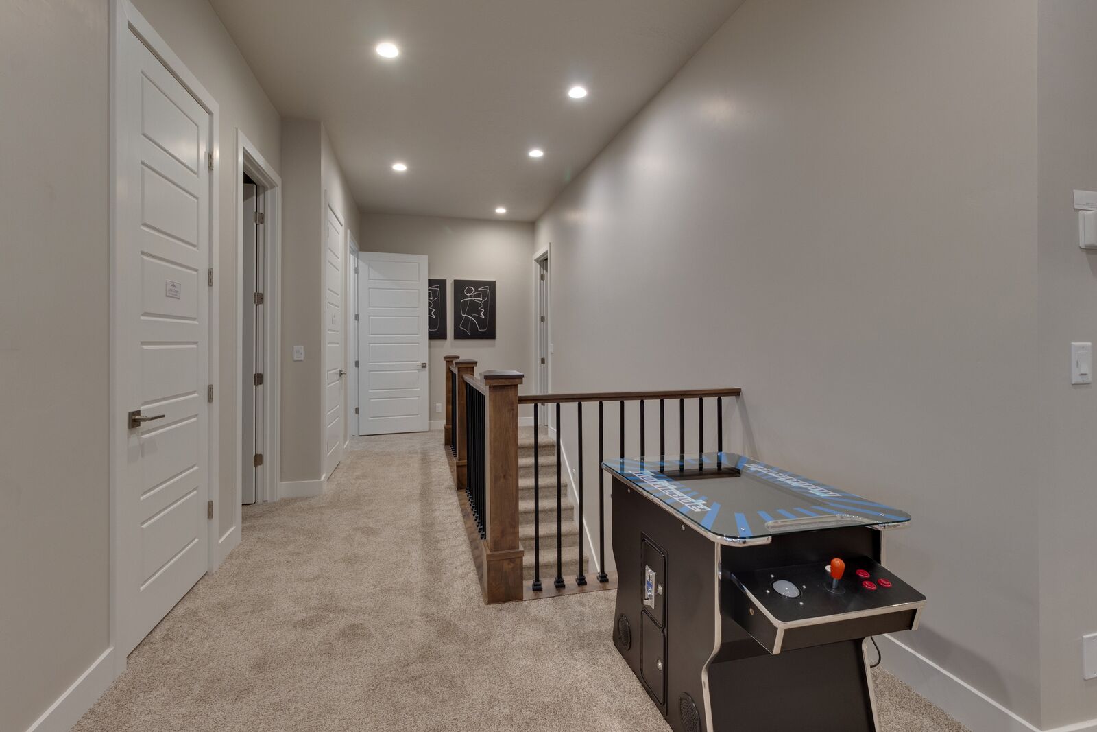 This stunning home features five bedrooms and five and a half bathrooms and can sleep up to 17 people comfortably. The master bedroom on the main level has a king bed, smart tv, and quick patio access, and is also connected to an ensuite bathroom with a double vanity, walk-in shower, and bathtub. Just at the top of the stairs, you'll find another bedroom with a king bed and smart tv, which is also connected to an ensuite bathroom, featuring a walk-in shower. Across the hall, you'll find the upstairs master which has a king bed, smart tv, and balcony access. This bedroom is also connected to a bathroom with a double vanity and a walk-in shower. Just across the loft, you'll see two bunkrooms. The first holds a twin-full-queen bunkbed and smart TV, with its own ensuite bathroom with a walk-in shower. The final bunkroom holds 2 triple twin bunk beds and has access to a shared bathroom in the loft.