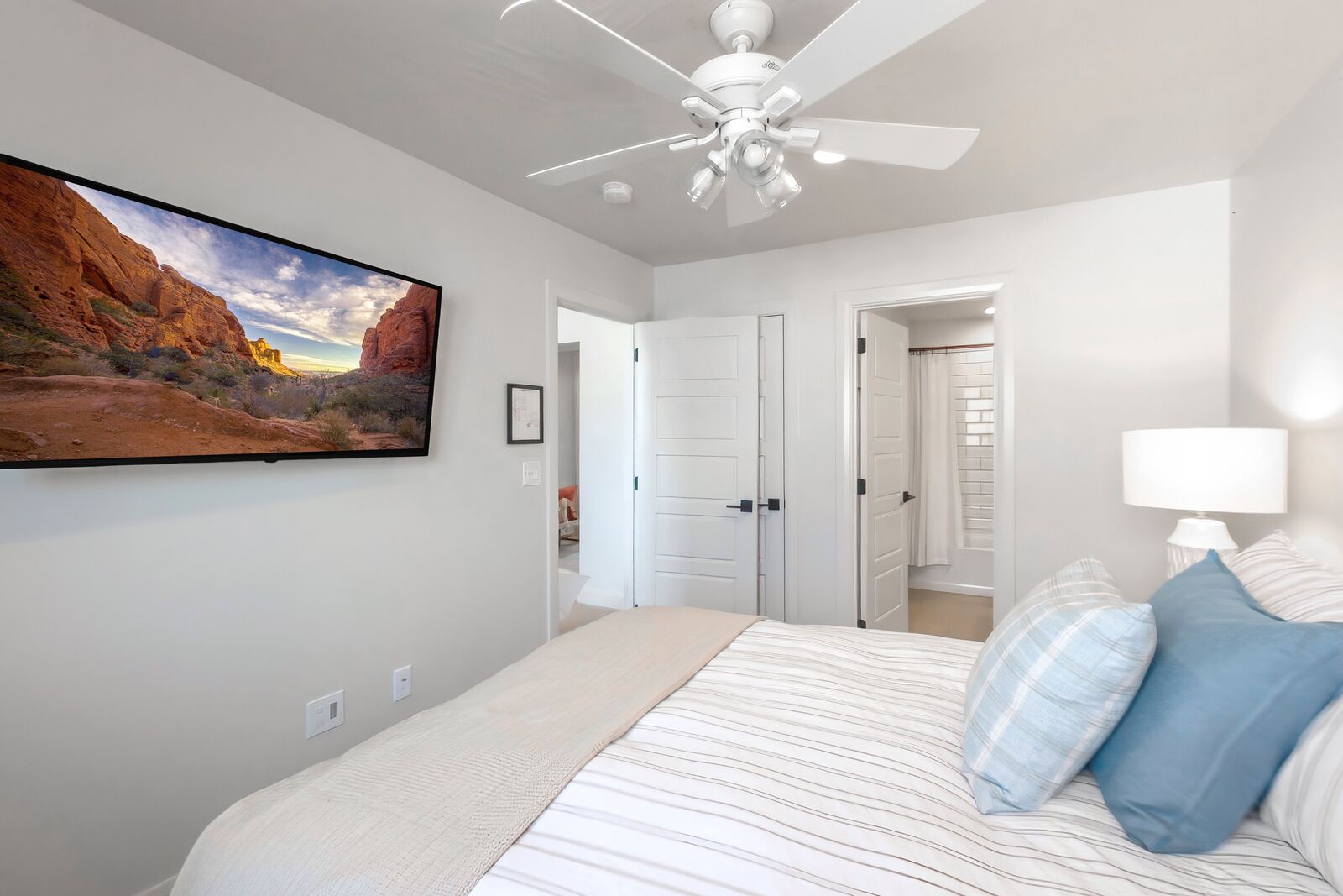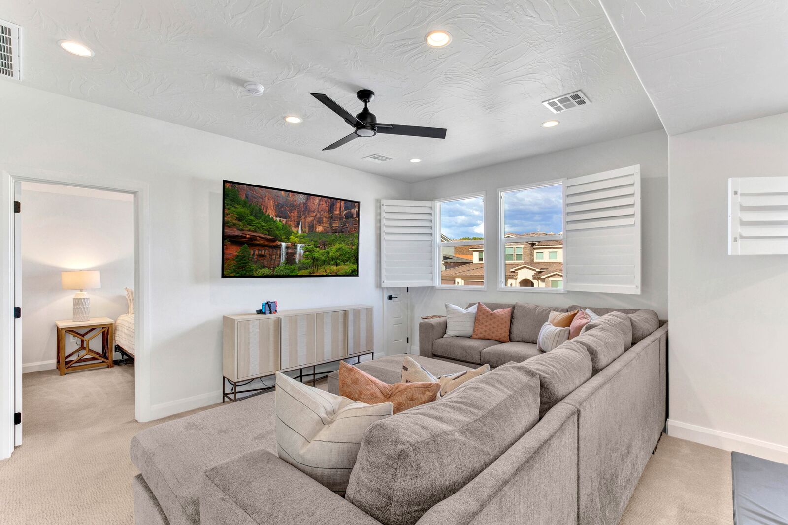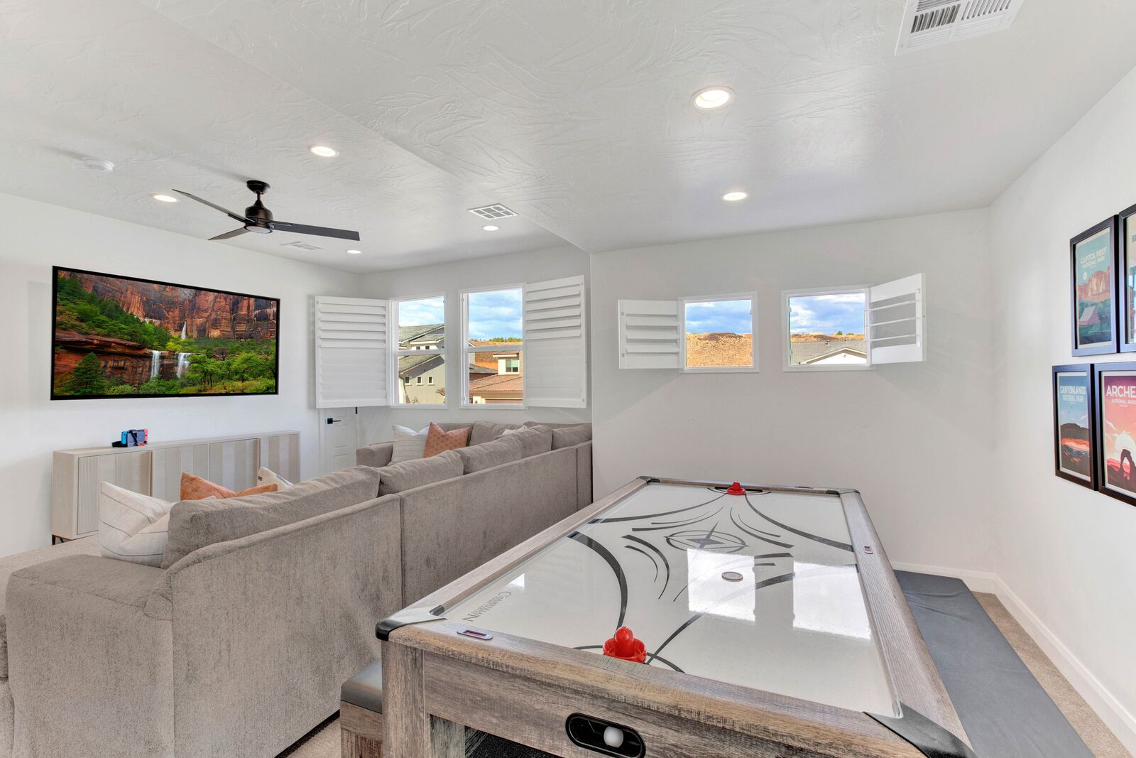 “Bliss: to reach a state of perfect happiness, typically so as to be oblivious of everything else. Great Joy.” That’s what you will find when you stay in this beautiful new home at Paseos in Sienna Hills. Tucked into a quiet neighborhood, just a few minutes from I-15 in Washington, it is only a short drive to restaurants, shops, and other amenities while having the benefit of feeling secluded and peaceful. You may even recognize the home from the 2022 St. George Parade of Homes! This expertly designed home features a ping pong/air-hockey/game table combo, a large private hot tub, a fully stocked kitchen, and OLED and other LG Smart TVs. Perfect for a family getaway with fun activities for the kids.