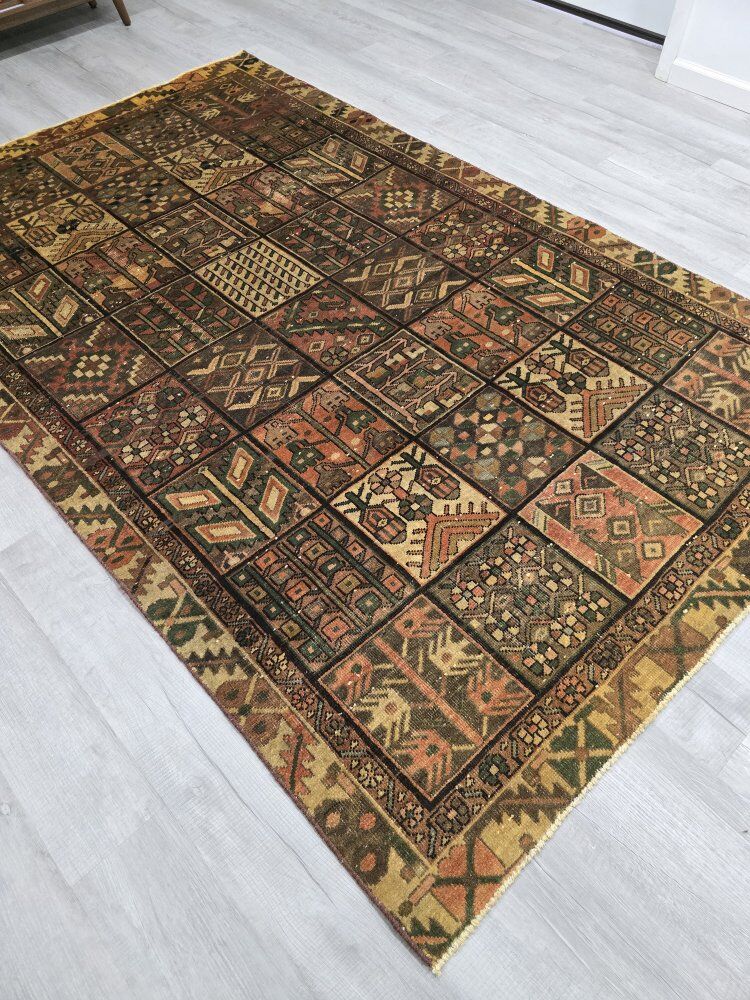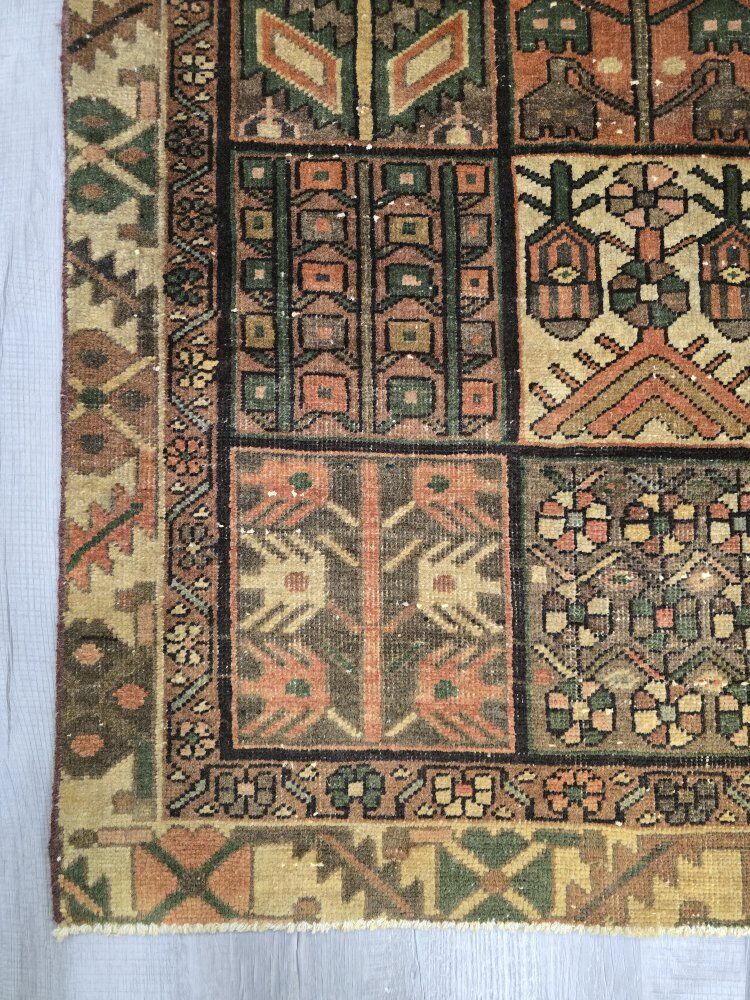ZelleThis gorgeous Persian Bakhtiari rug showcases a classic garden-panel ("khesti") design, arranged in a grid of small squares filled with richly detailed motifs such as stylized trees, geometric diamonds, tribal emblems, and charming animal figures. Its earthy palette blends deep russet, olive green, golden yellow, and soft came tones, giving the piece a warm, heritage-rich character. The wool pile shows beautifully aged variation that adds depth and authenticity. Visually dynamic yet balanced, this rug brings an inviting, old-world artistry to any space.